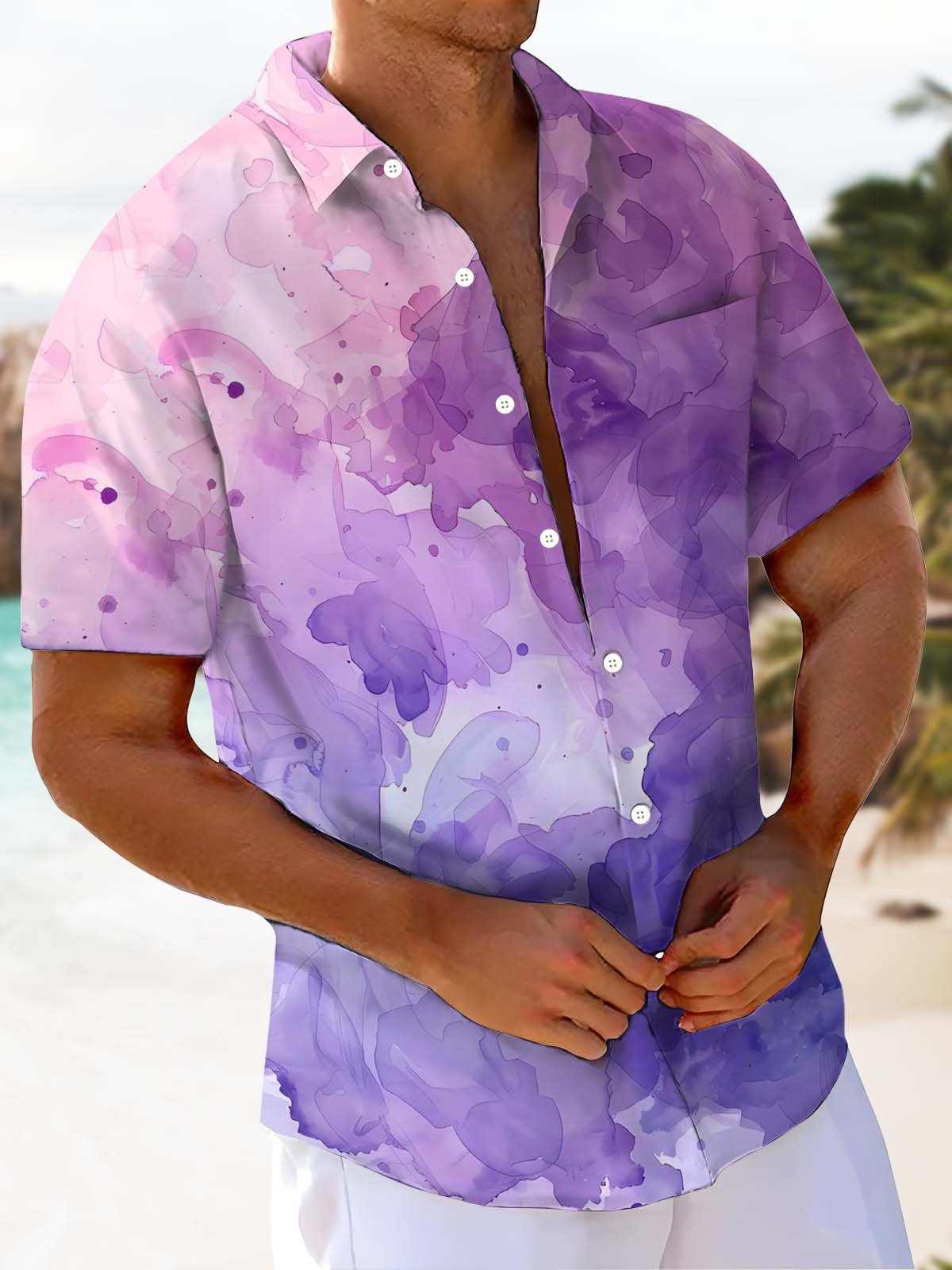 Alohadaddy® Casual Abstract Watercolor Art Print Chest Pocket Men's Stretch Short Sleeve Shirt Big & Tall