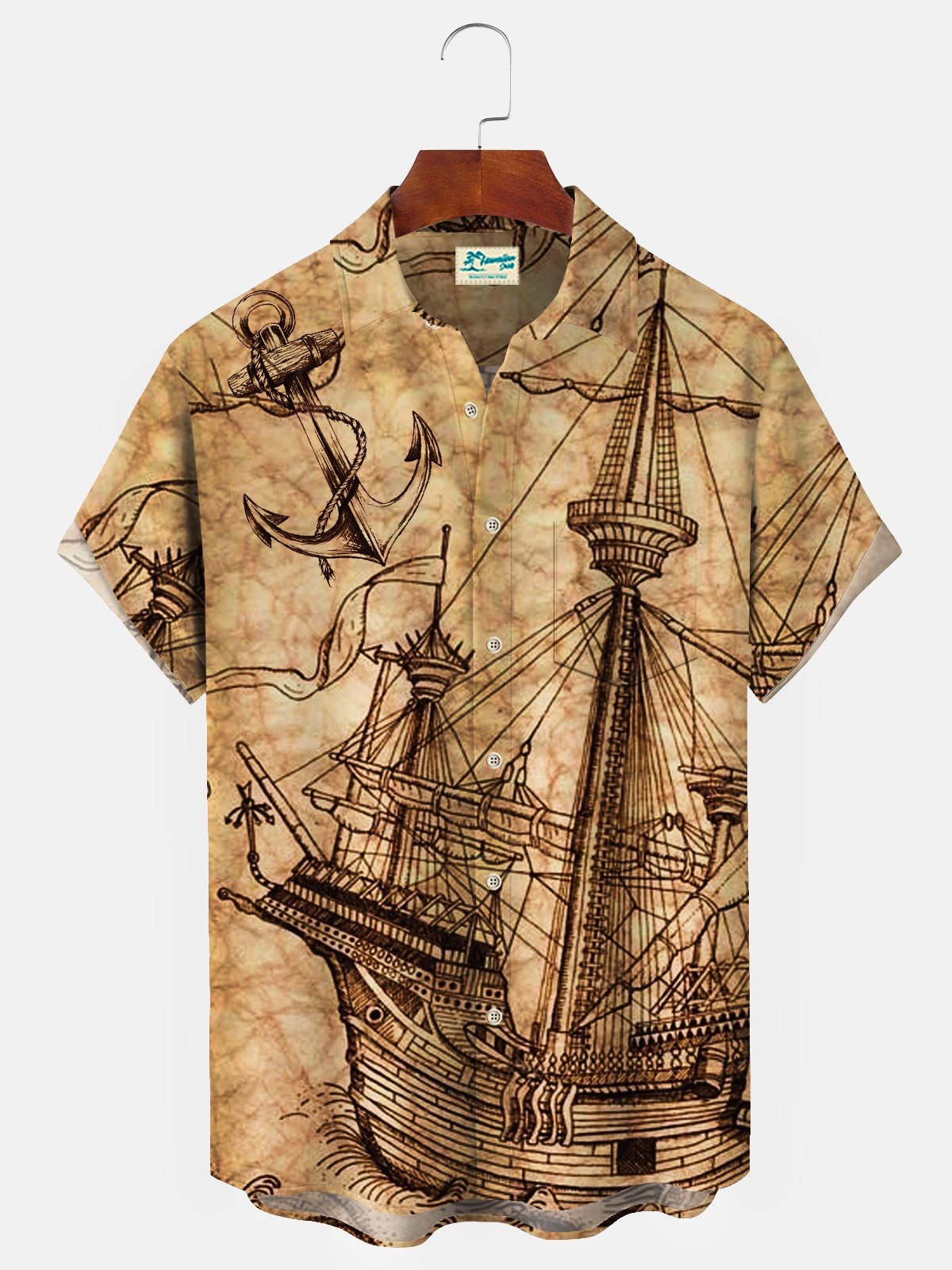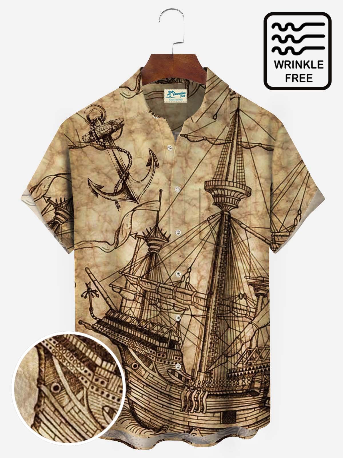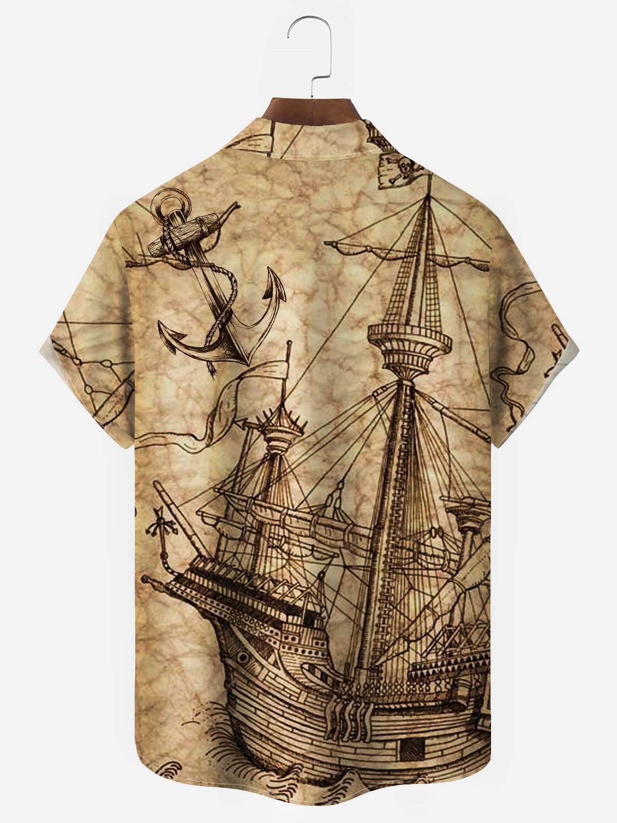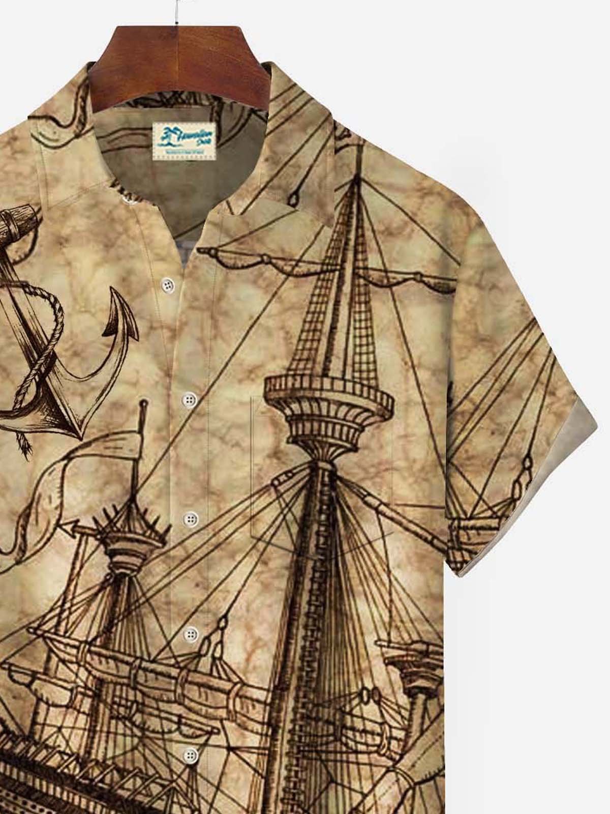 Alohadaddy Vintage Nautical Map Khaki Men's Hawaiian Shirts Wrinkle Free Seersucker Easy Care Pocket Camp Shirts