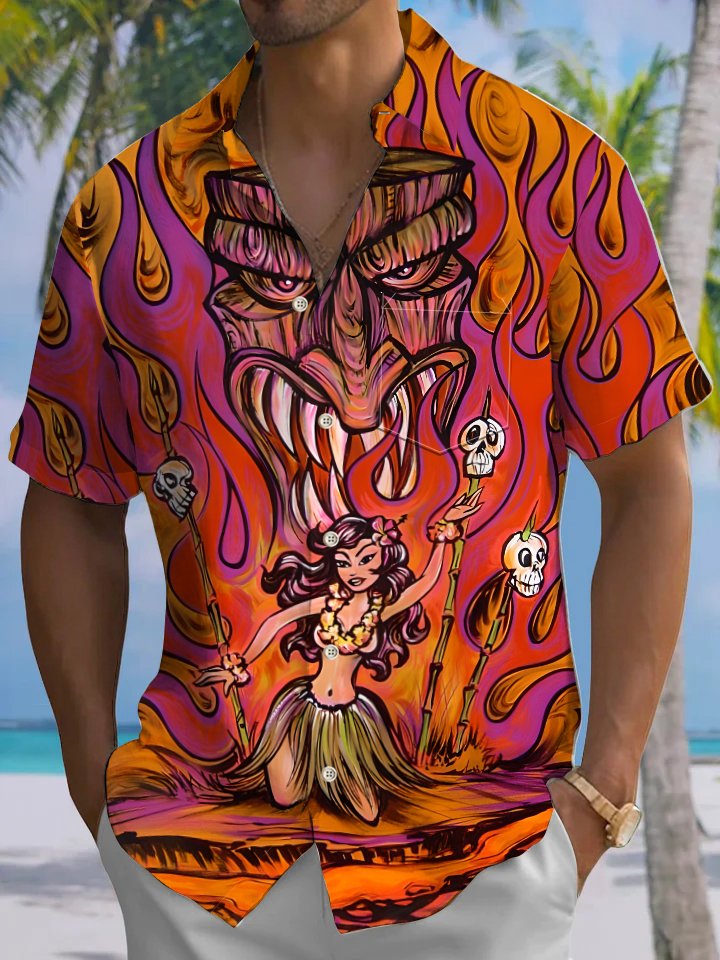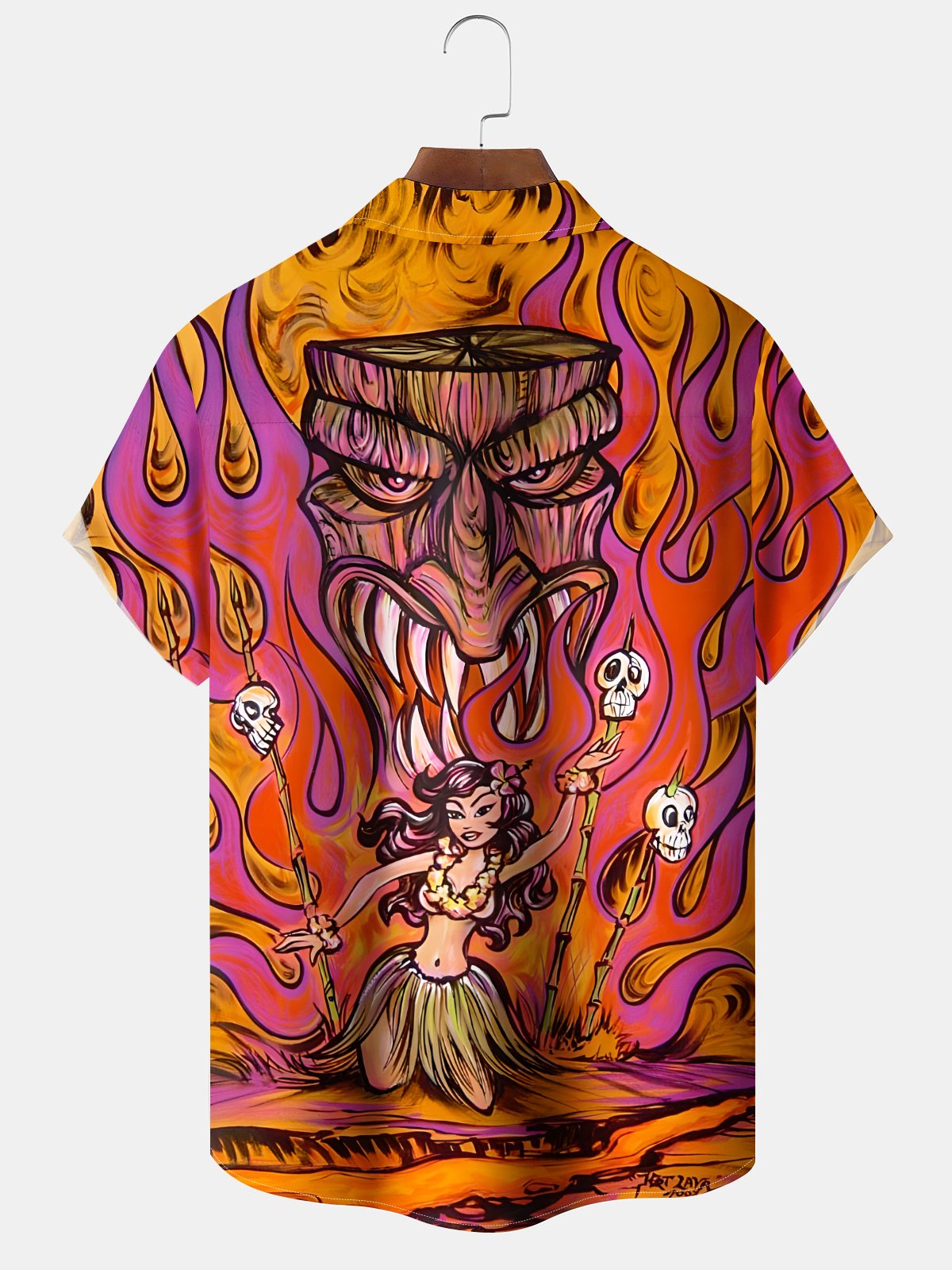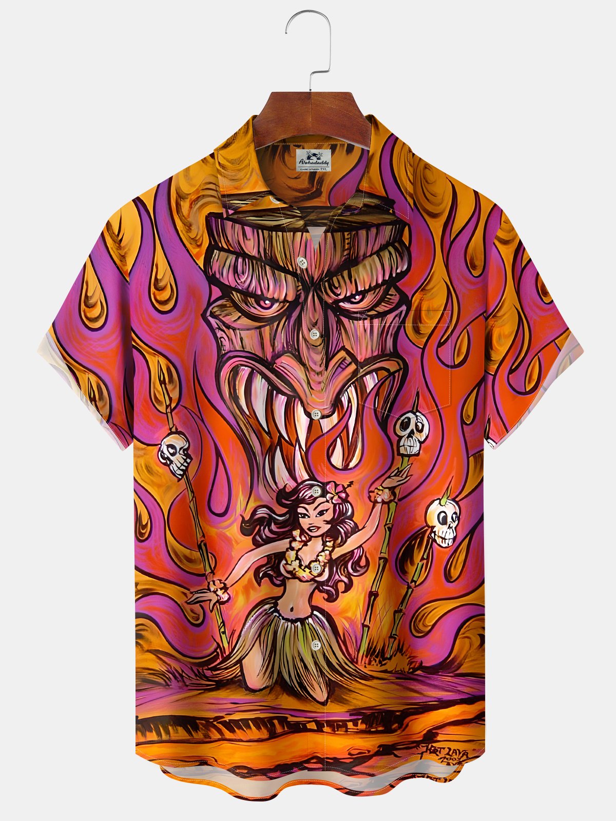 Alohadaddy® Vintage Mask Flames Printed Art Pockets Moisture Wicking Hawaiian Shirt Big & Tall
