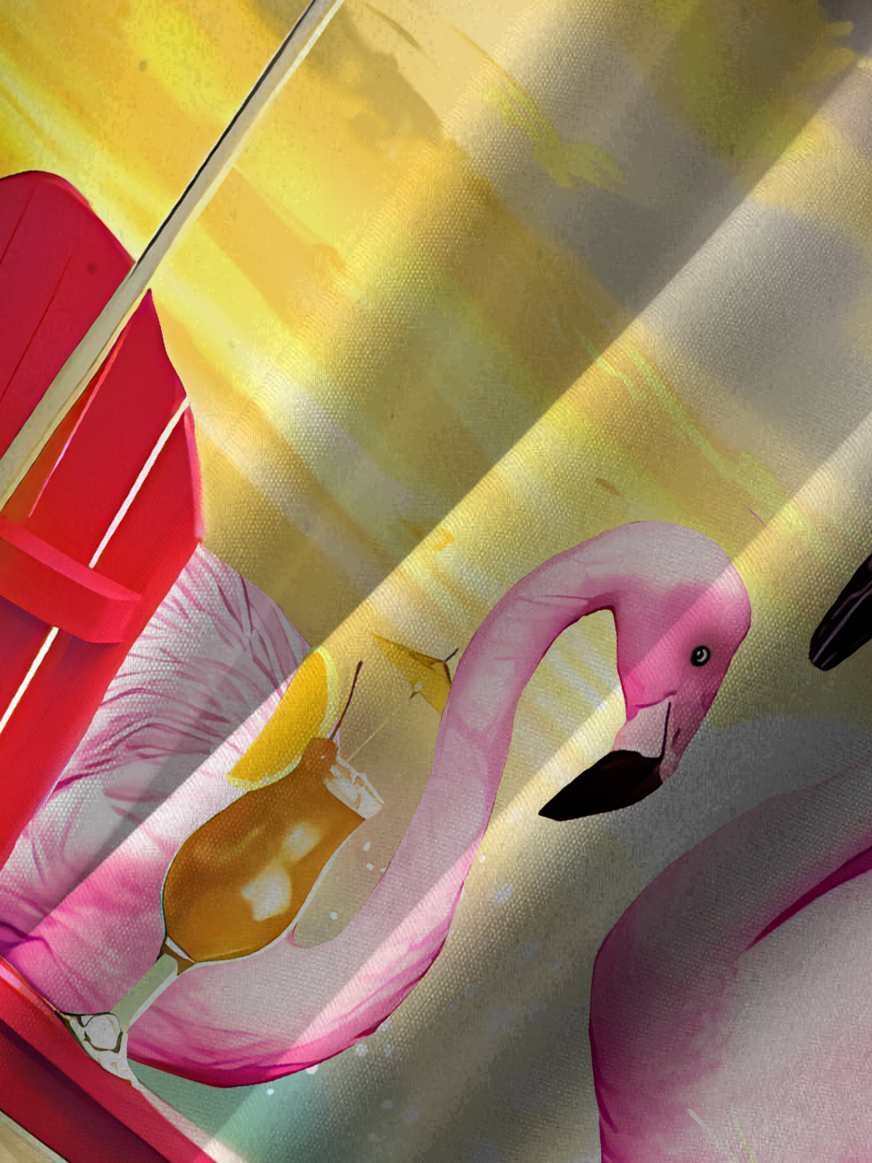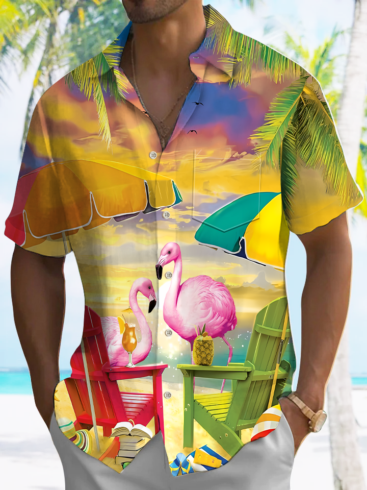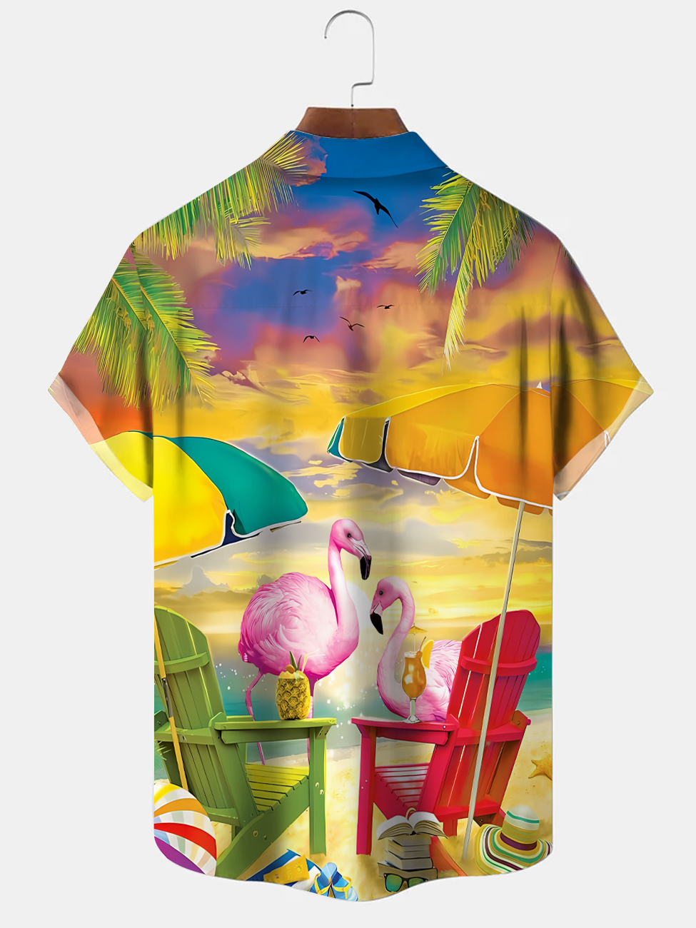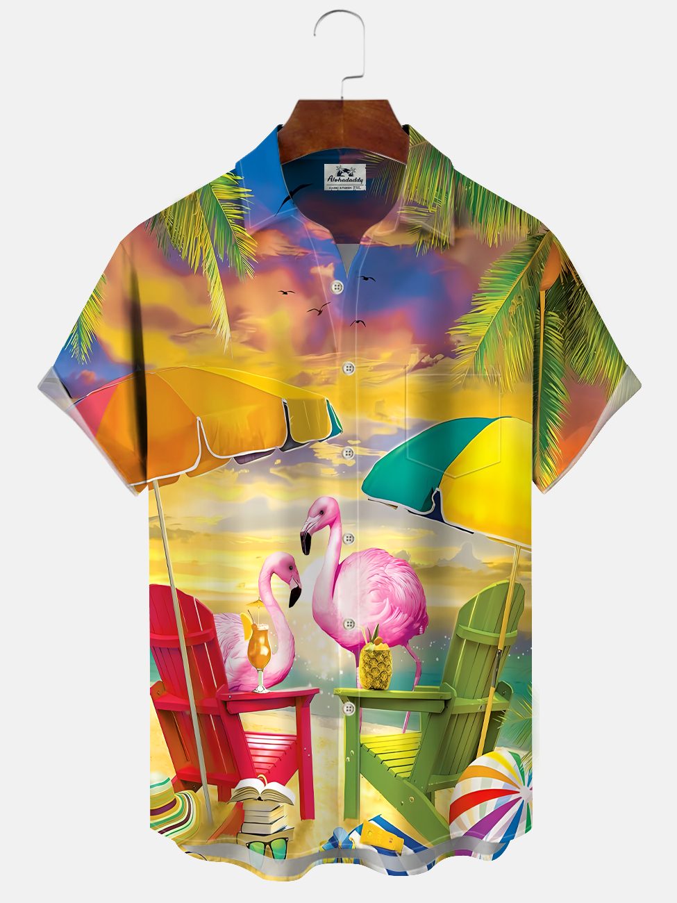 Alohadaddy Beach Coconut Tree Flamingo Button Pocket Casual Short Sleeve Shirt