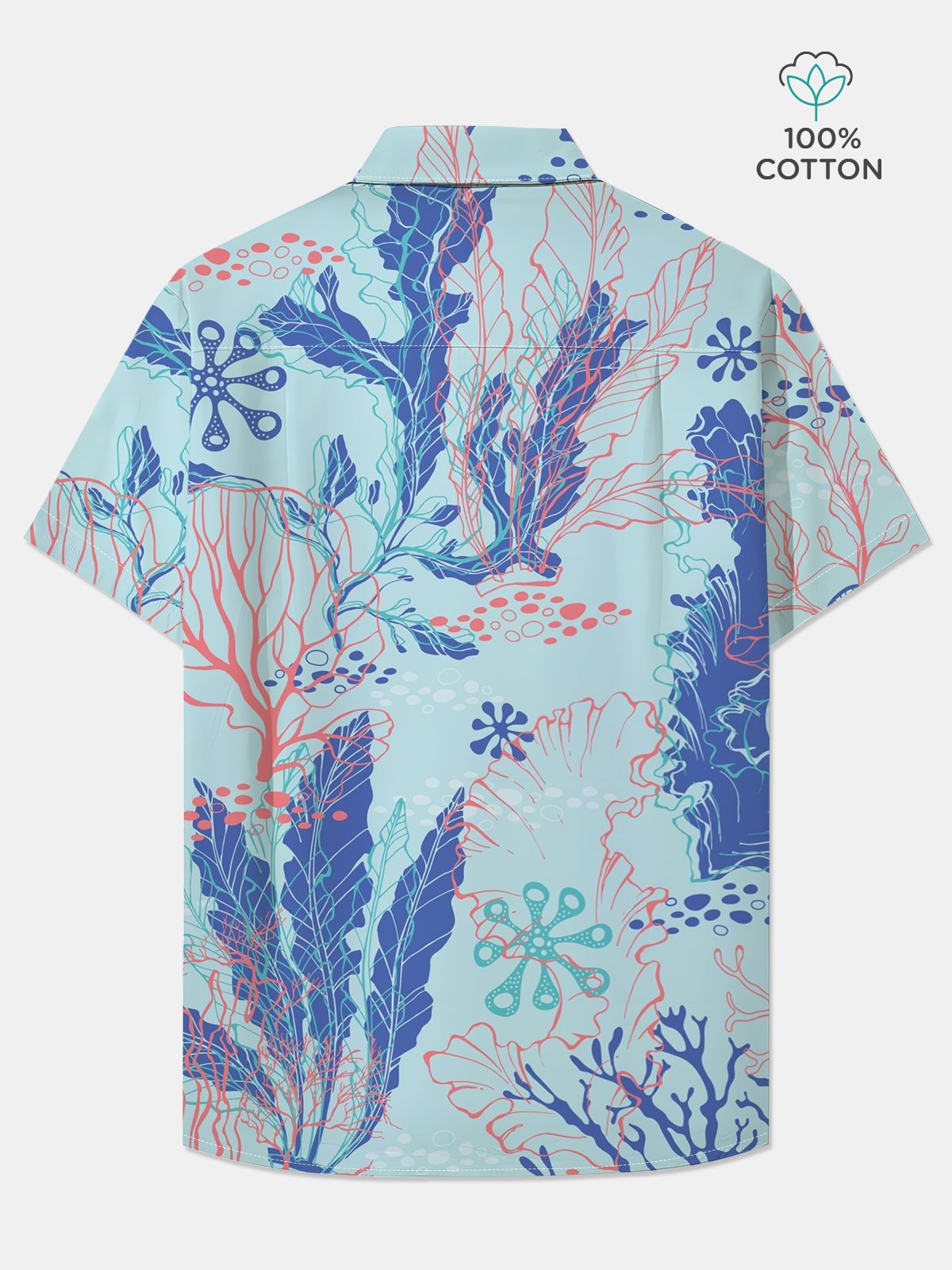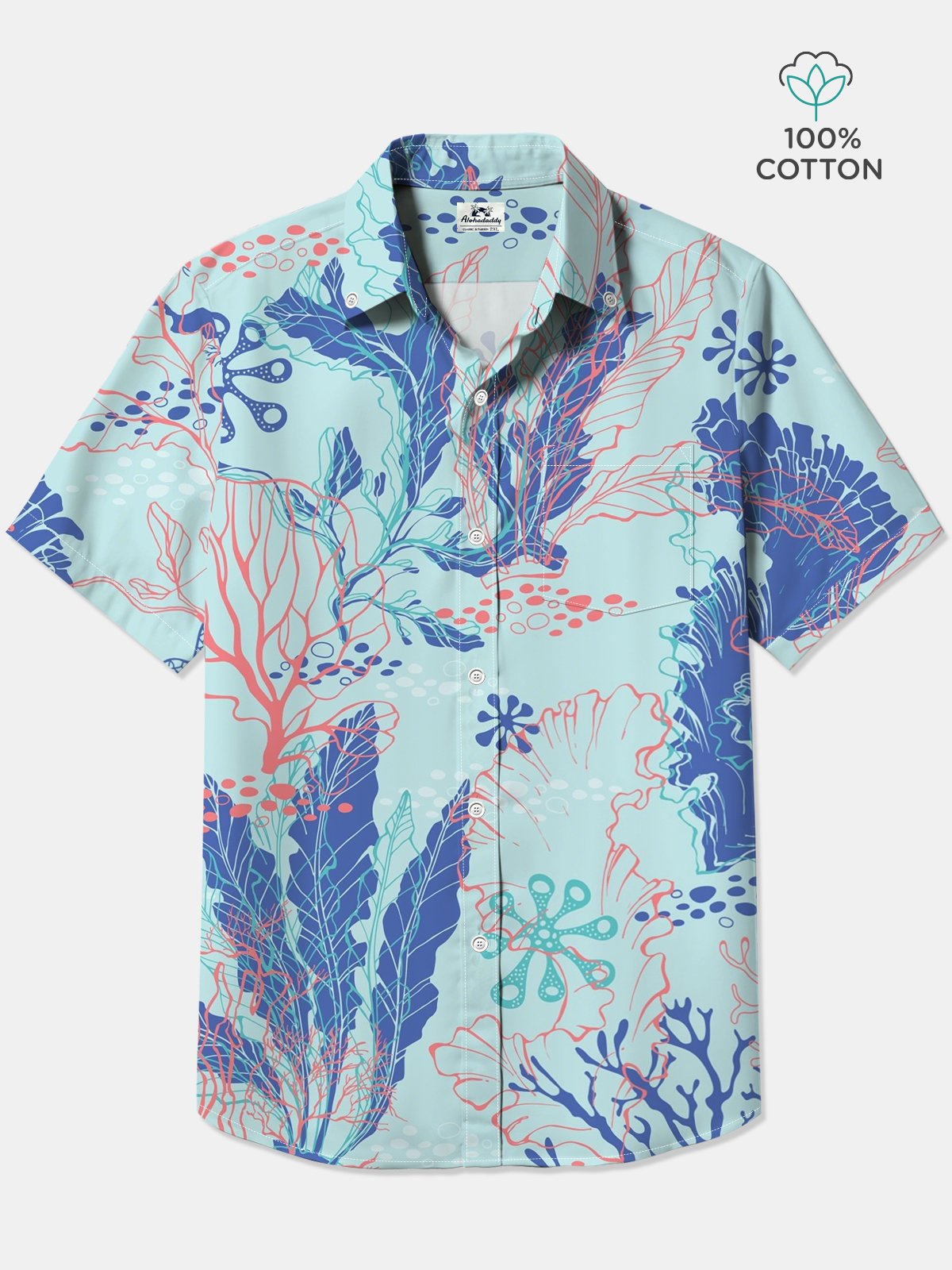 Alohadaddy Cotton Ocean Coral Art Print Moisture Wicking Chest Pocket Cardigan Hawaiian Oversized Short Sleeve Shirt
