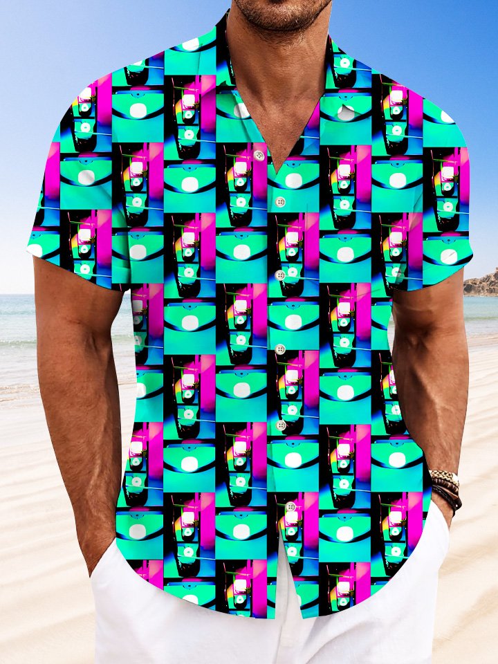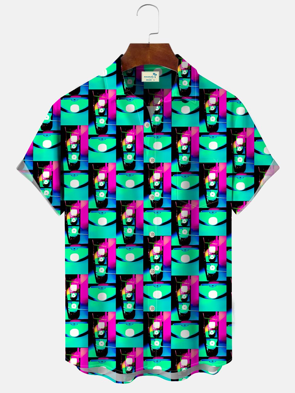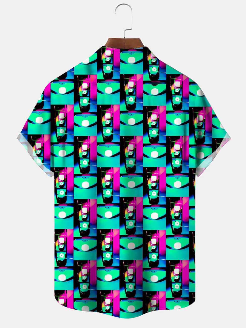Alohadaddy Geometric Pattern Contrast Color Pocket Button Casual Short Sleeve Shirt