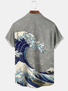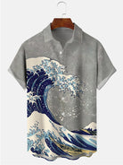 Alohadaddy Mens Japanese Ukiyoe Wave Print Casual Breathable Chest Pocket Short Sleeve Hawaiian Shirts