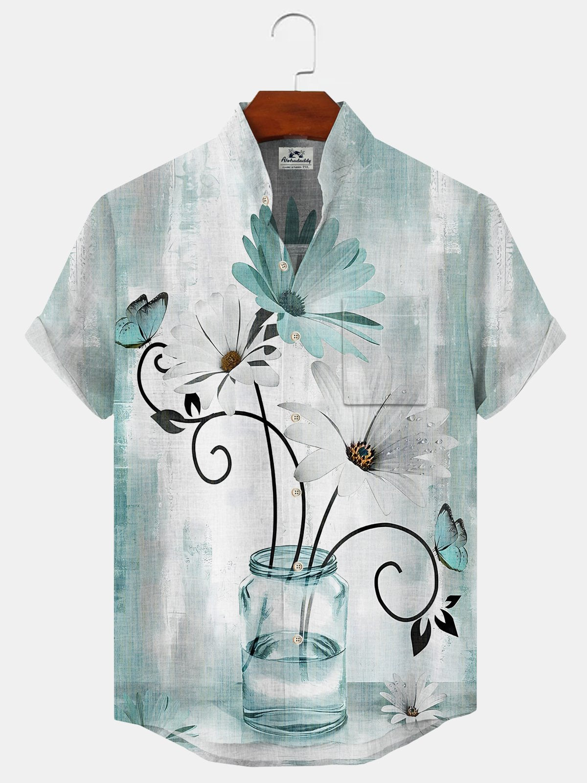 Alohadaddy Plant Flower Button Pocket Casual Short Sleeve Stand Collar Shirt