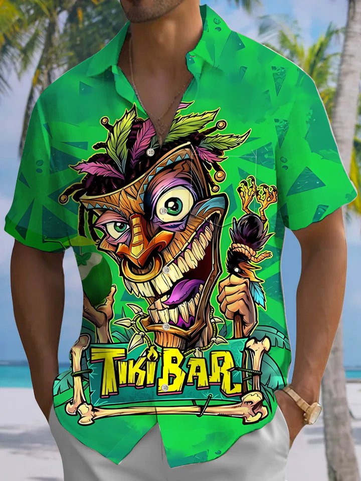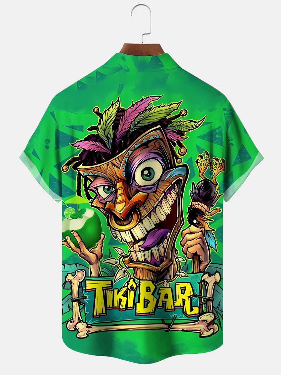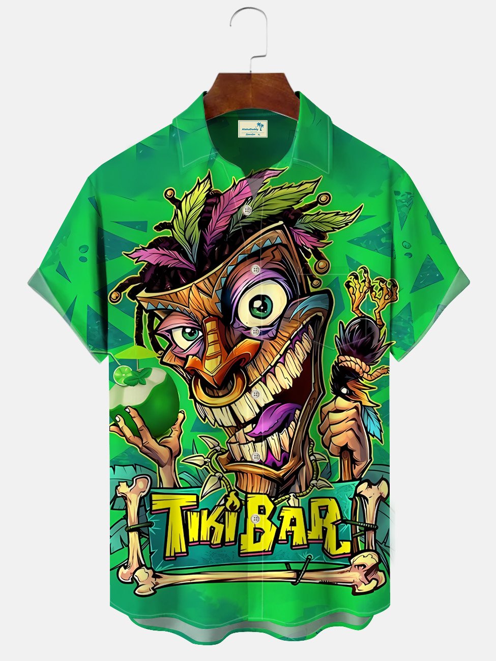 Alohadaddy Tiki Totem Coconut Tree Beach Button Pocket Casual Short Sleeve Shirt