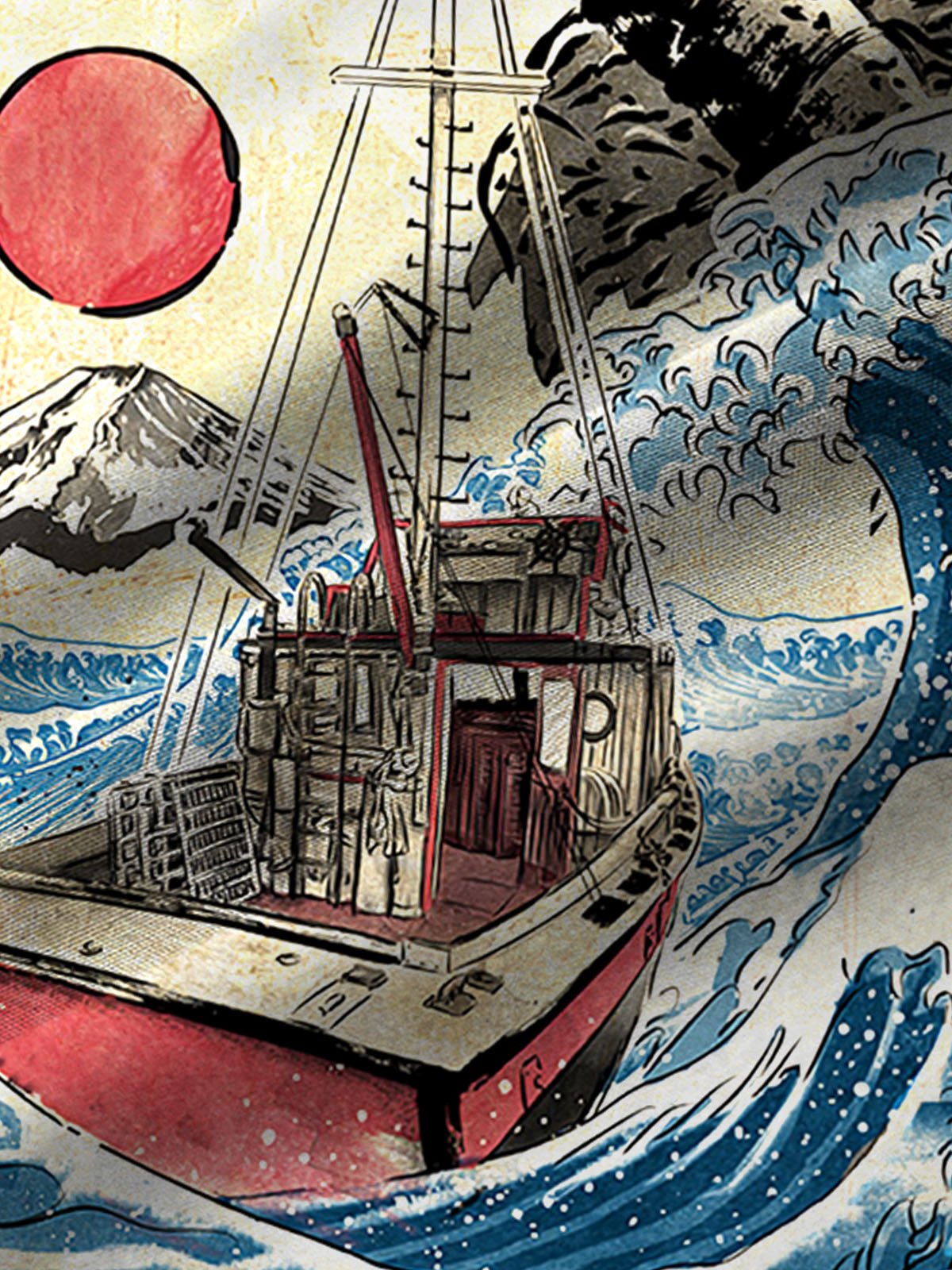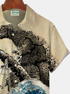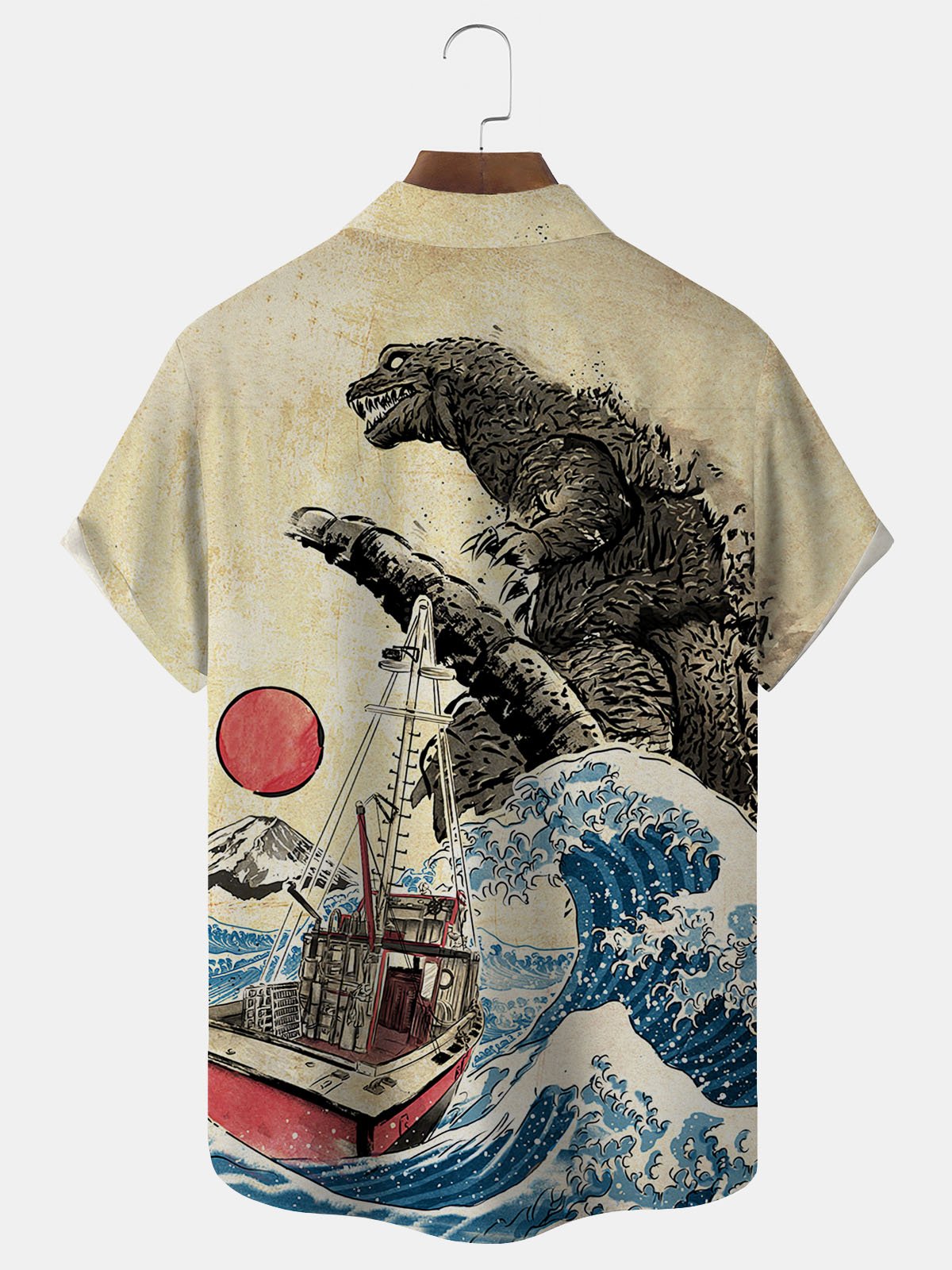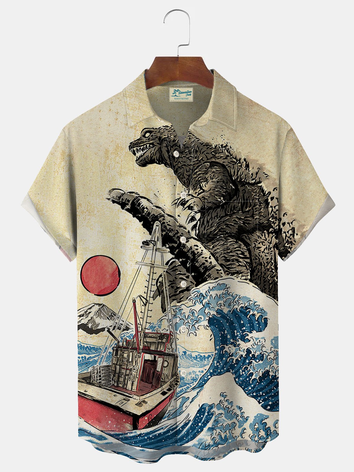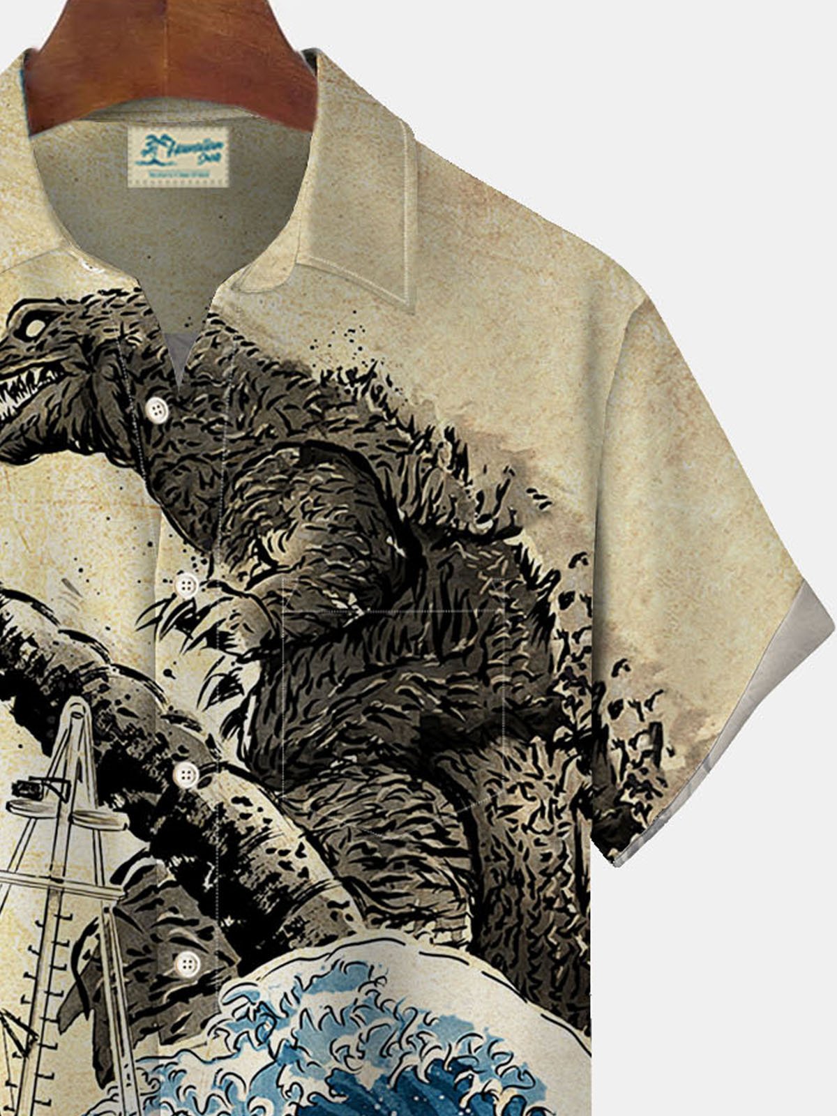 Alohadaddy Ukiyo-e Godzilla Print Men's Button Pocket Short Sleeve Shirt