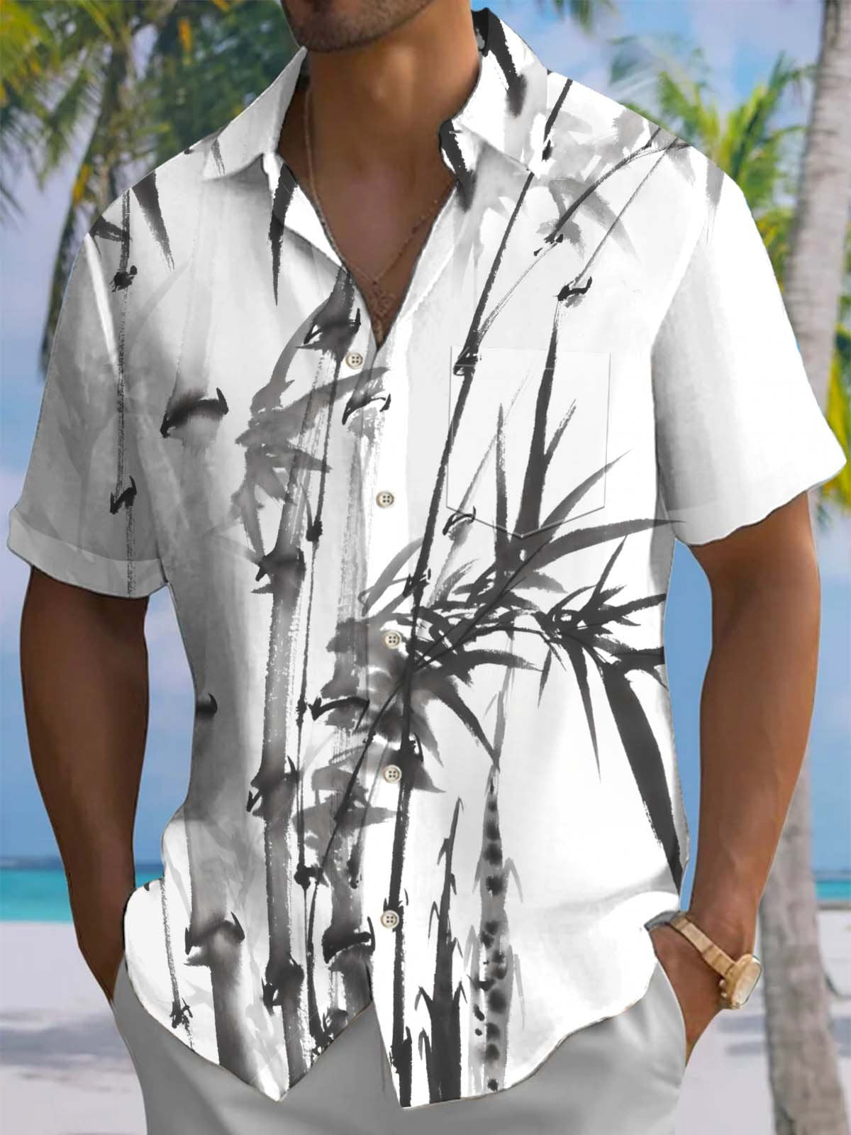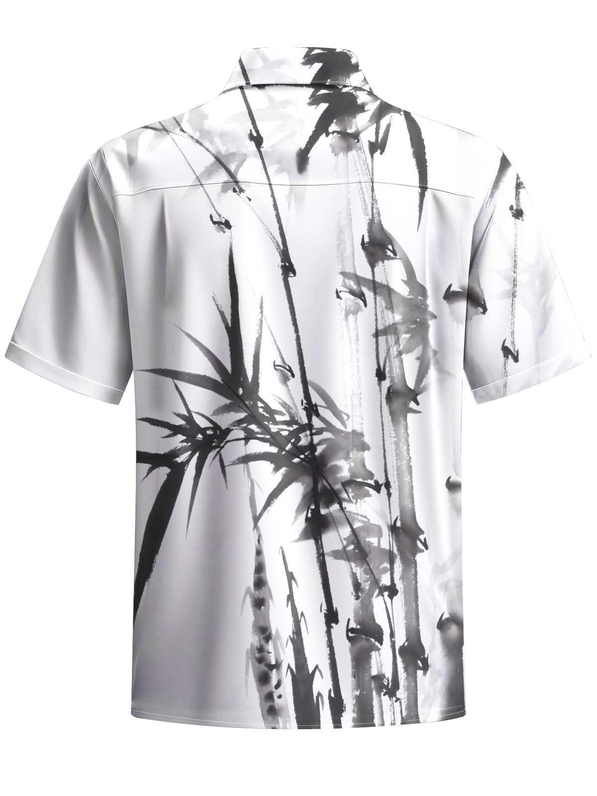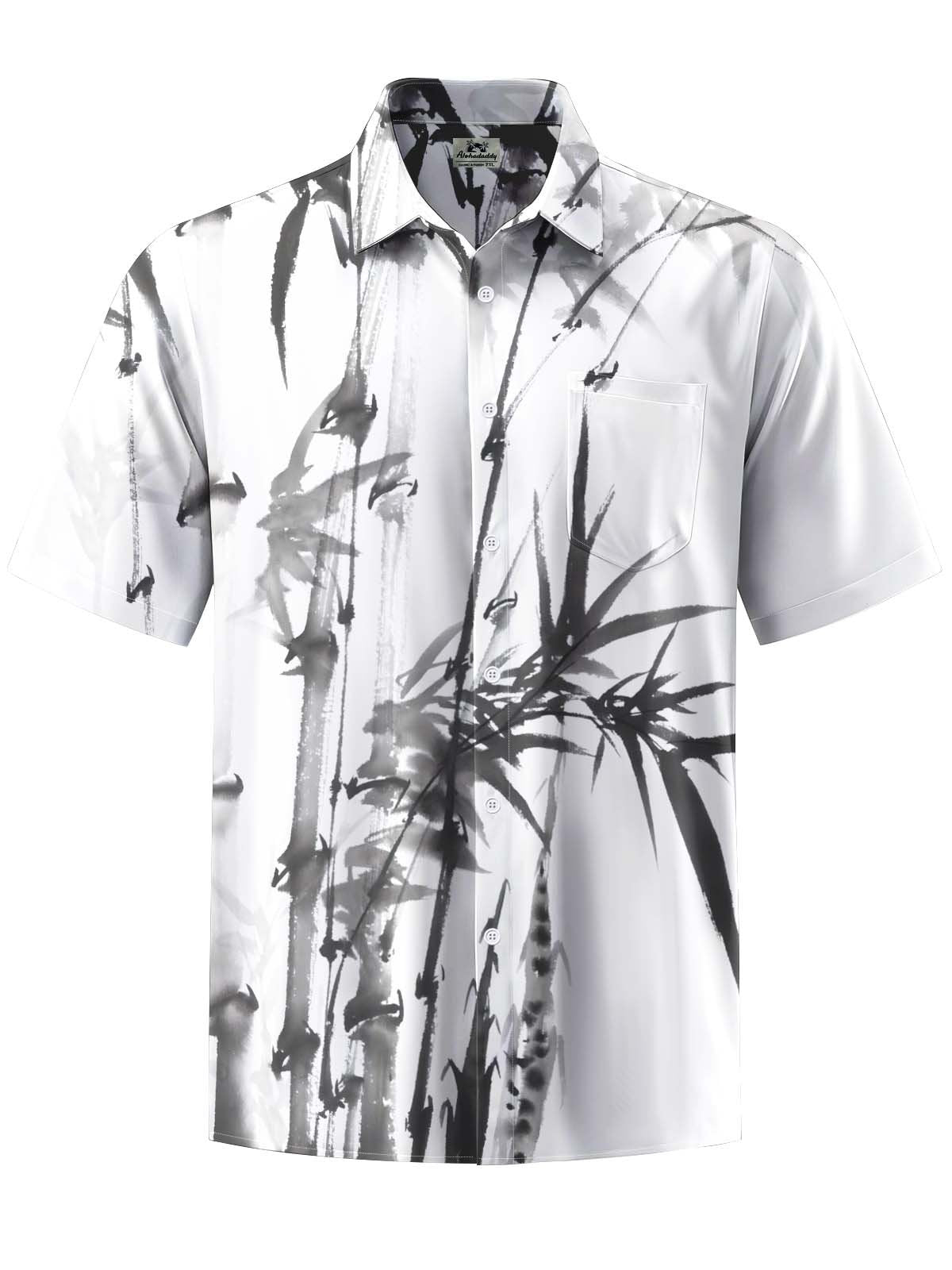Alohadaddy® Casual Ink Painting Bamboo Print Art Chest Pocket Stretch Men's Short Sleeve Shirt Big & Tall