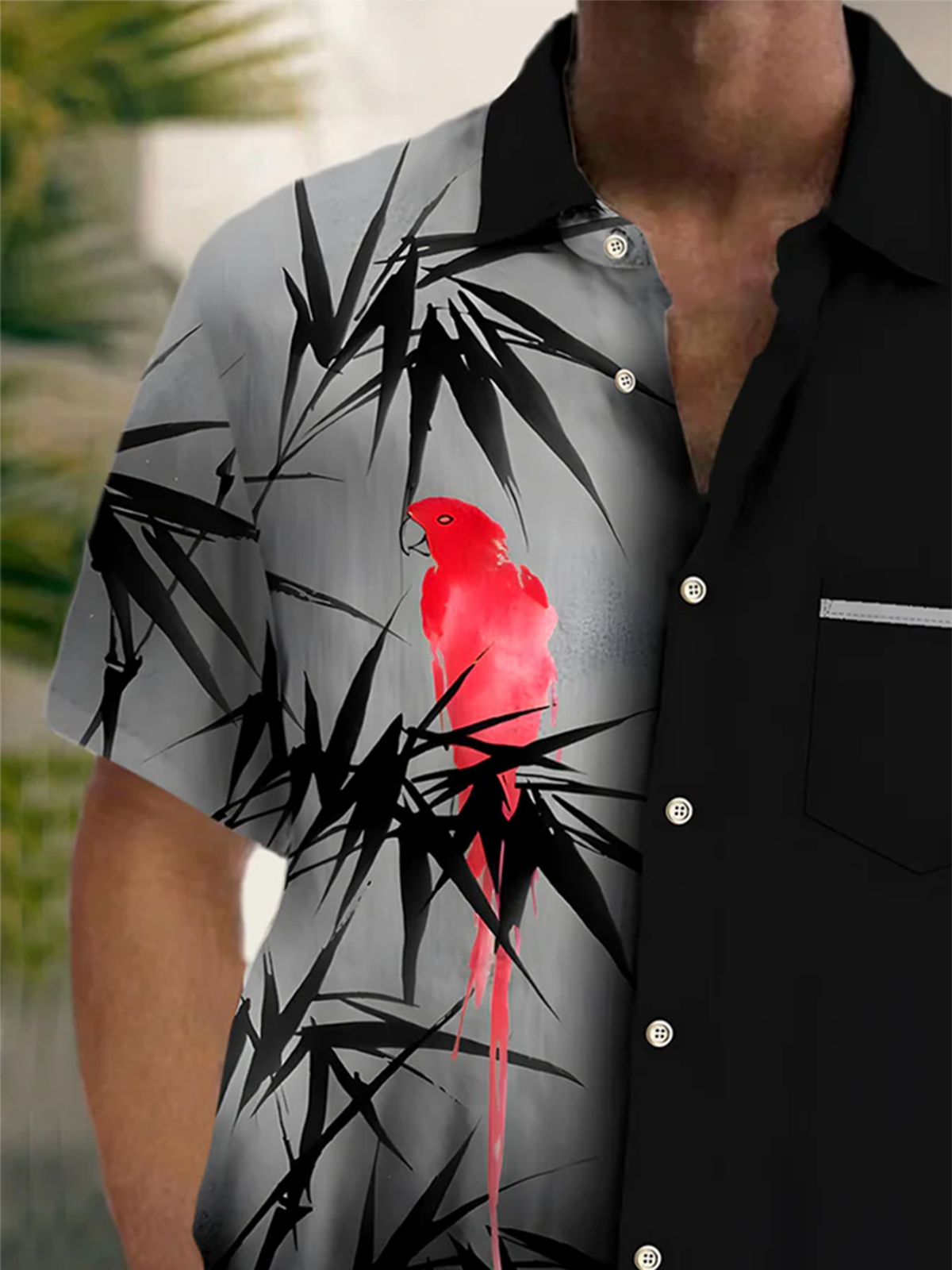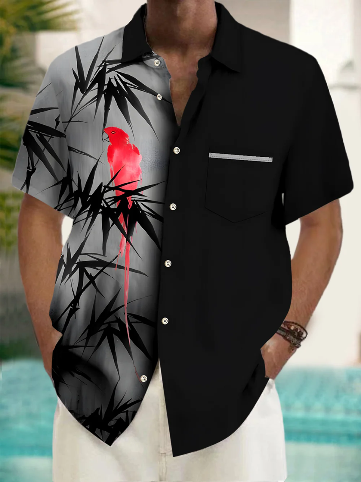 Alohadaddy® Casual Parrot Contrast Bamboo Art Print Chest Pocket Mens Short Sleeve Shirt Big & Tall