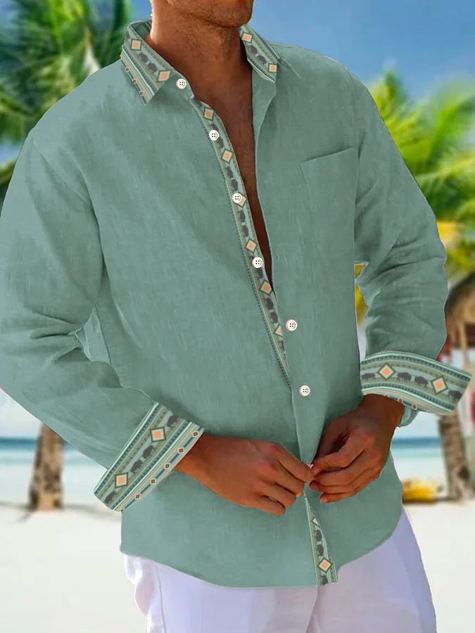Alohadaddy Basic Men's Western Ethnic Patchwork Print Chest Pocket Stretch Long Sleeve Shirt Big Tall