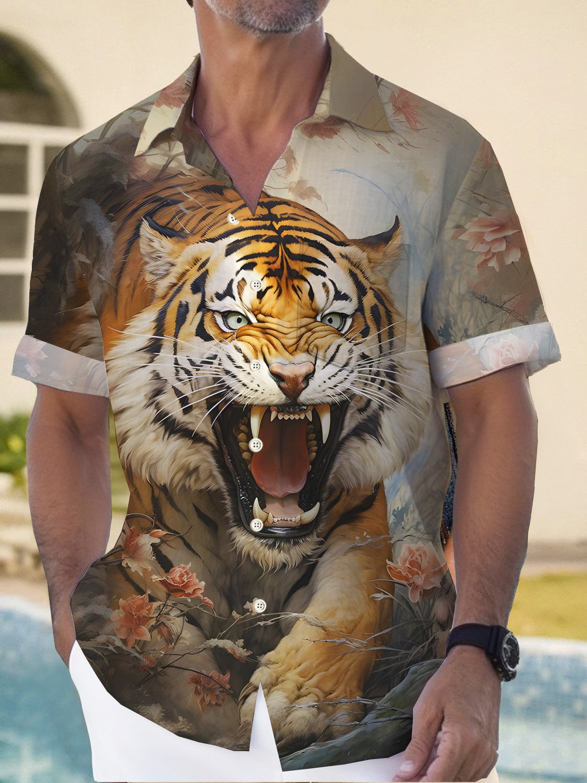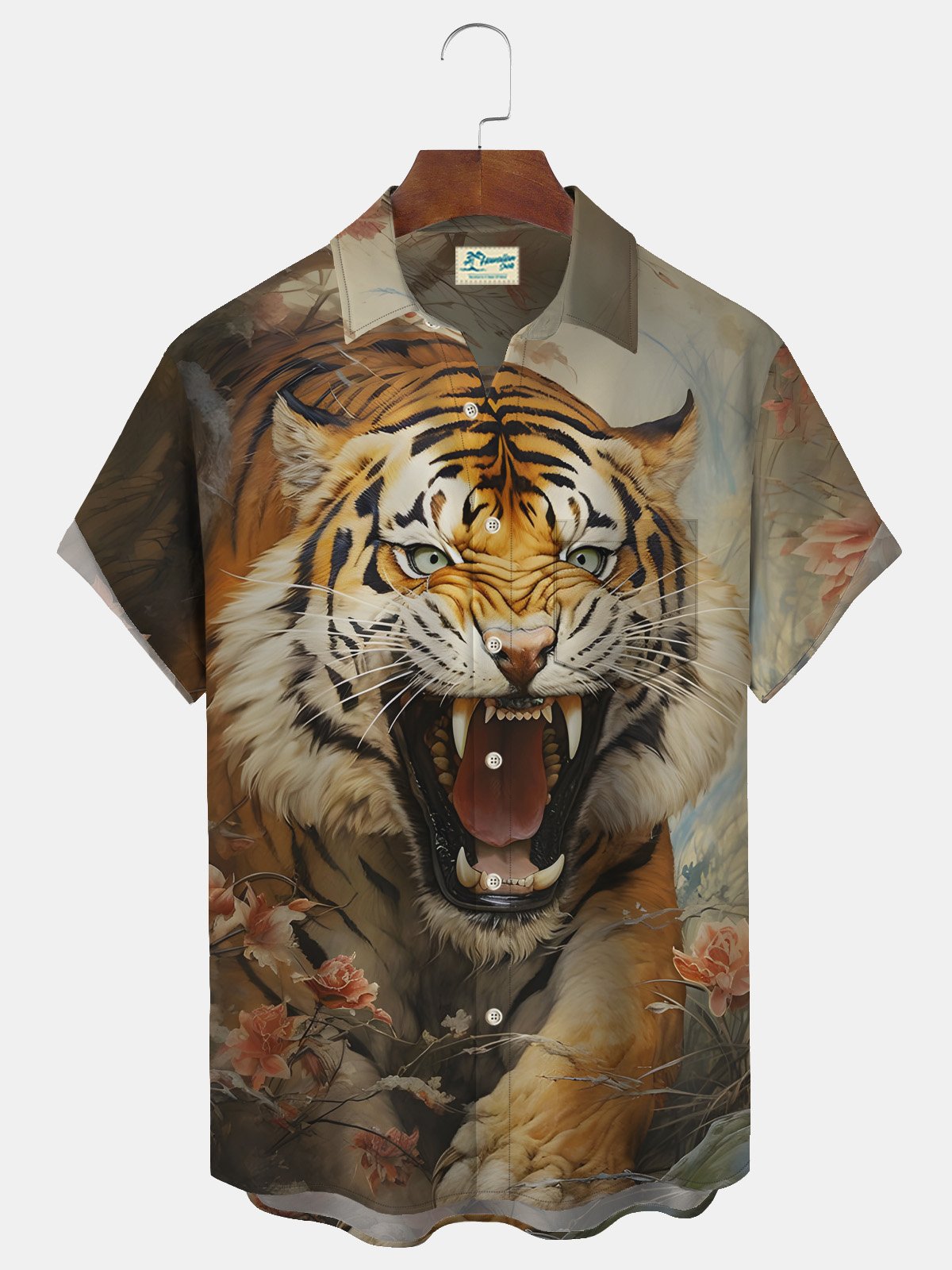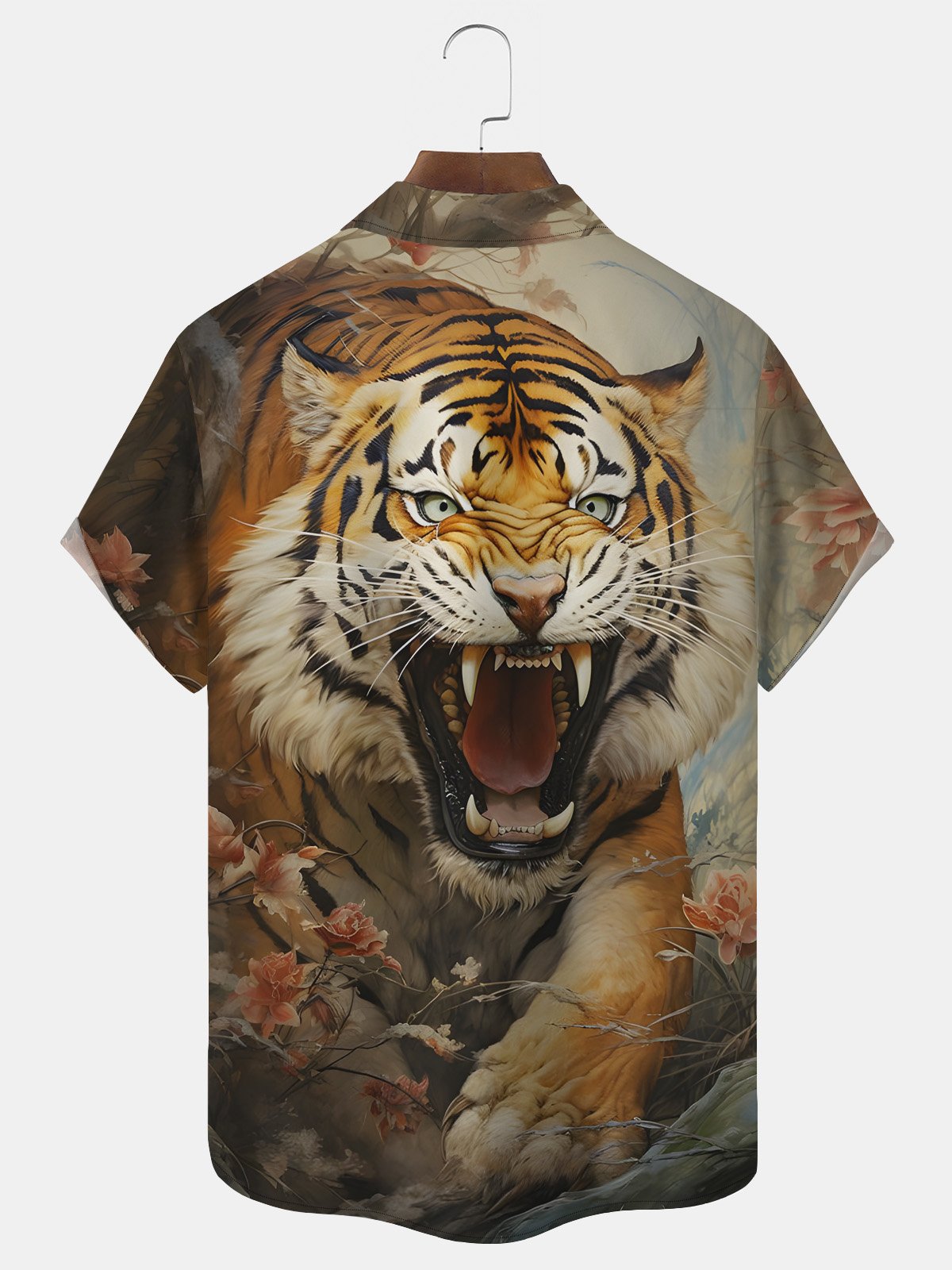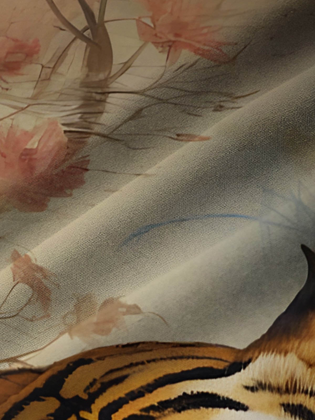 Alohadaddy 50’s Khaki Japanese Vintage Ukiyo-e Men's Hawaiian Shirts Sakura Tiger Aloha Camp Pocket Shirts