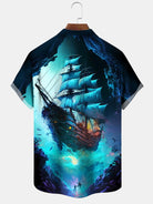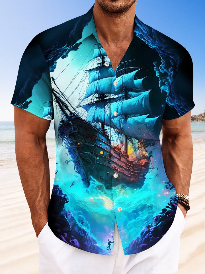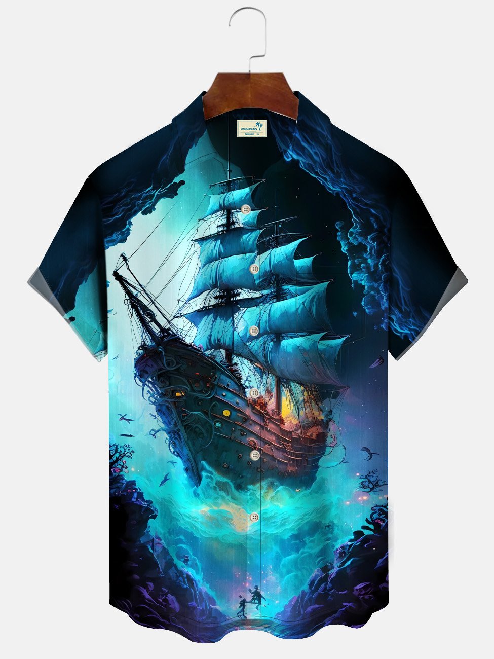 Alohadaddy Boat Contrast Ocean Men Button Pocket Casual Vacation Short Sleeve Shirt