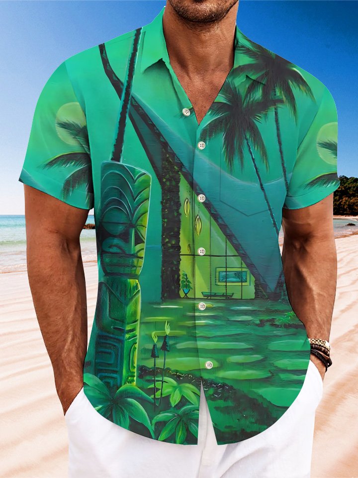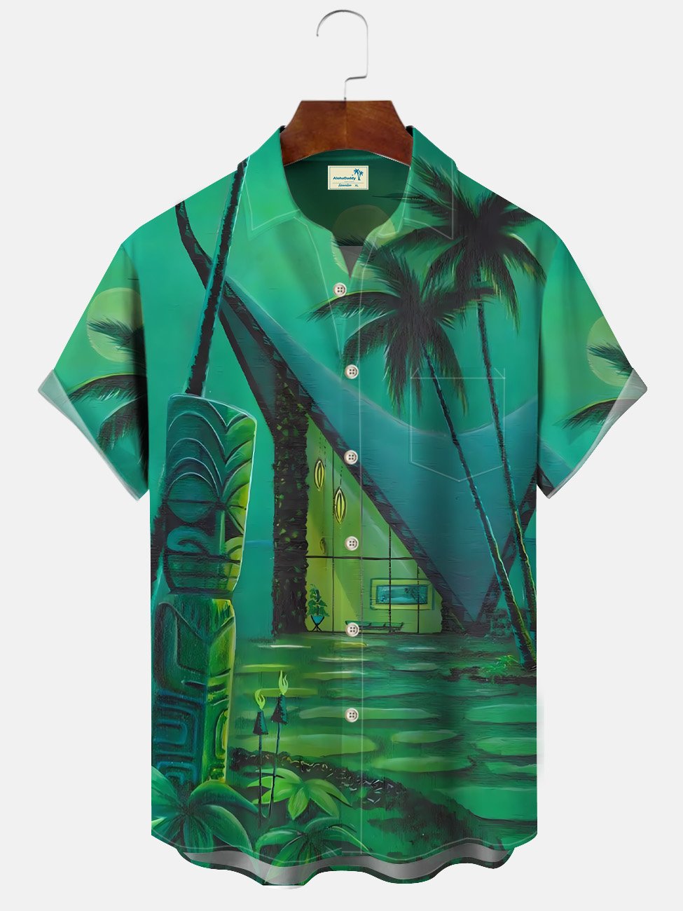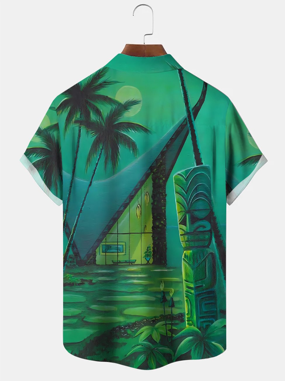 Alohadaddy Summer Stone Statue Mural Ethnic Men Button Pocket Casual Vacation Short Sleeve Shirt