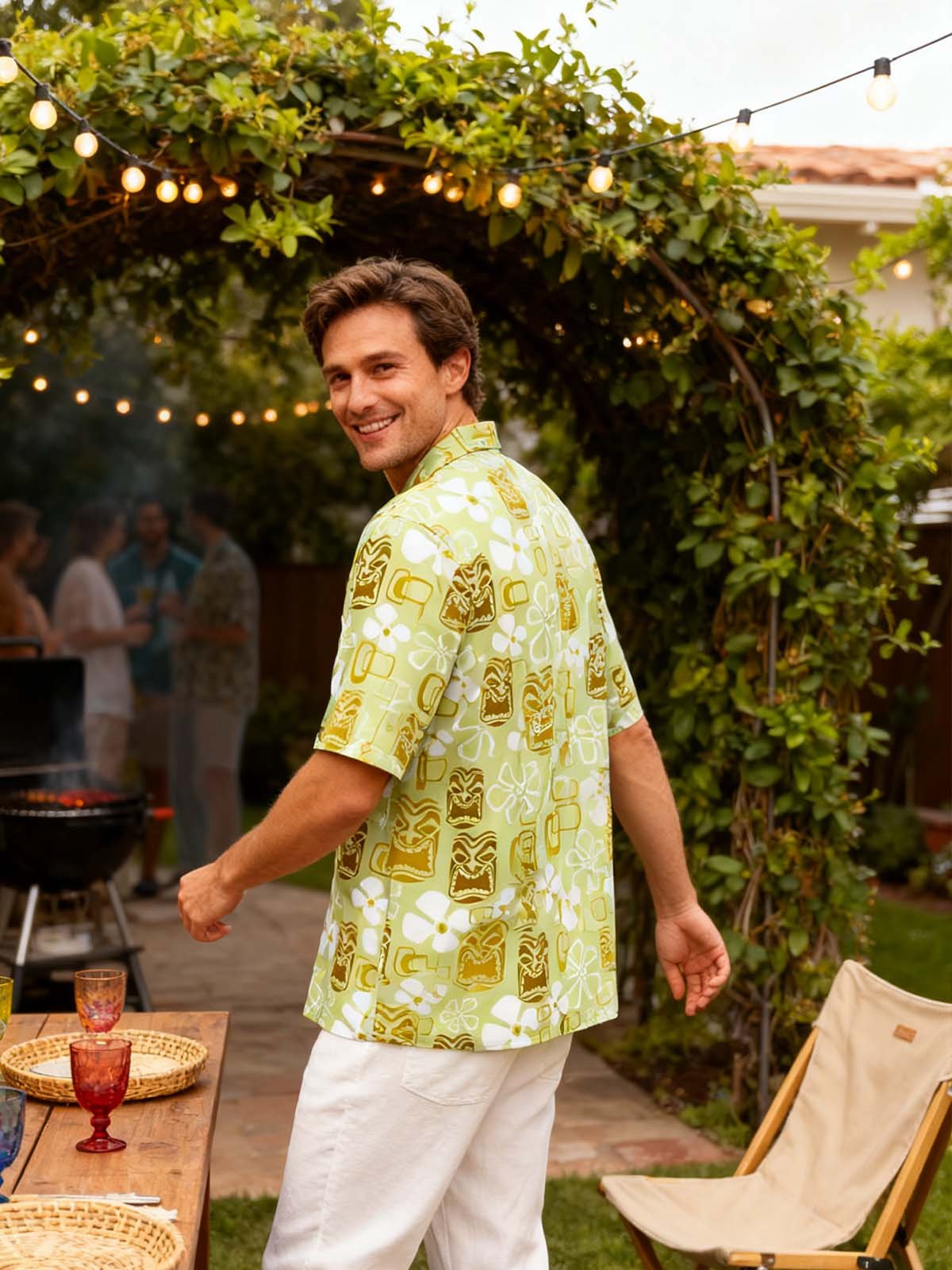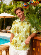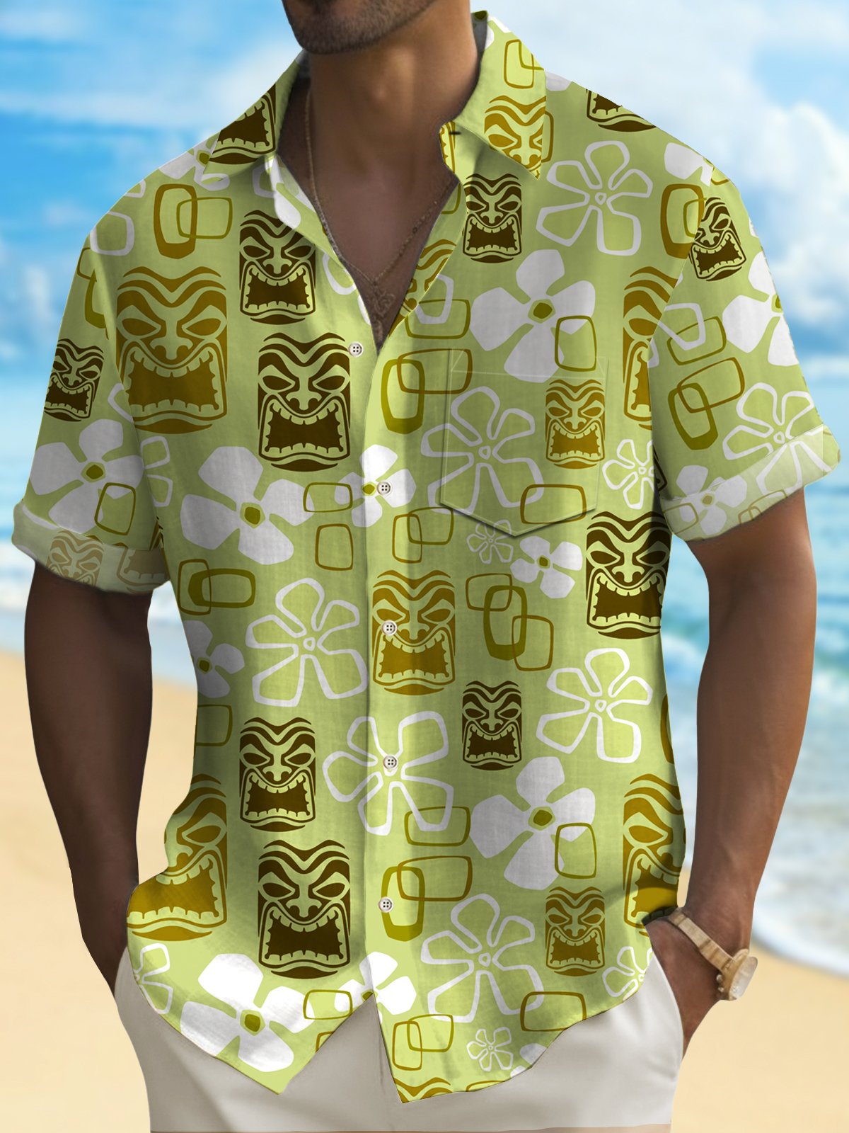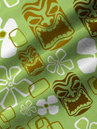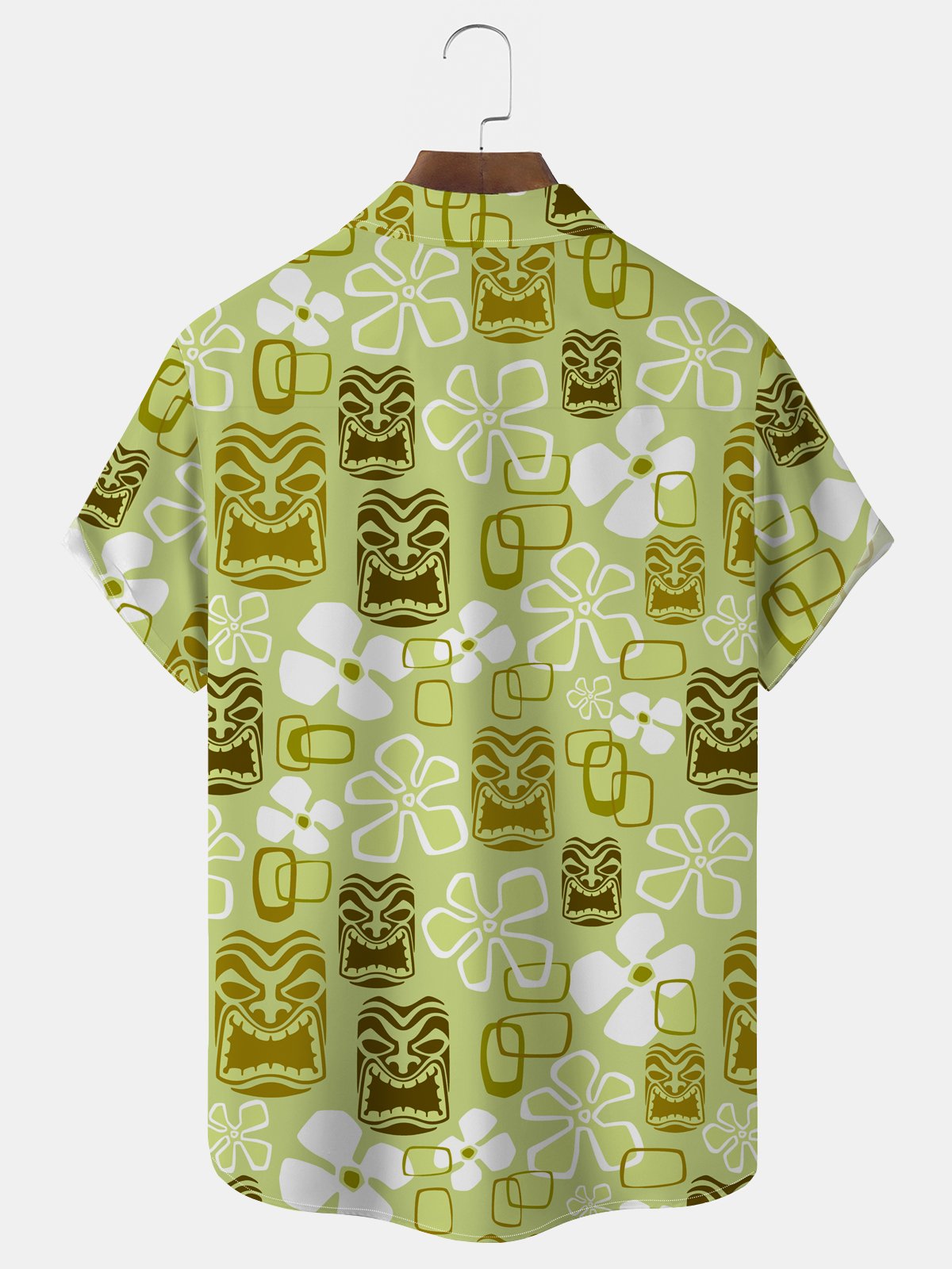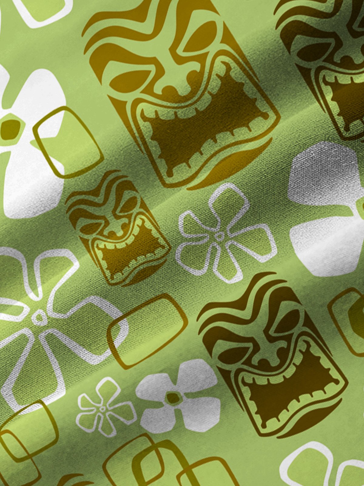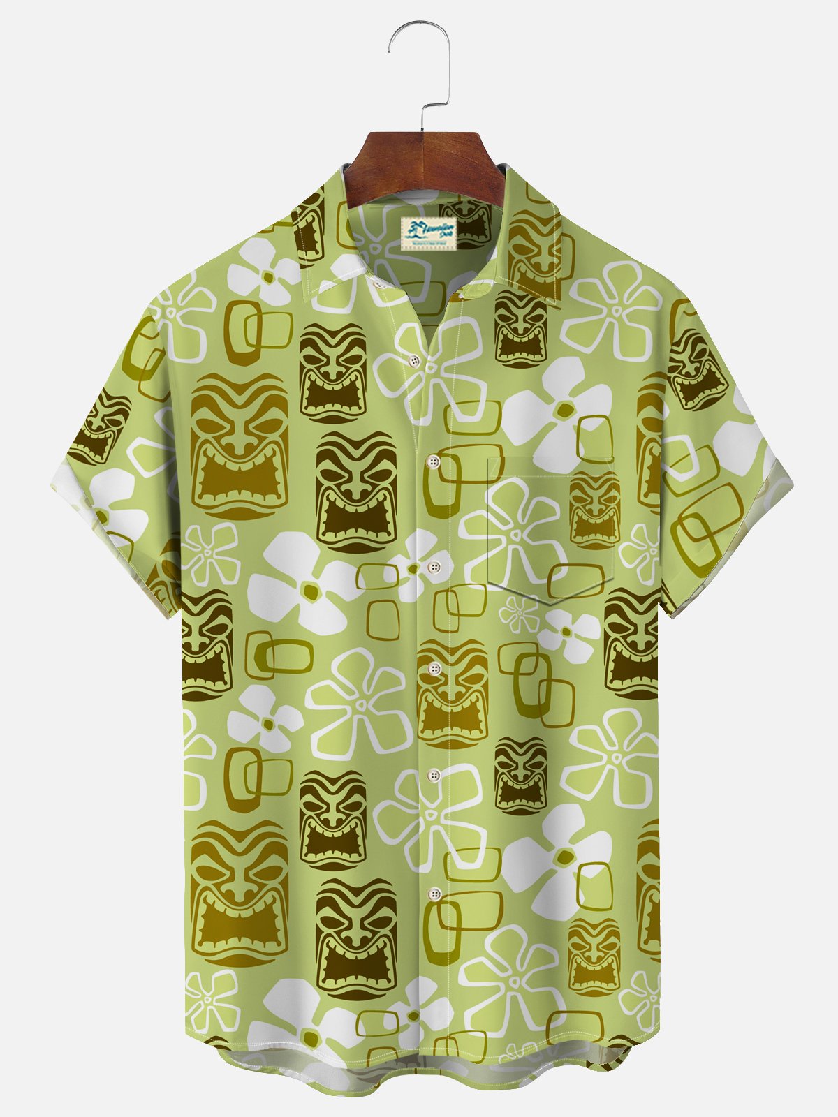 Alohadaddy Vintage Holiday Tiki Art Green Men's Hawaiian Shirts Stretch Aloha Camp Pocket Shirts