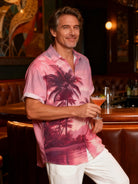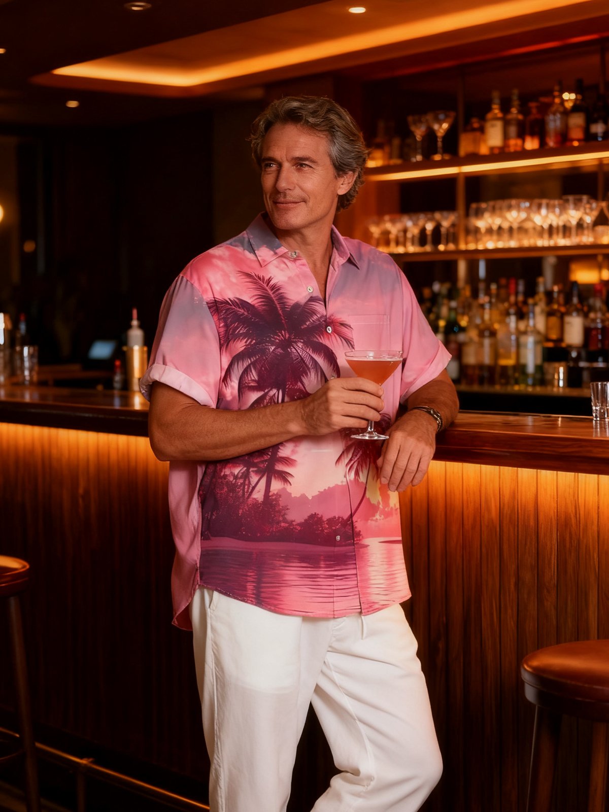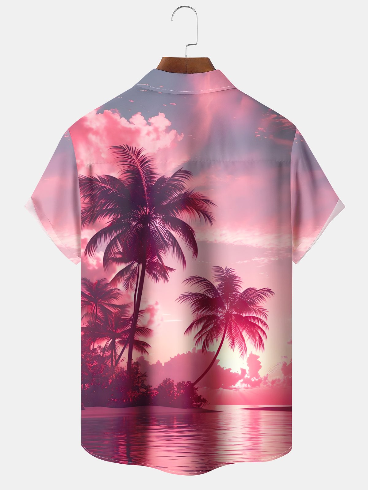 Alohadaddy Casual Everyday Palm Trees Beach Print Art Polyester Stretch Large Size Pocket Short Sleeve Shirt