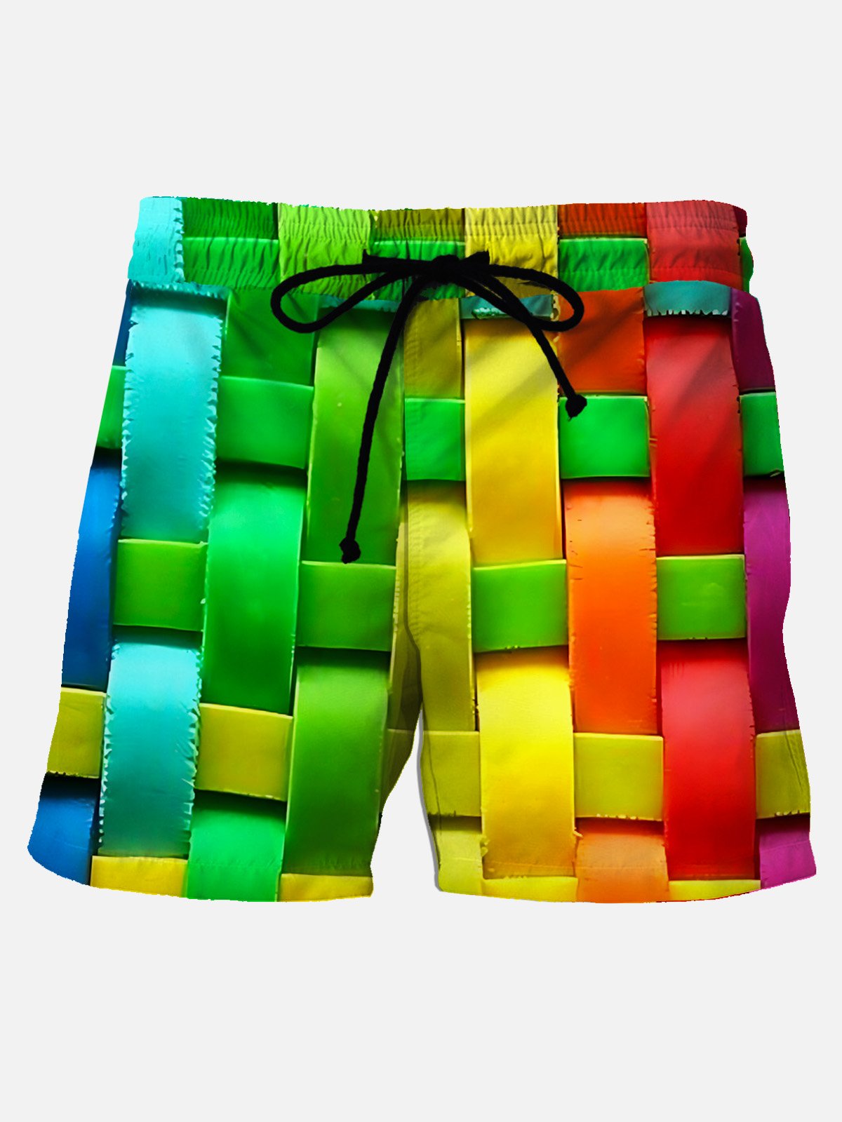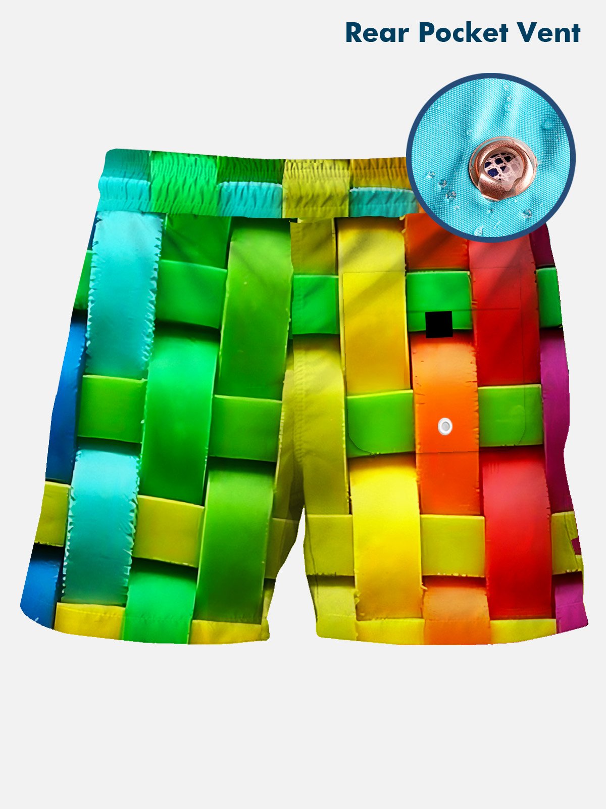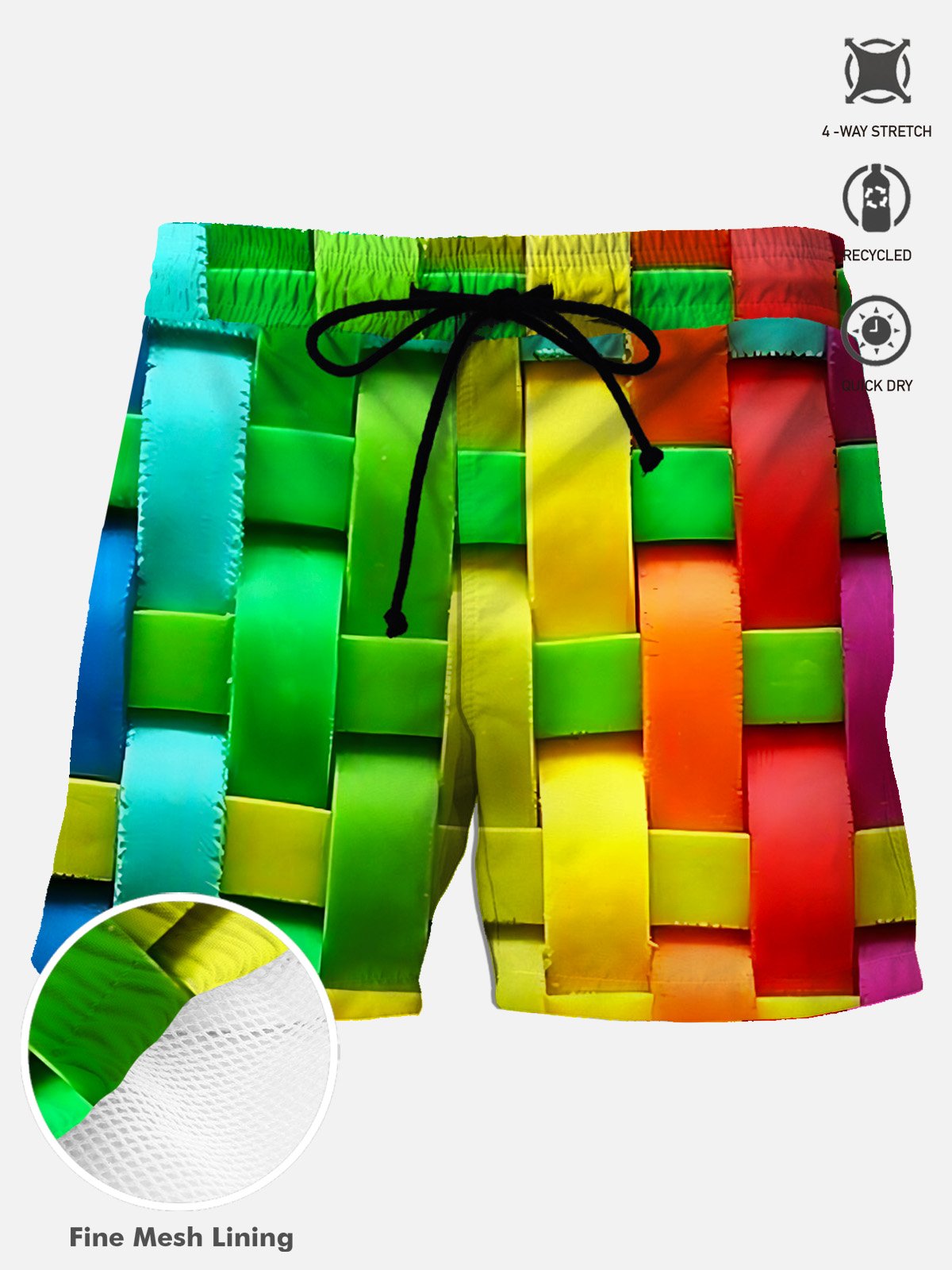Alohadaddy Beach Rainbow Plaid Men's Hawaiian Board Shorts Surf Geometric Art Quick-Dry Pockets Big Tall