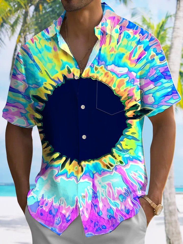 Alohadaddy Geometric Gradient Button Pocket Casual Short Sleeve Shirt