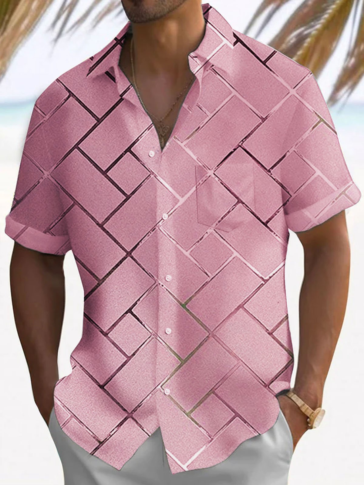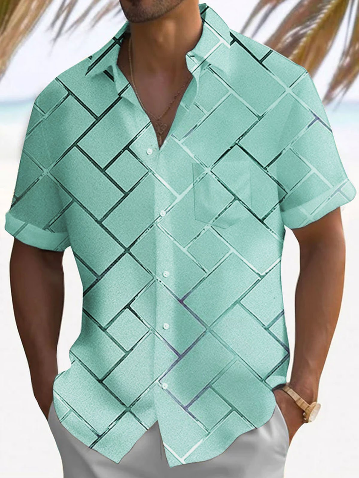 Alohadaddy Retro Geometric 3D Tech Print Men's Button Pocket Short Sleeve Shirt