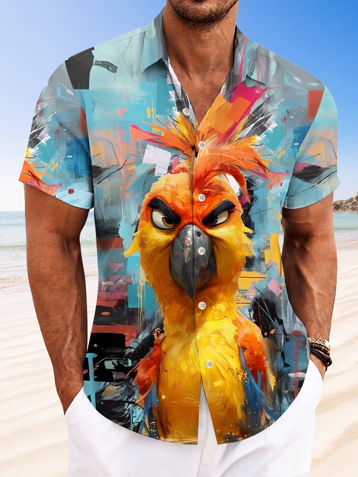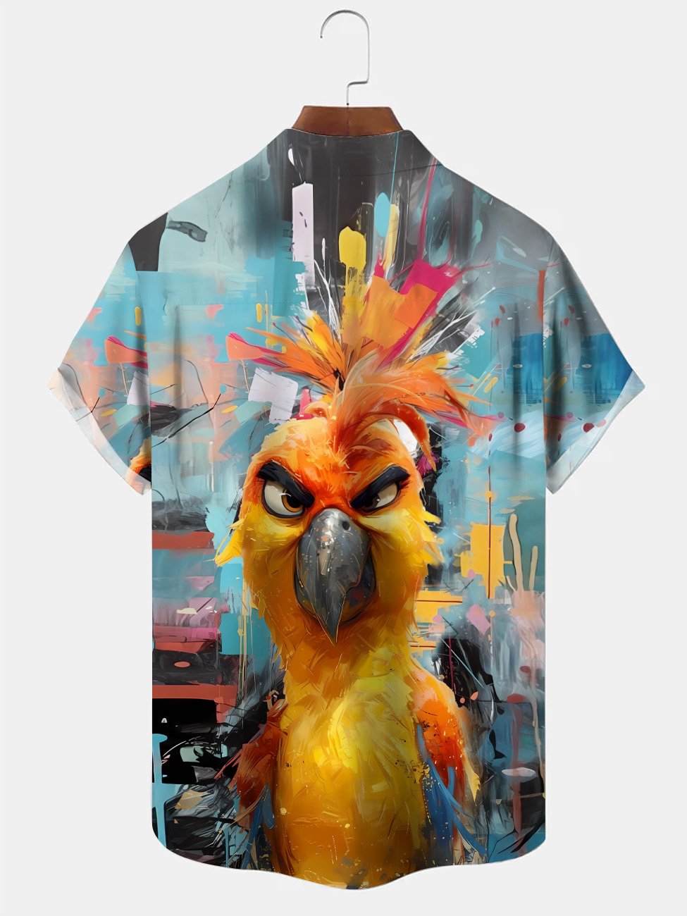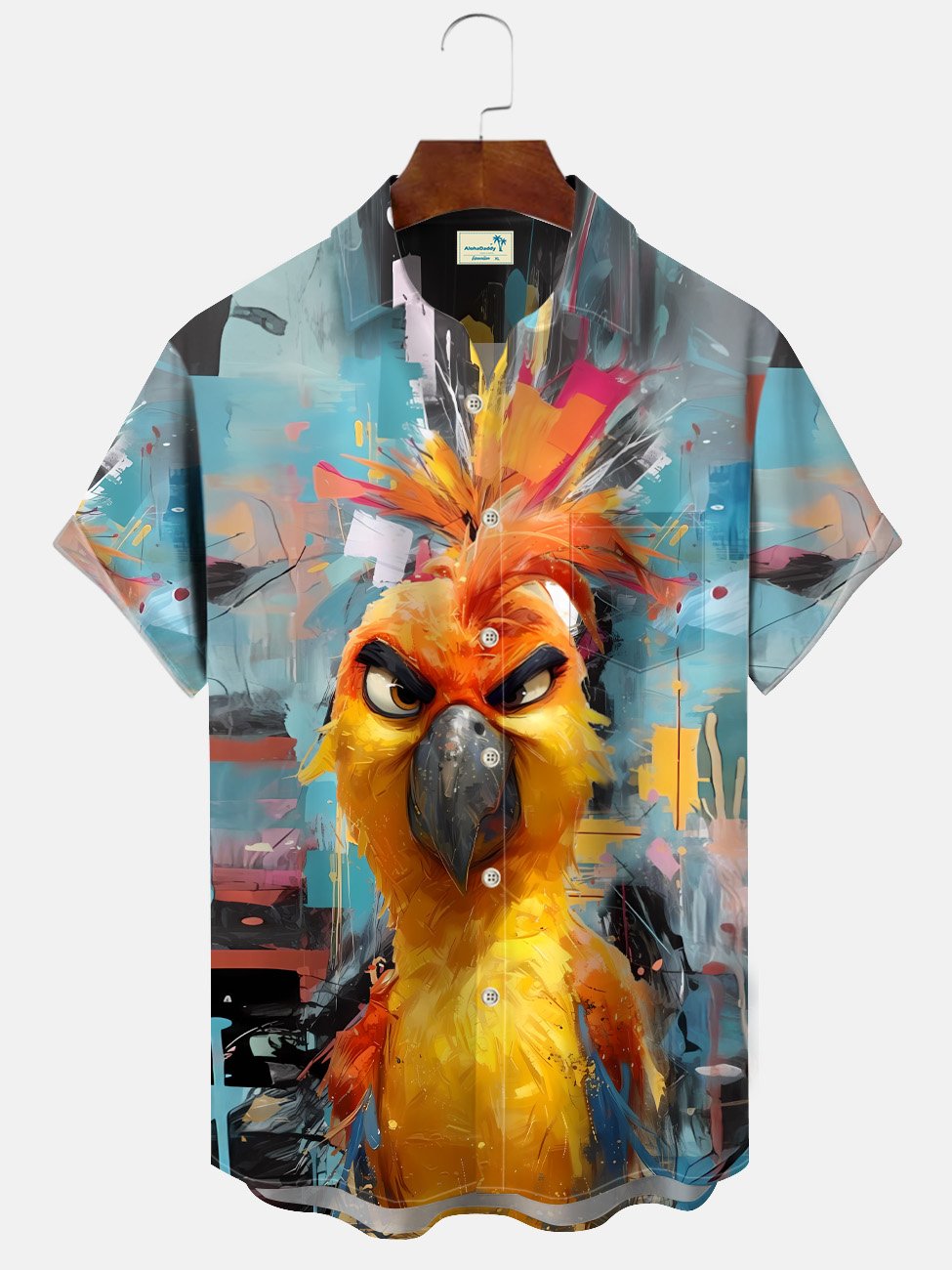 Alohadaddy Retro Oil Painting Art Parrot Men Pocket Button Casual Vacation Short Sleeve Shirt