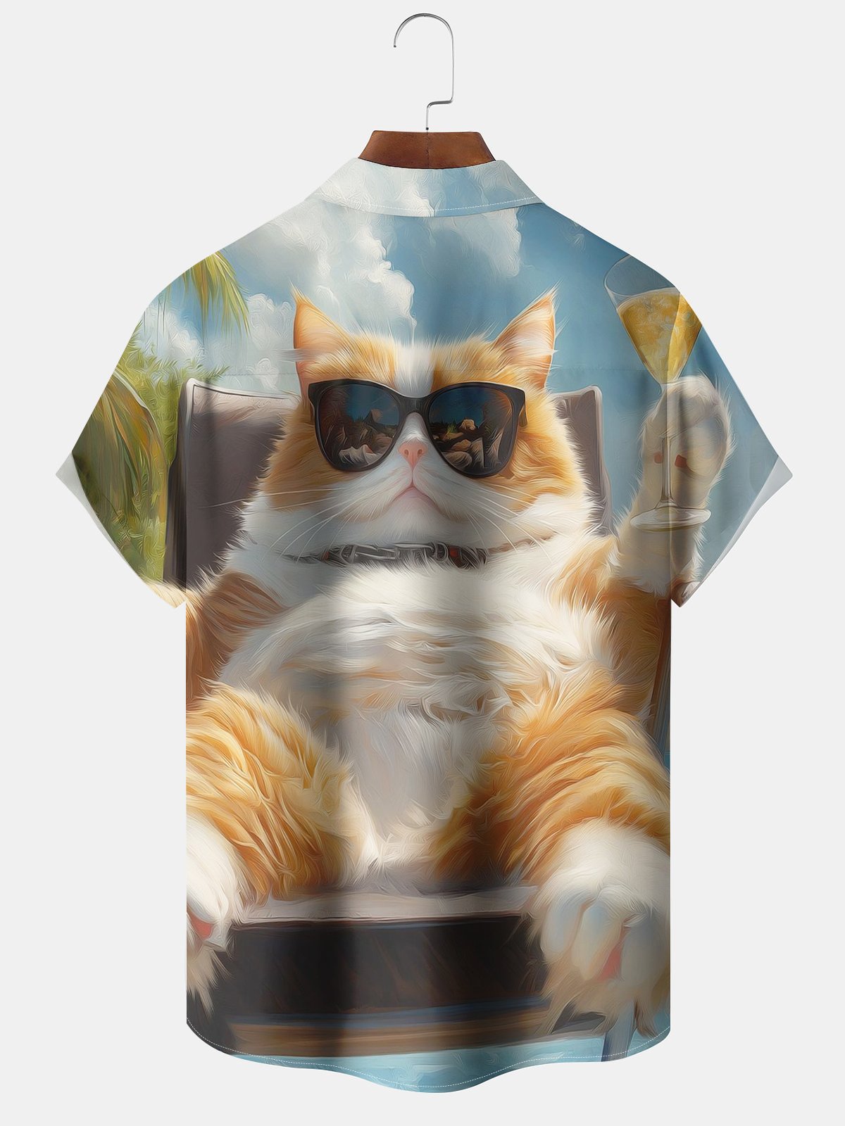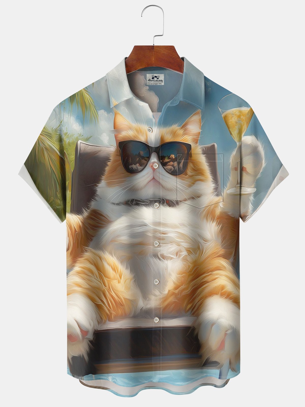 Alohadaddy® Casual Beach Vacation Cat Printed Art Chest Pocket Large Size Long Hawaiian Men's Short Sleeve Shirt
