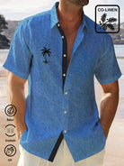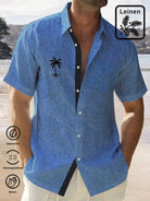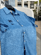 Alohadaddy Hawaiian blue linen denim imitation coconut tree print chest pocket holiday shirt oversized Hawaiian shirt