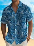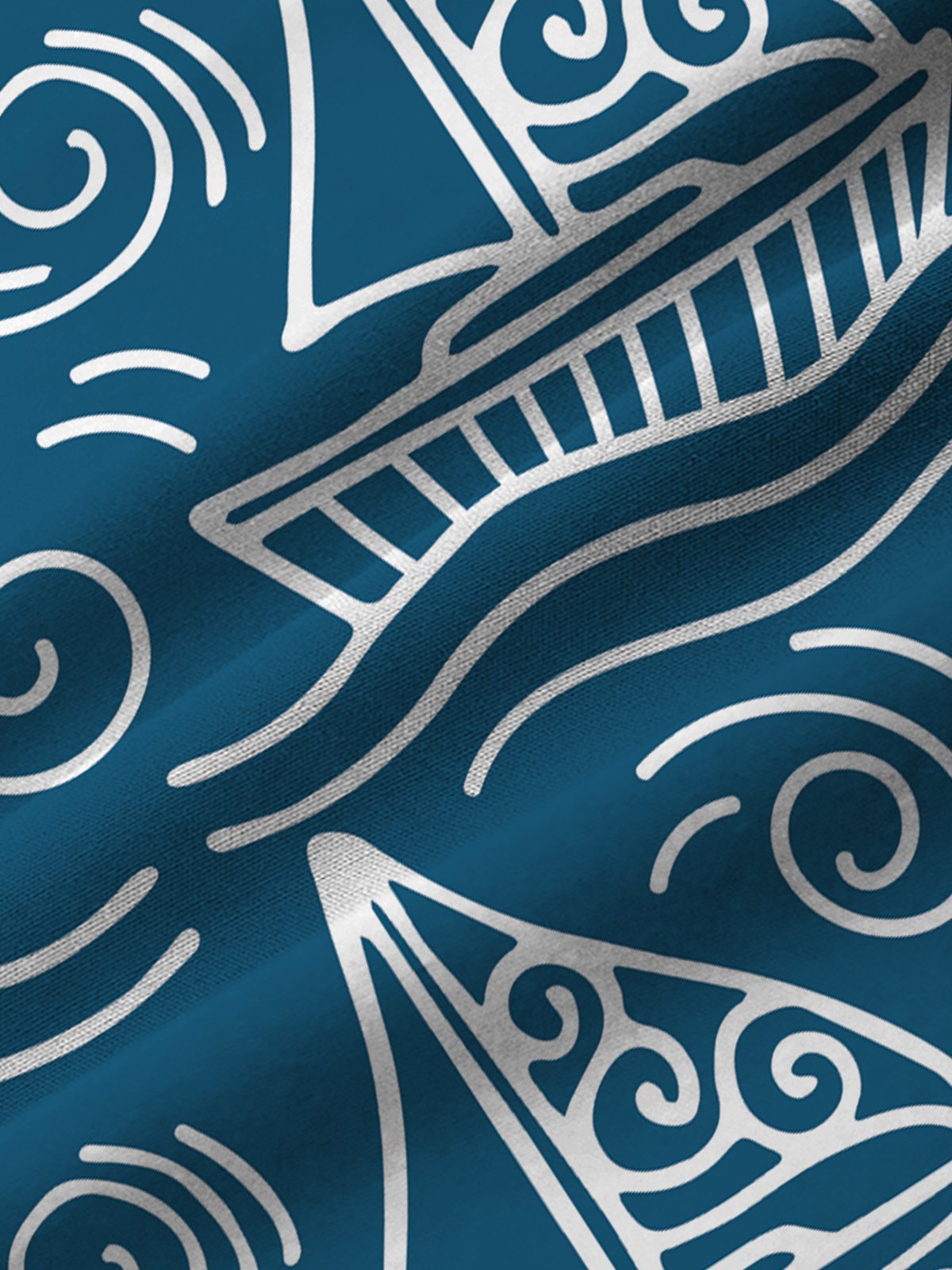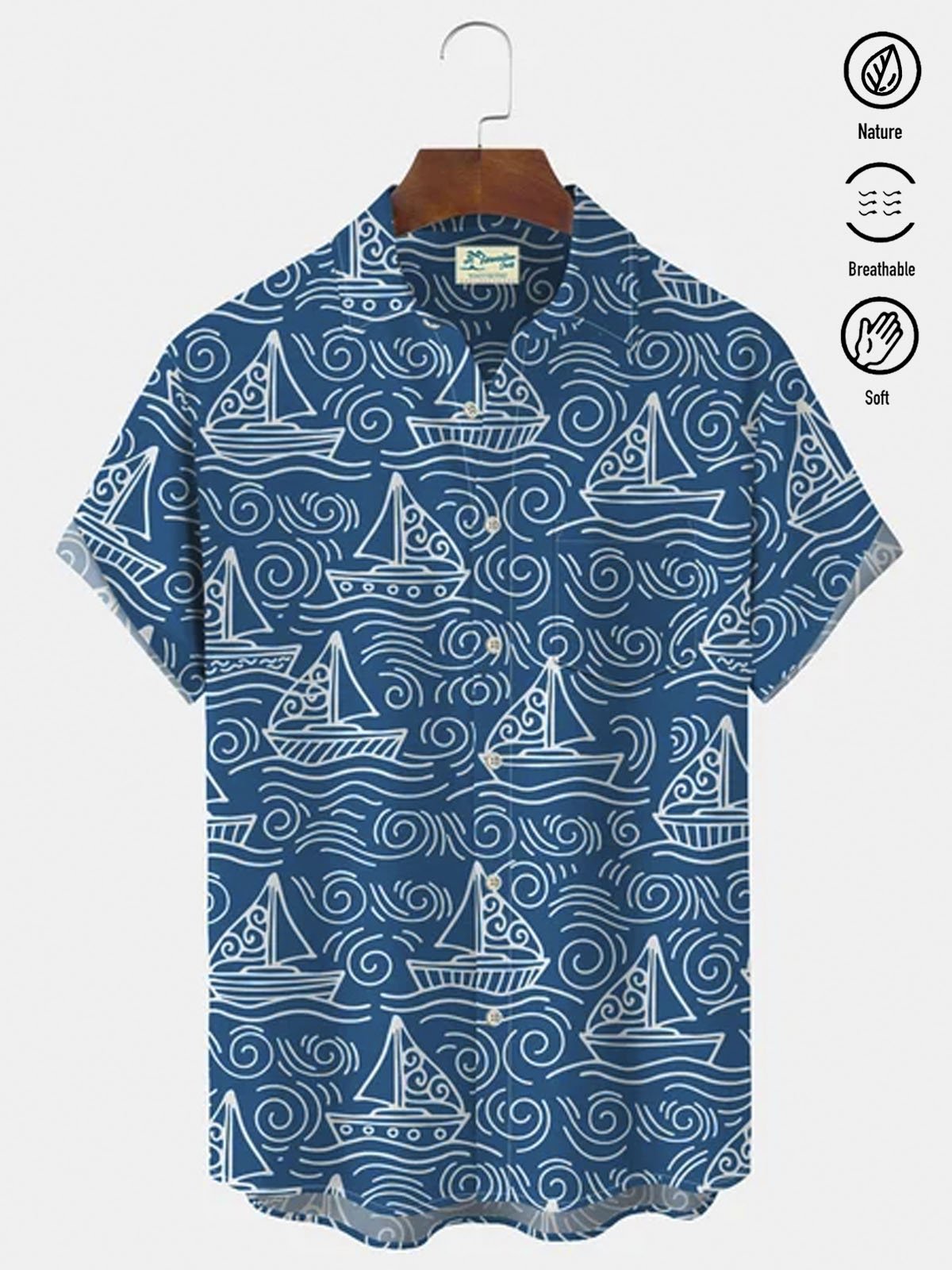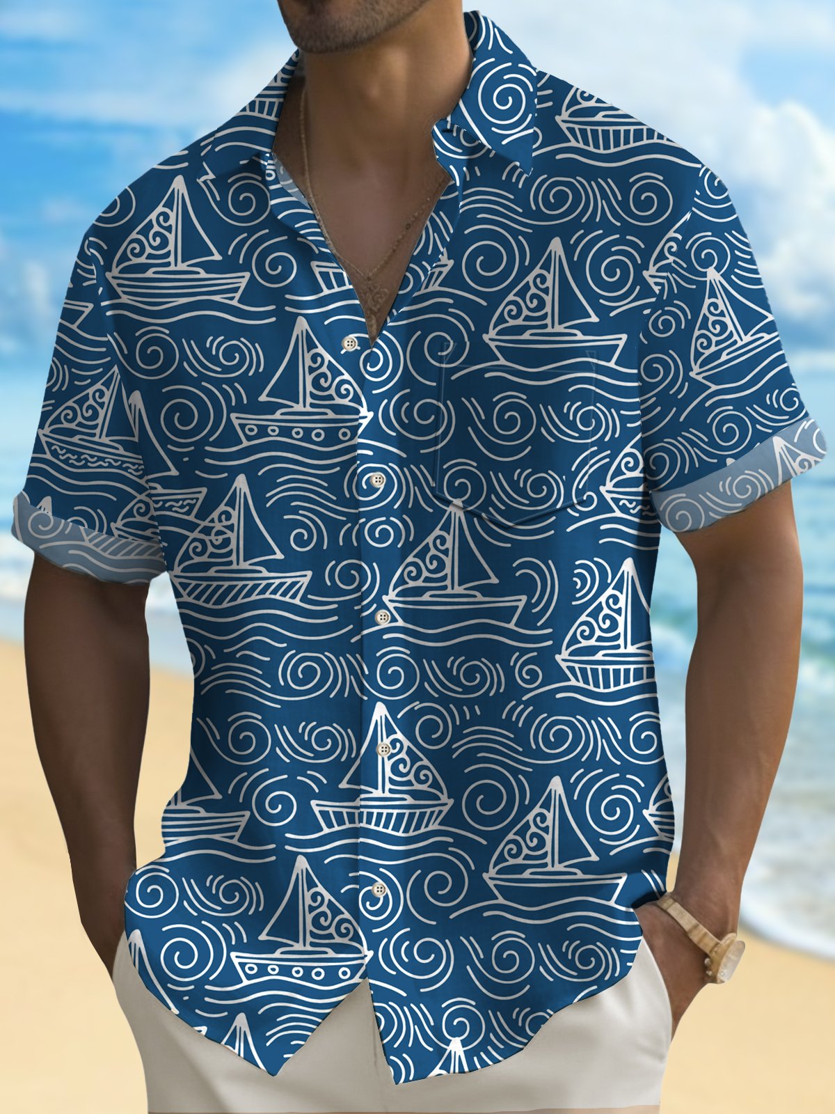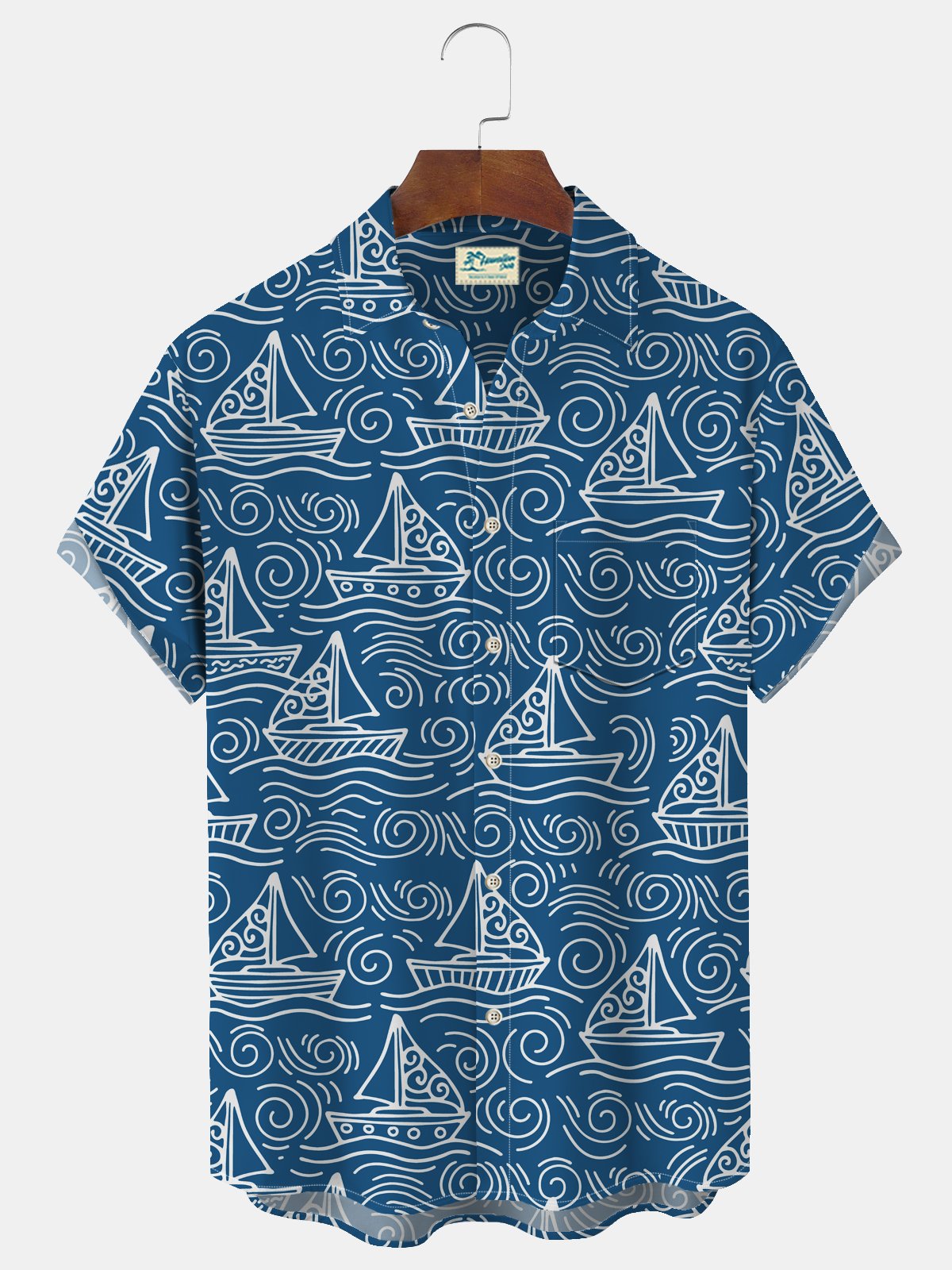 Alohadaddy Japanese Vintage Blue Men's Hawaiian Shirt Sailing Art Stretch Pocket Camp Shirt