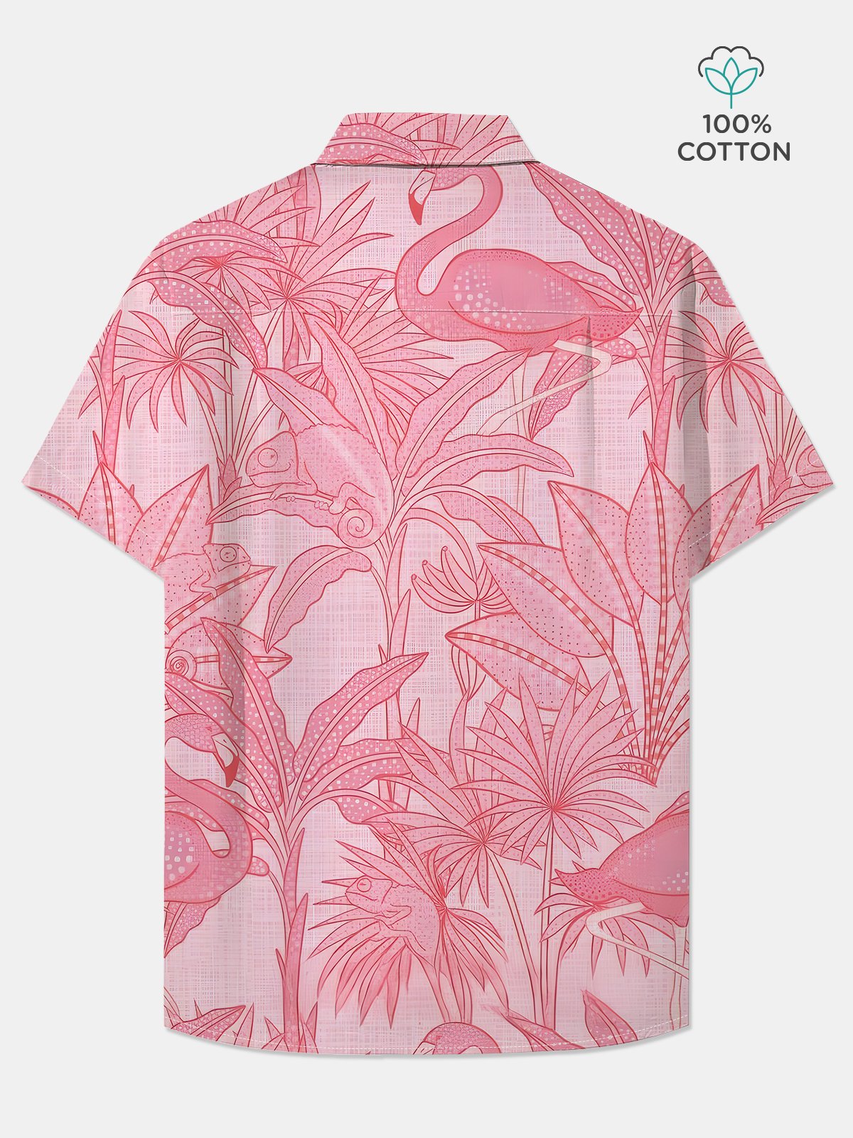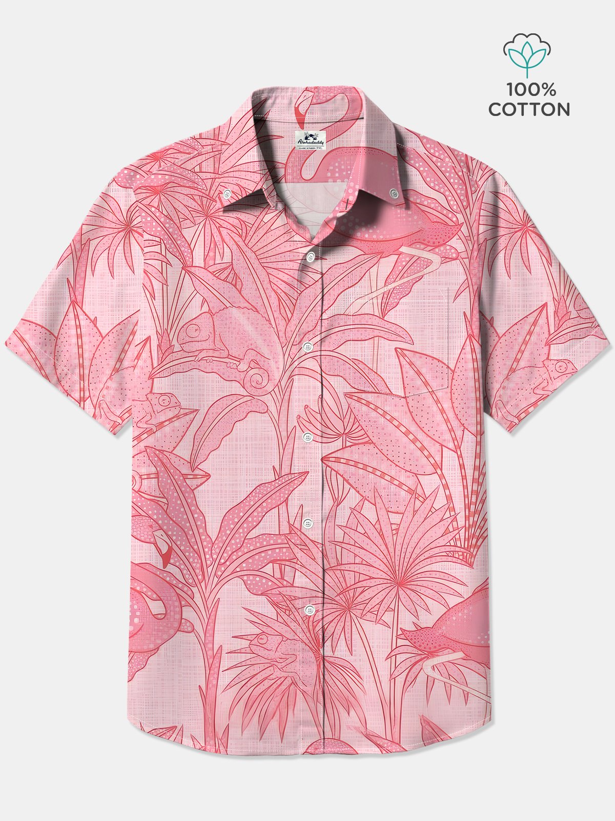 Alohadaddy Cotton Flamingo Chameleon Print Art Moisture Wicking Chest Pocket Cardigan Hawaiian Oversized Short Sleeve Shirt
