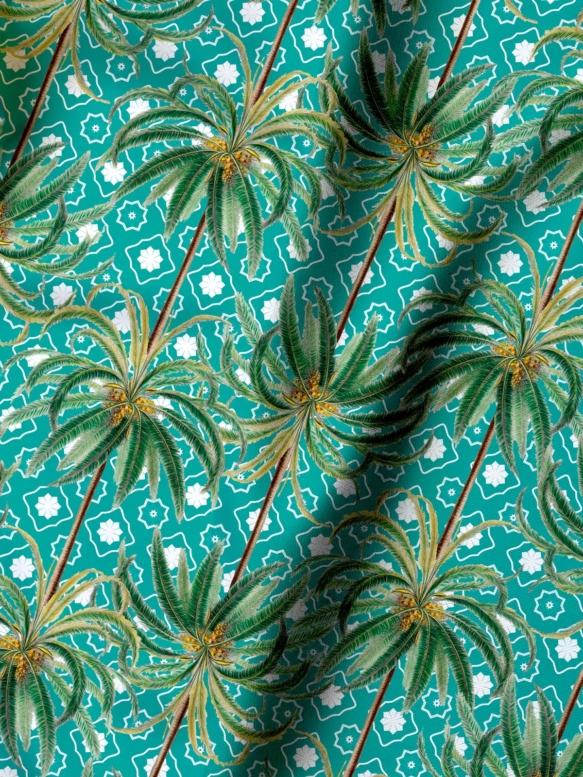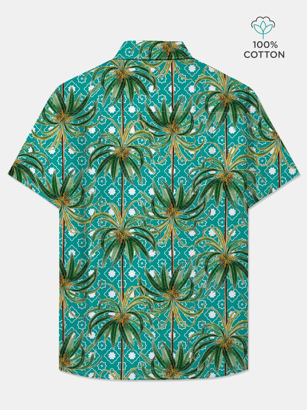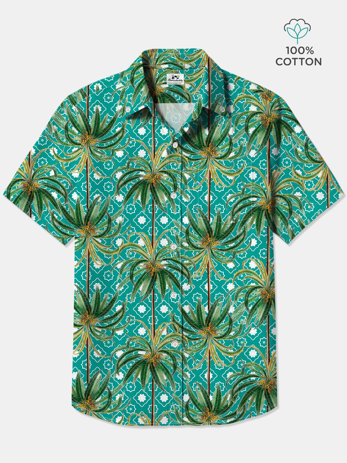 Alohadaddy Cotton Palm Tree Art Print Moisture Wicking Chest Pocket Oversized Stretch Hawaiian Short Sleeve Shirt