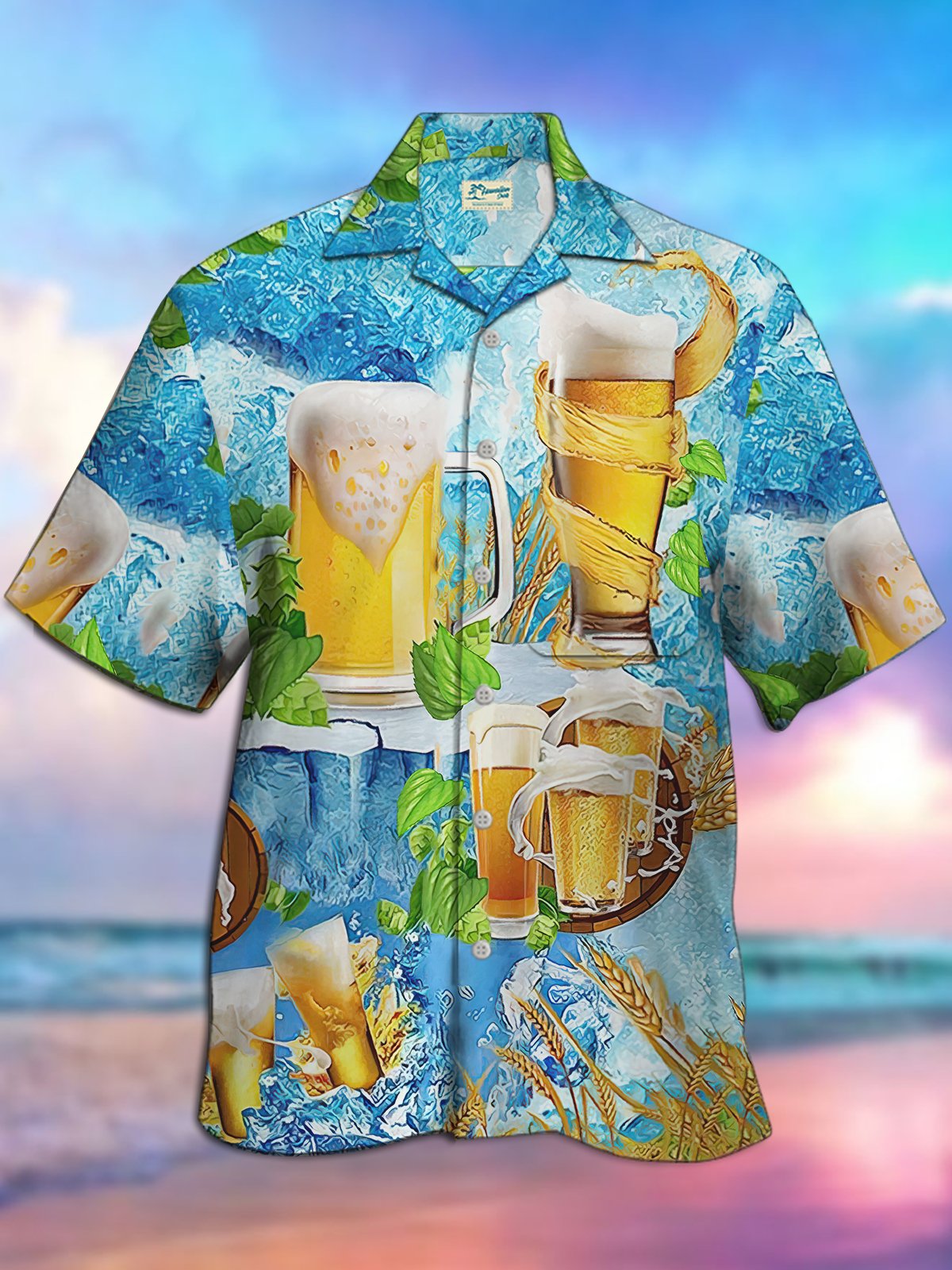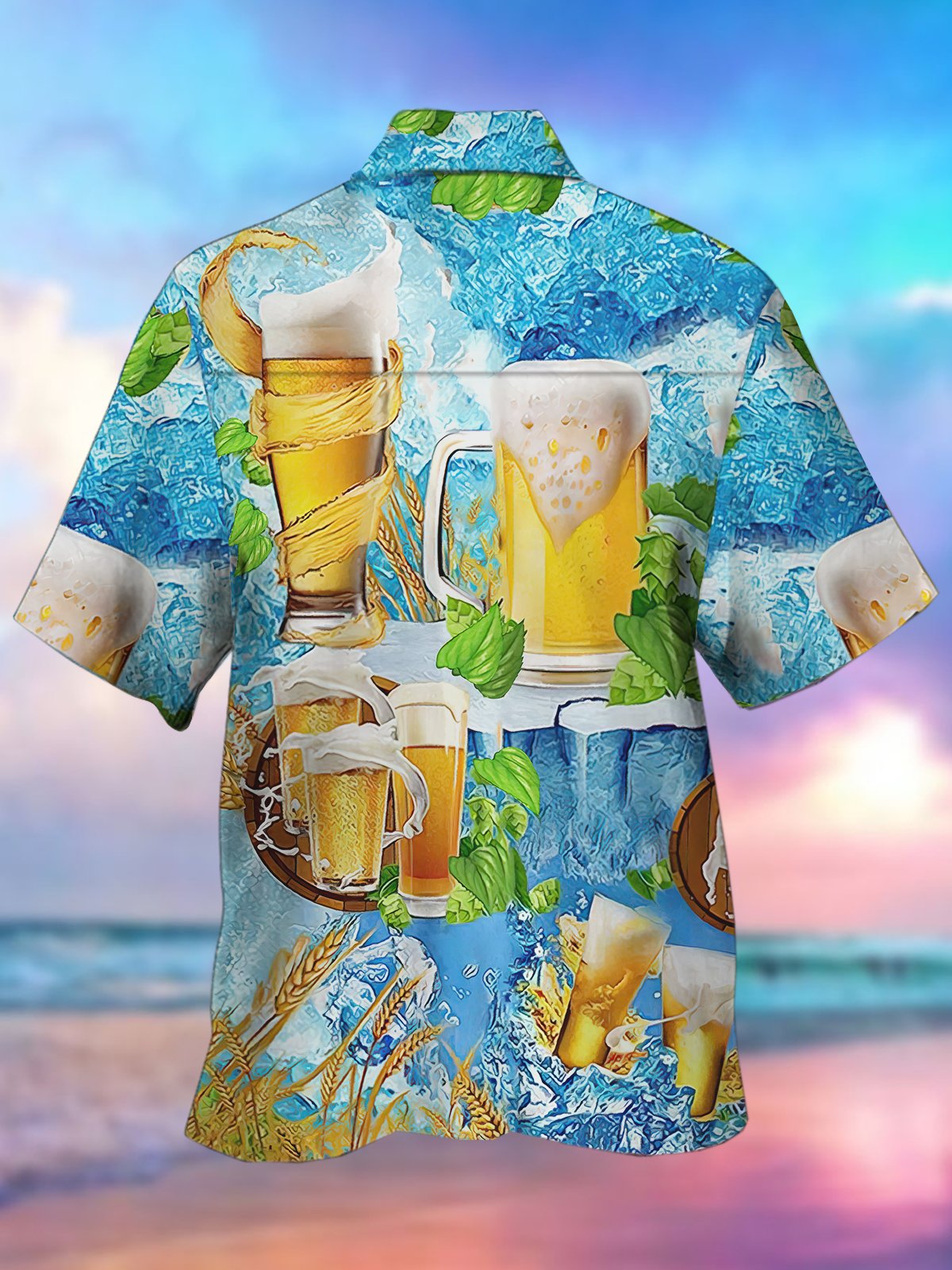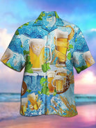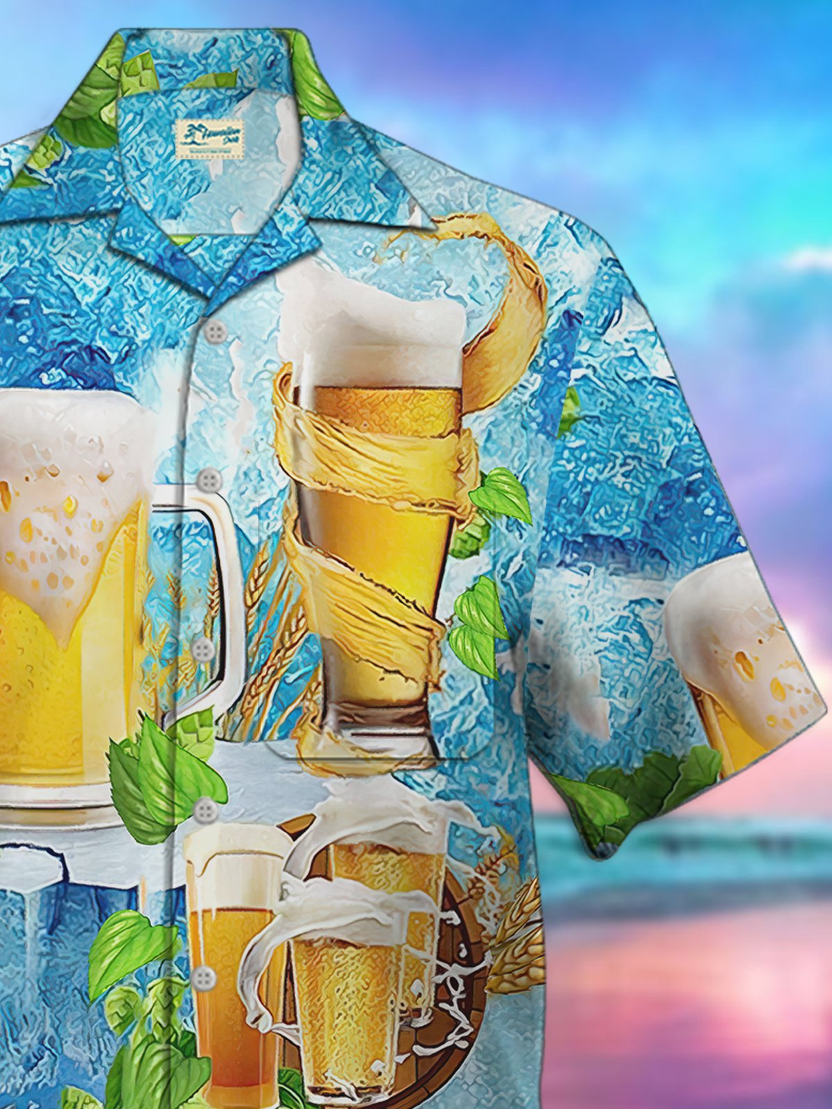 Alohadaddy Beer Print Camp Collar Beach Men's Hawaiian Oversized Short Sleeve Shirt with Pockets
