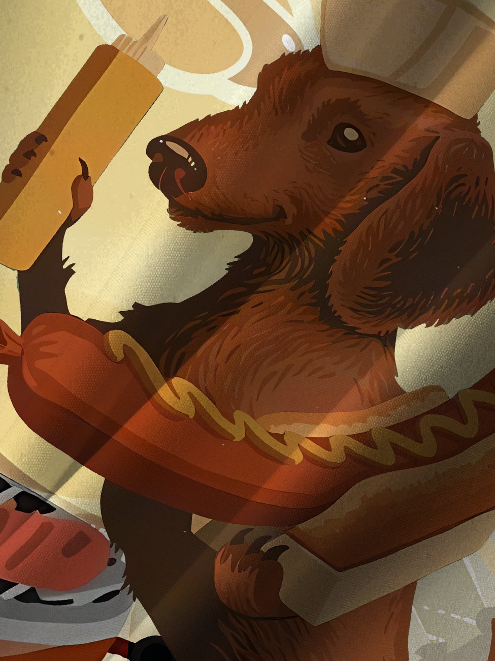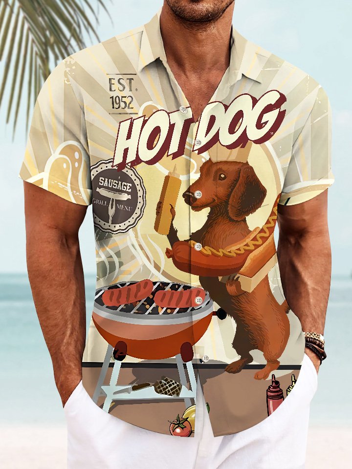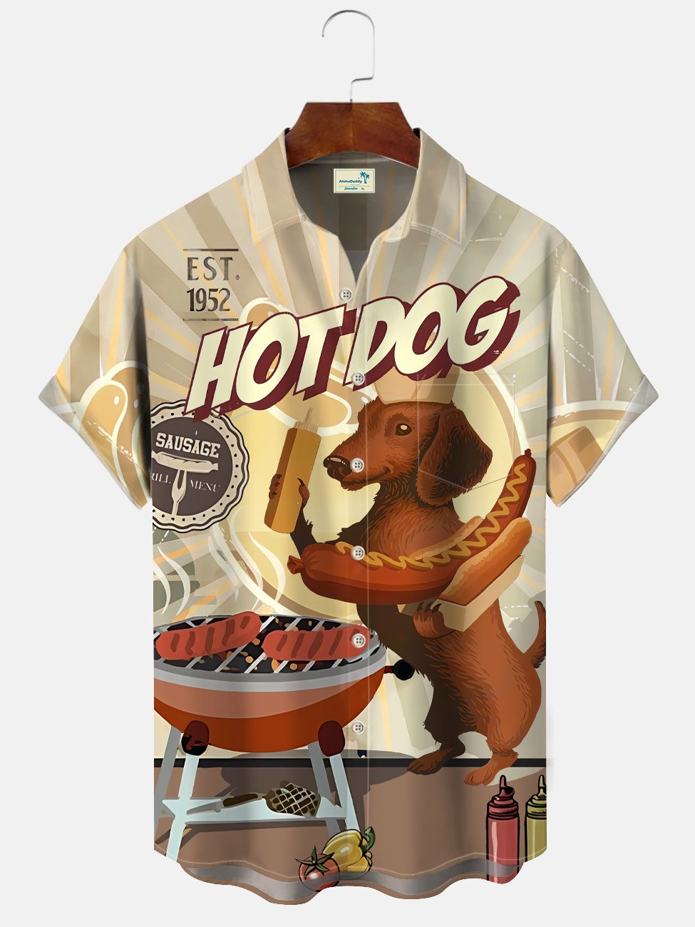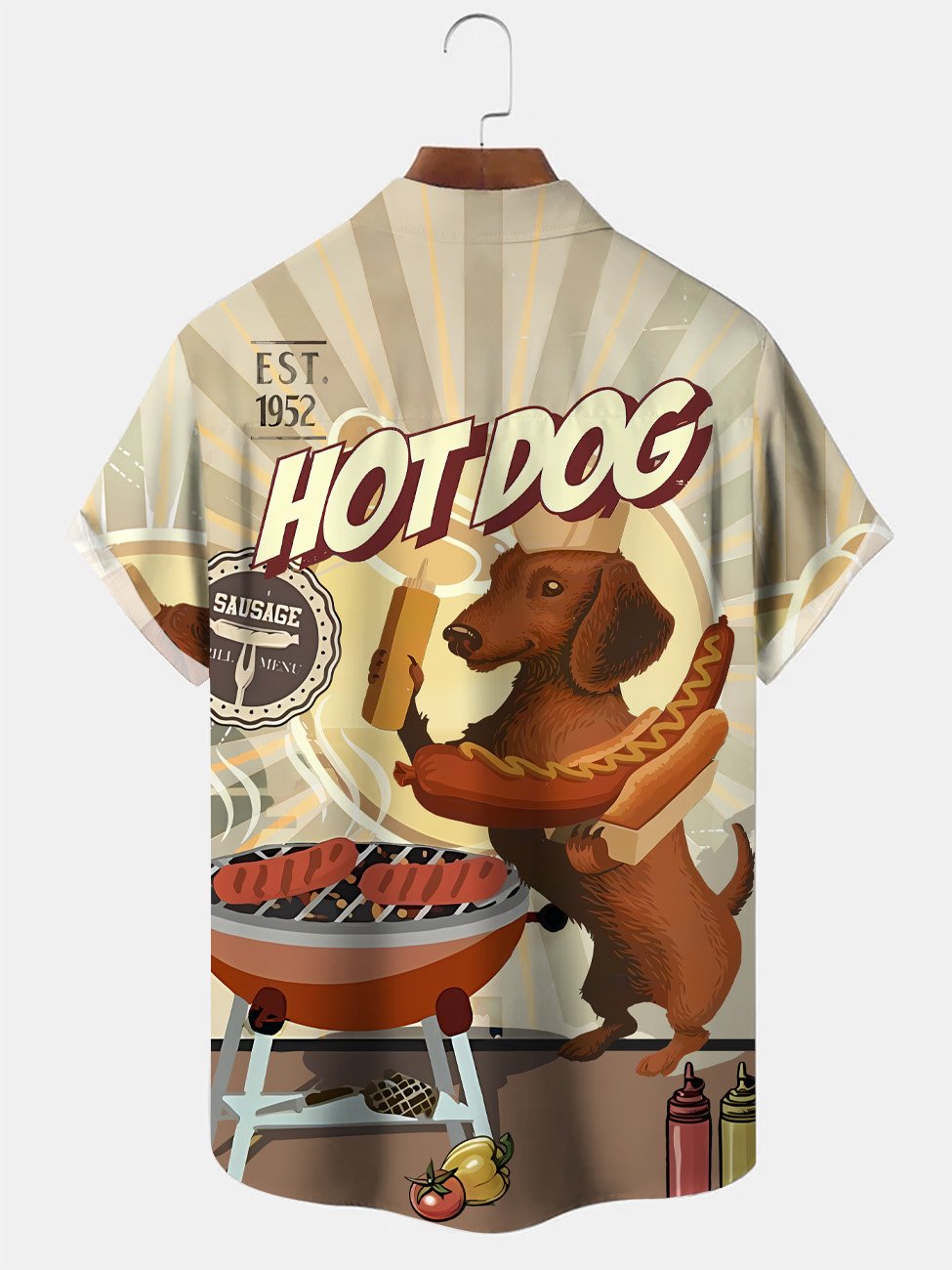 Alohadaddy Summer Hot Dog Animal BBQ Letters Buttons Pockets Leisure Vacation Short Sleeve Shirt
