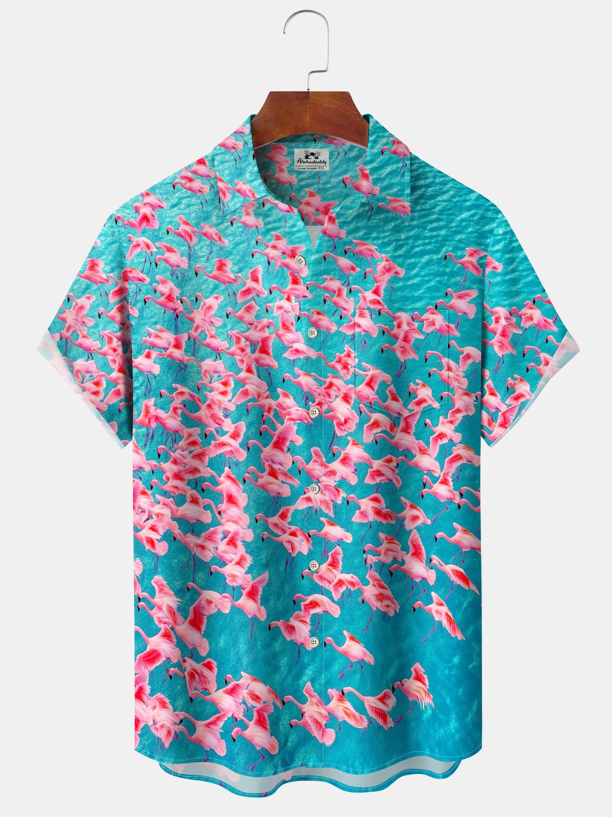 Alohadaddy® Hawaiian Flamingo Print Pocket Elastic Button Men's Short Sleeve Shirt Big & Tall