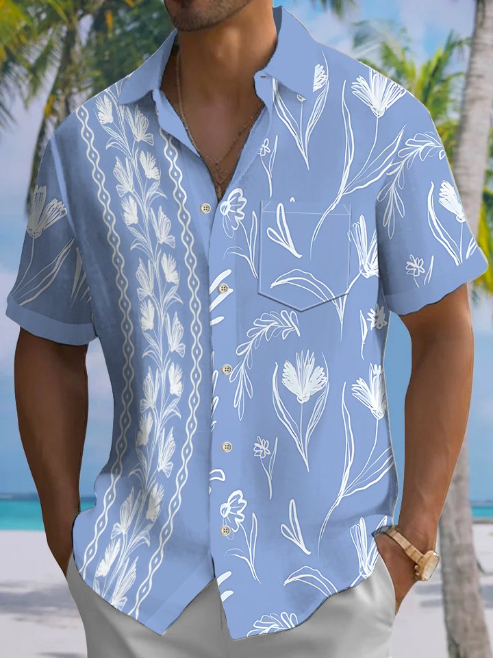 Alohadaddy® Casual Stripes Floral Art Print Chest Pocket Men's Short Sleeve Shirt Big & Tall