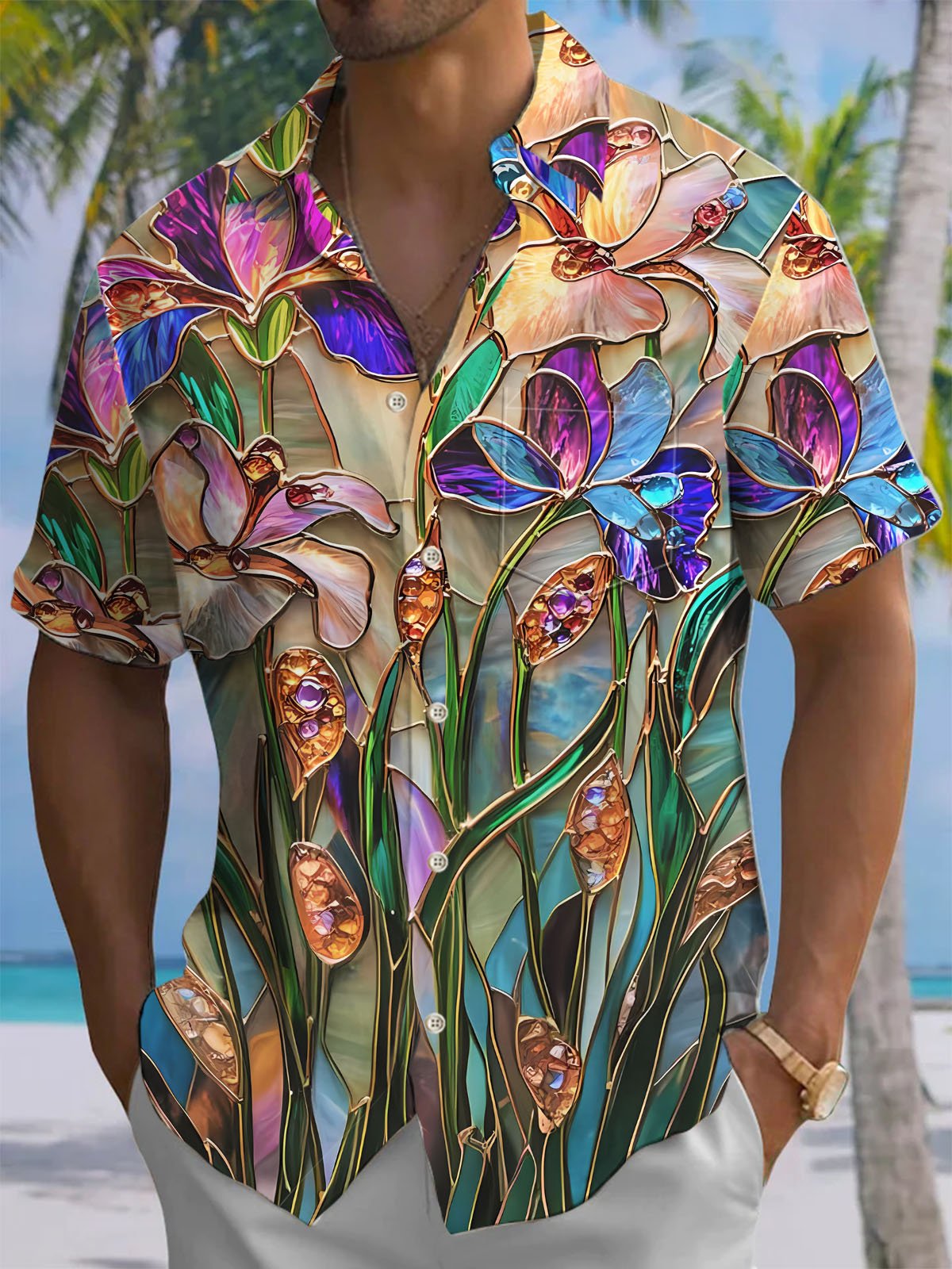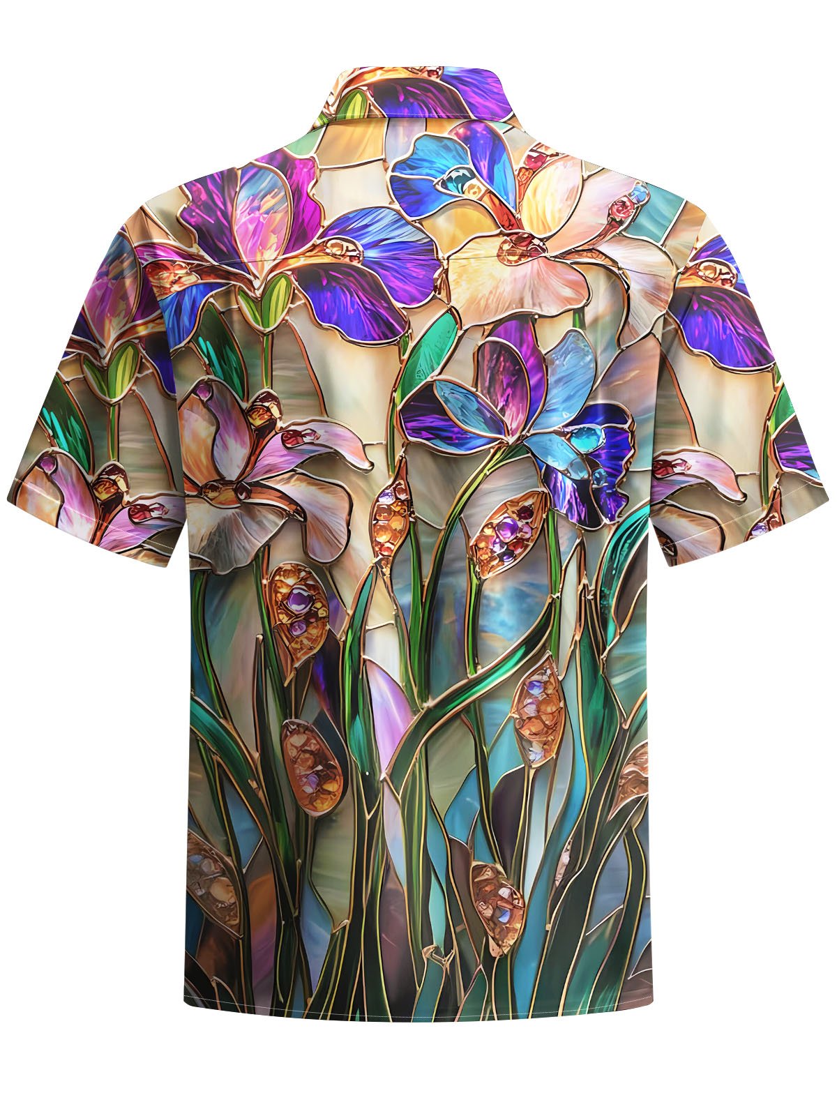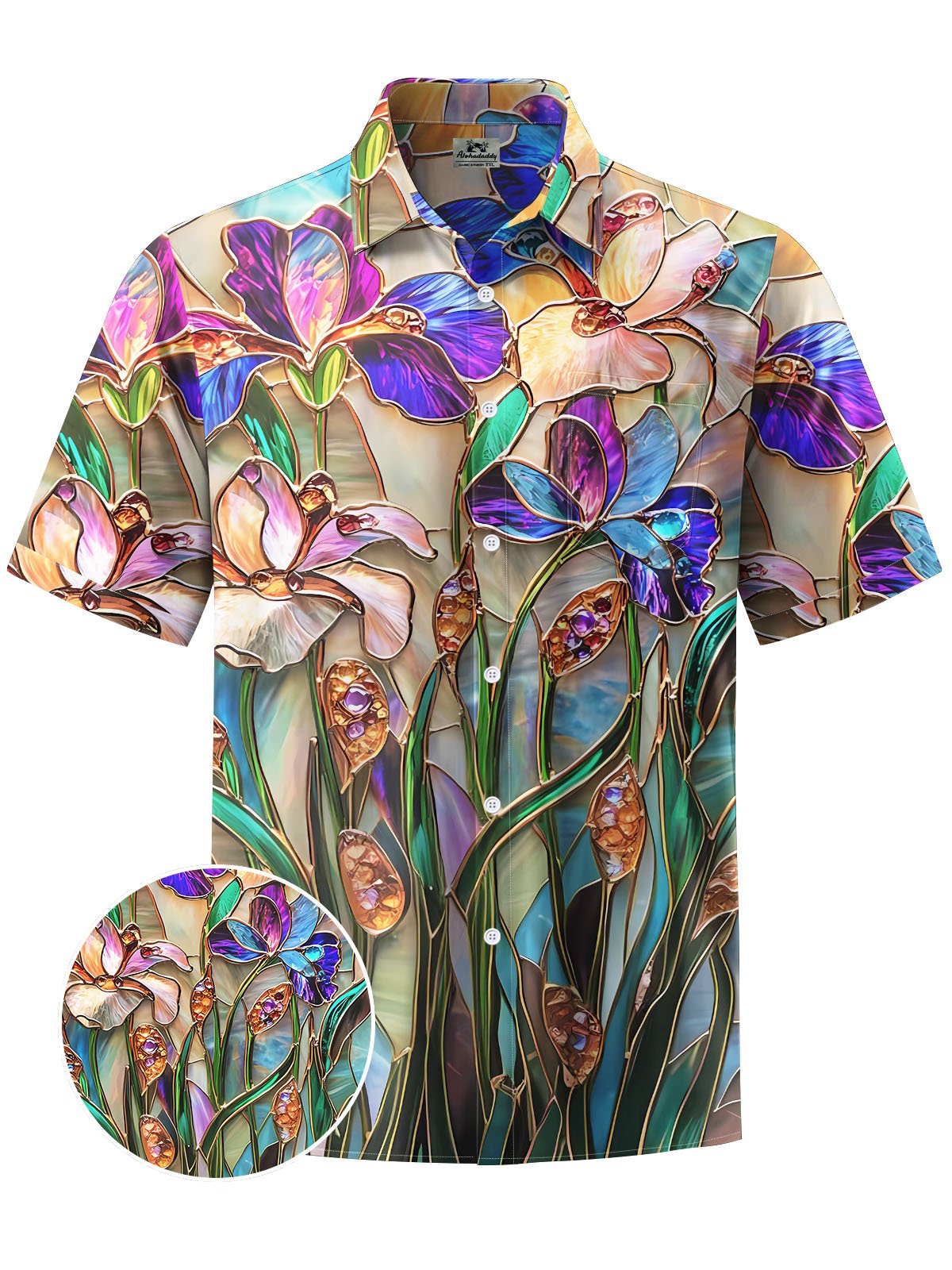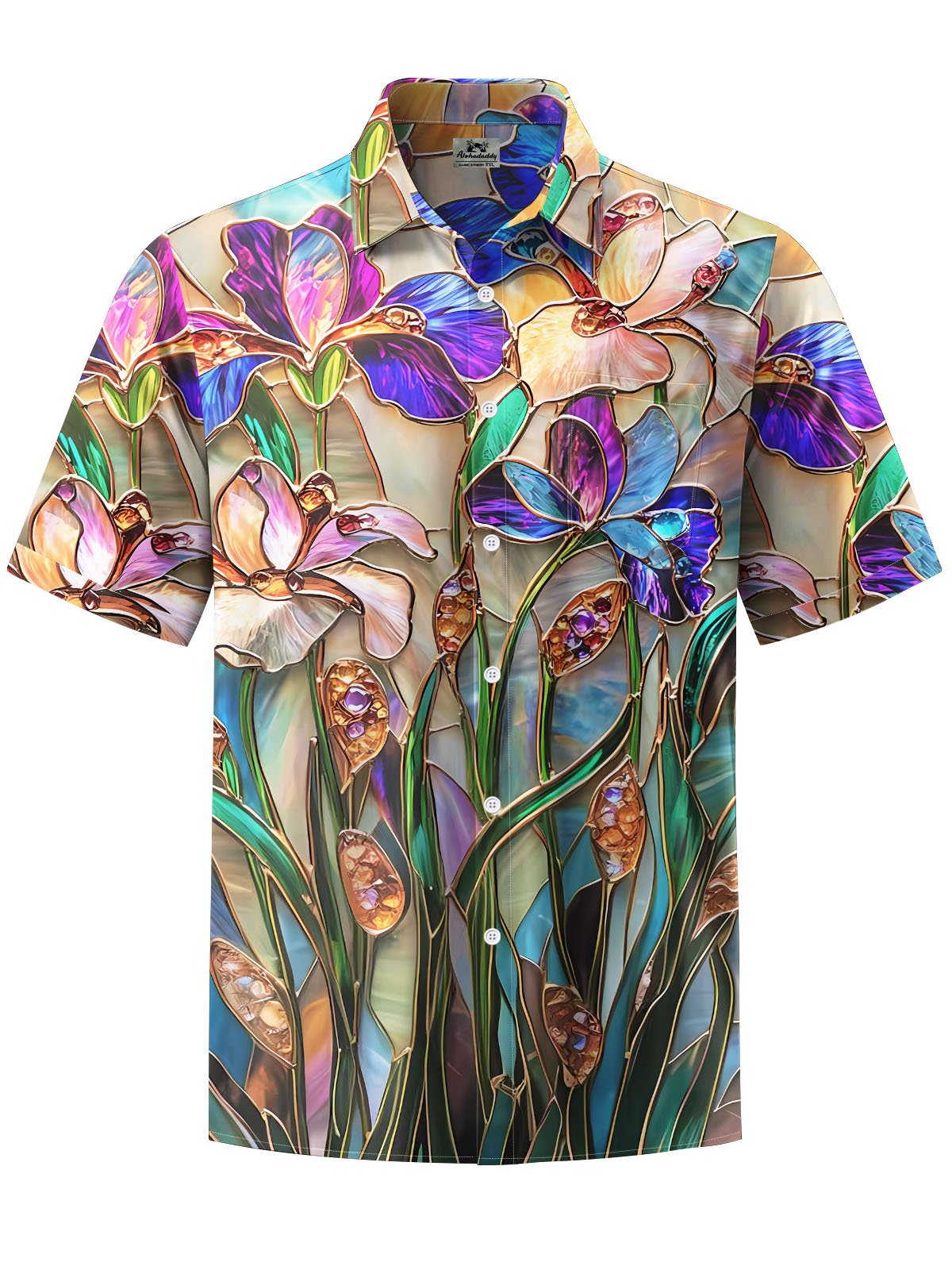 Alohadaddy® Hawaiian Flower Glass Print Chest Pocket Men's Short Sleeve Shirt Big & Tall