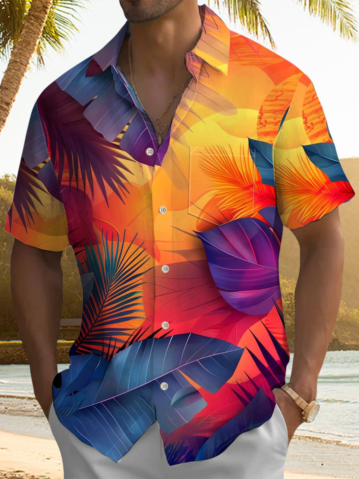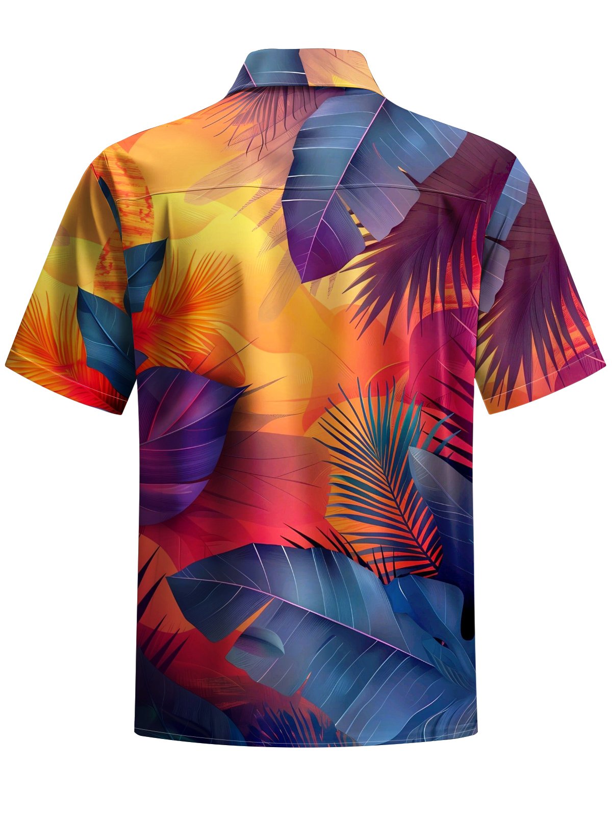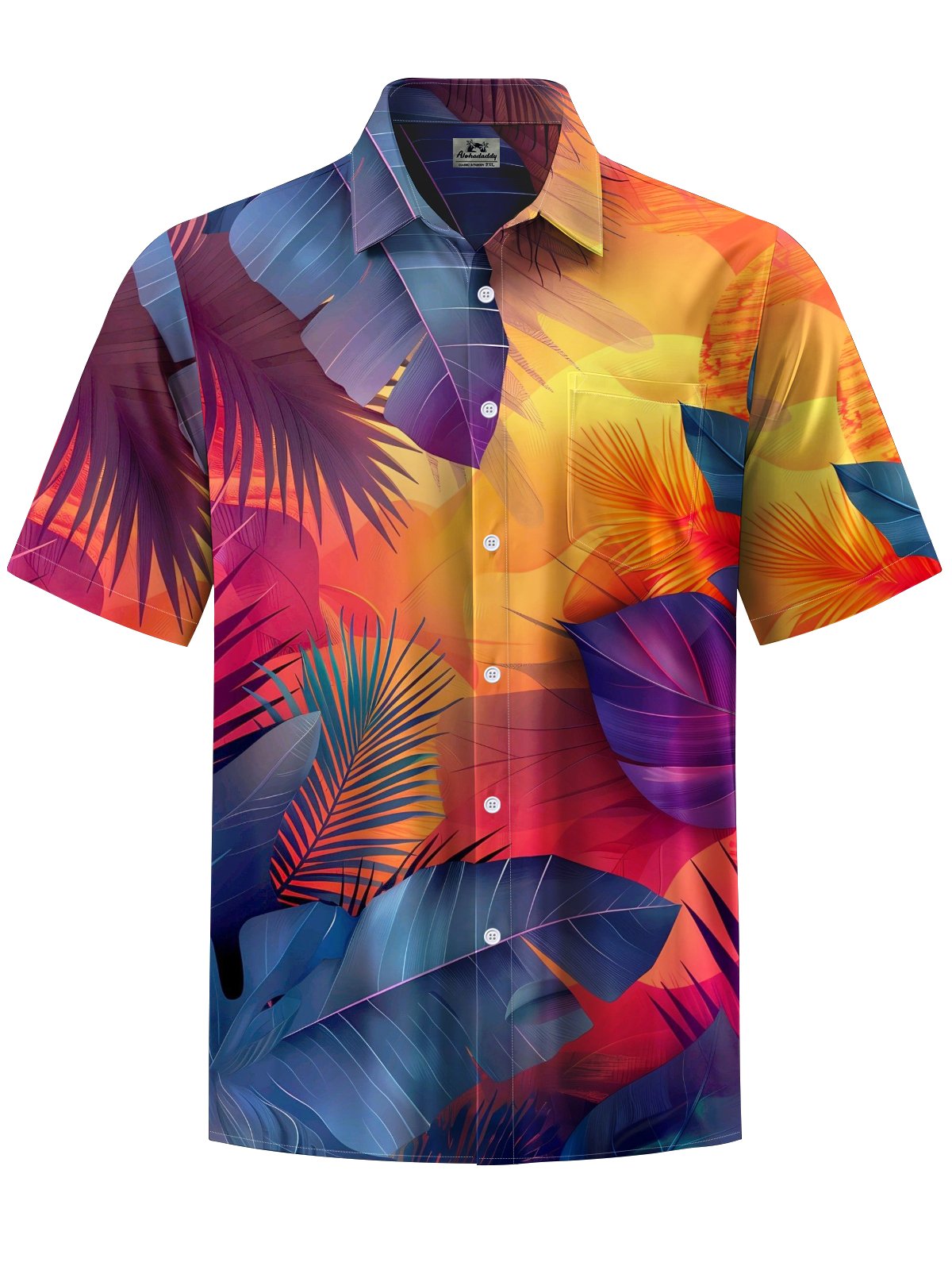 Alohadaddy® Hawaiian Palm Leaf Art Print Chest Pocket Men's Stretch Short Sleeve Ripped Shirt Big & Tall