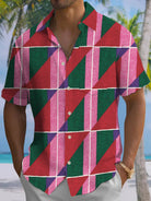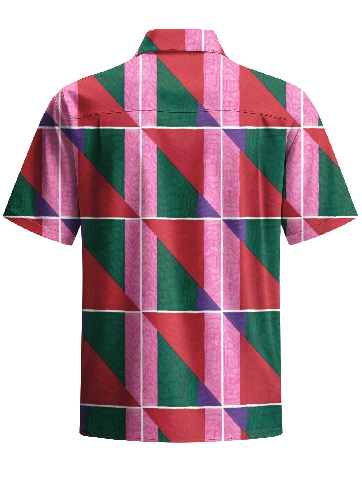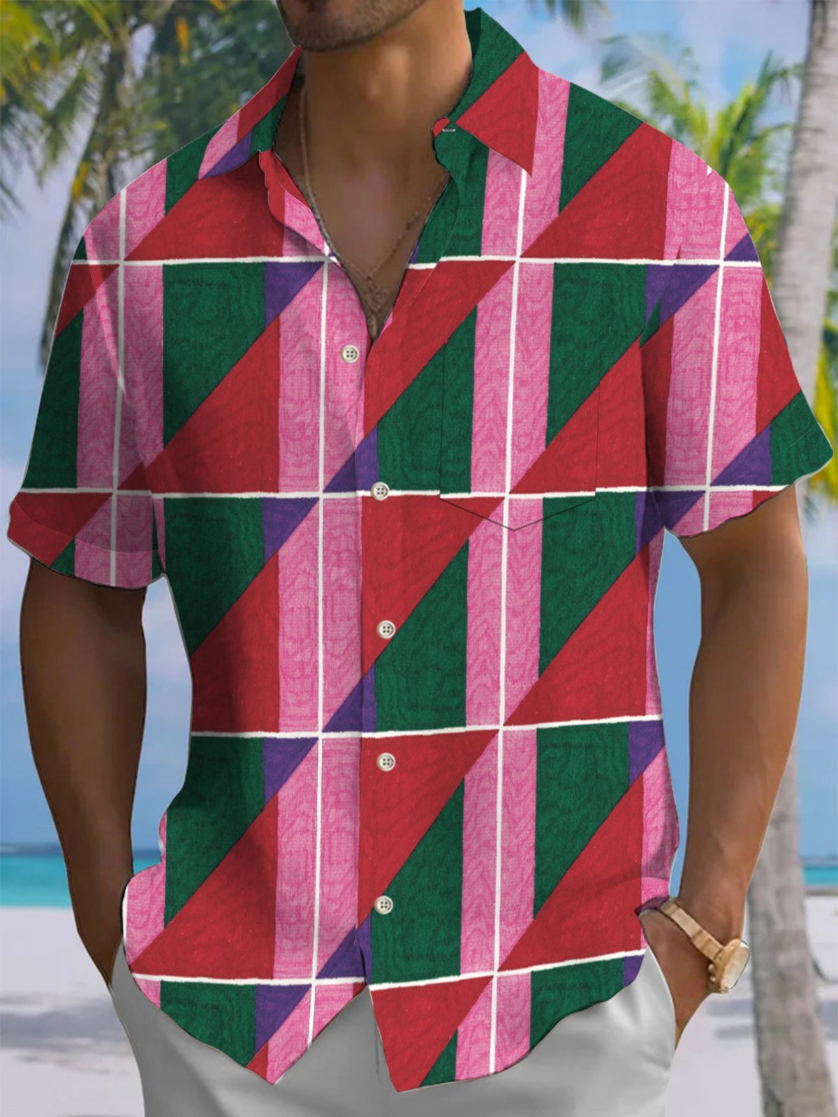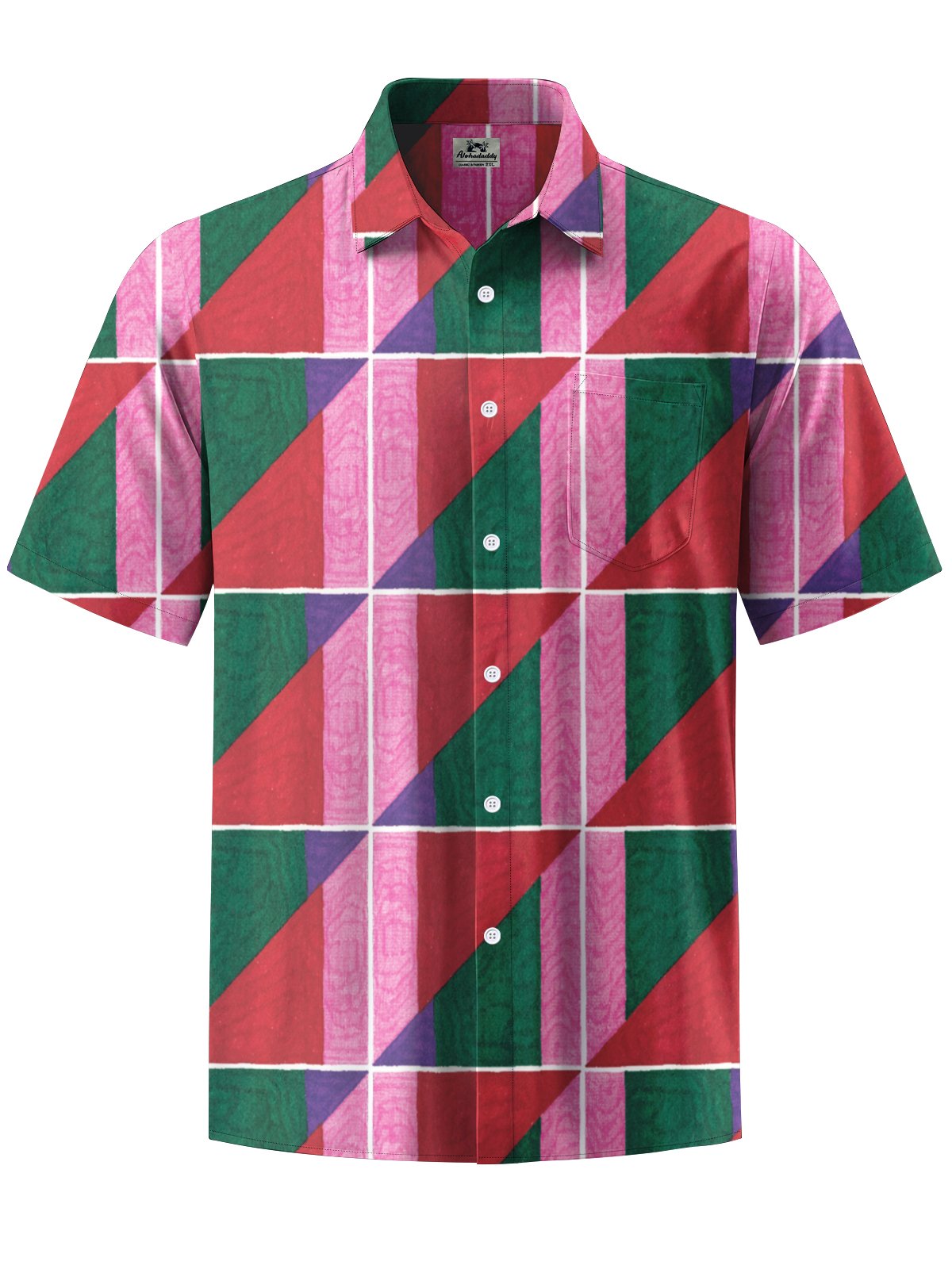 Alohadaddy® Retro Geometric Colorblock Print Art Elastic Pocket Button Men's Short Sleeve Shirt Big & Tall