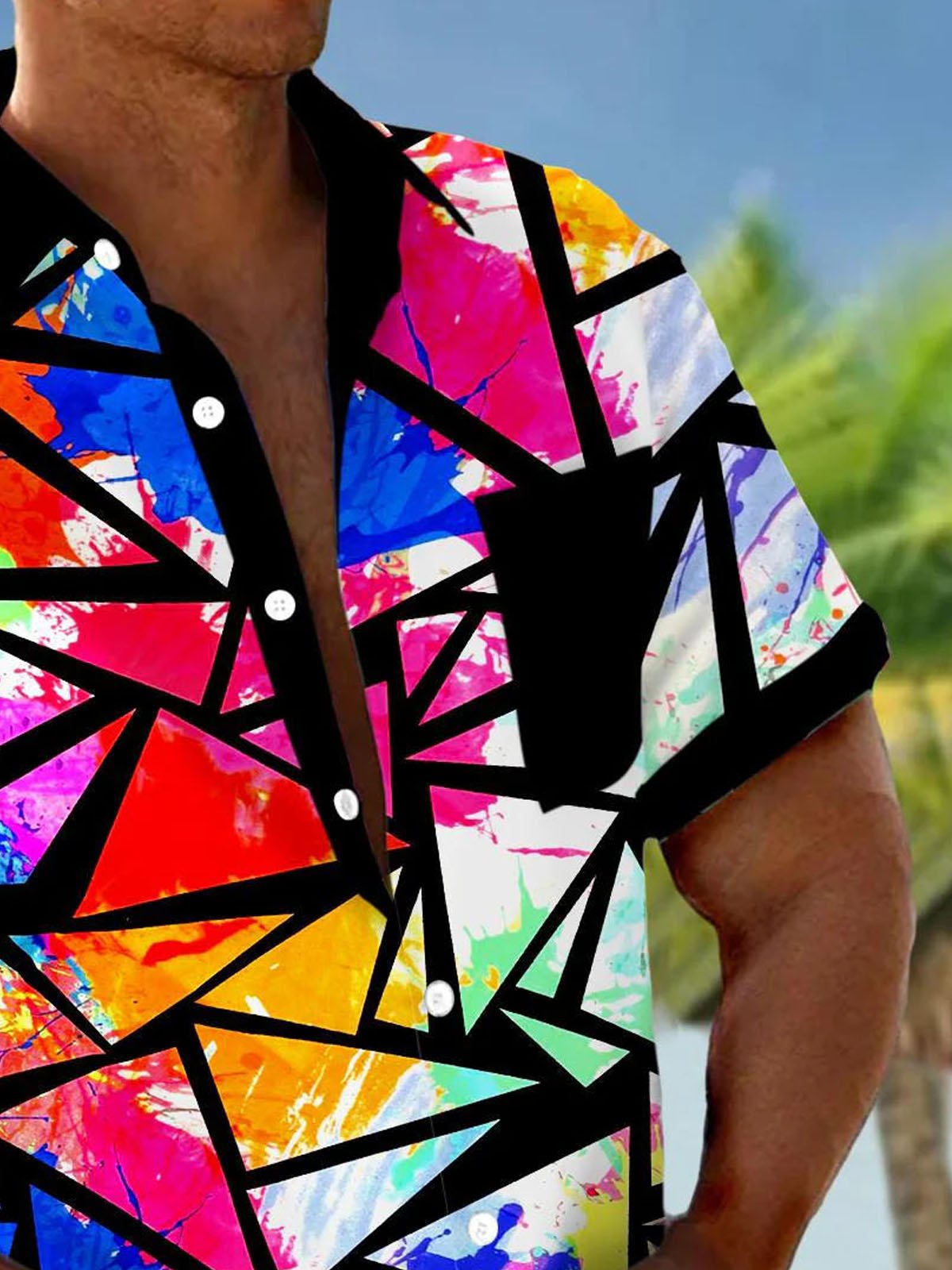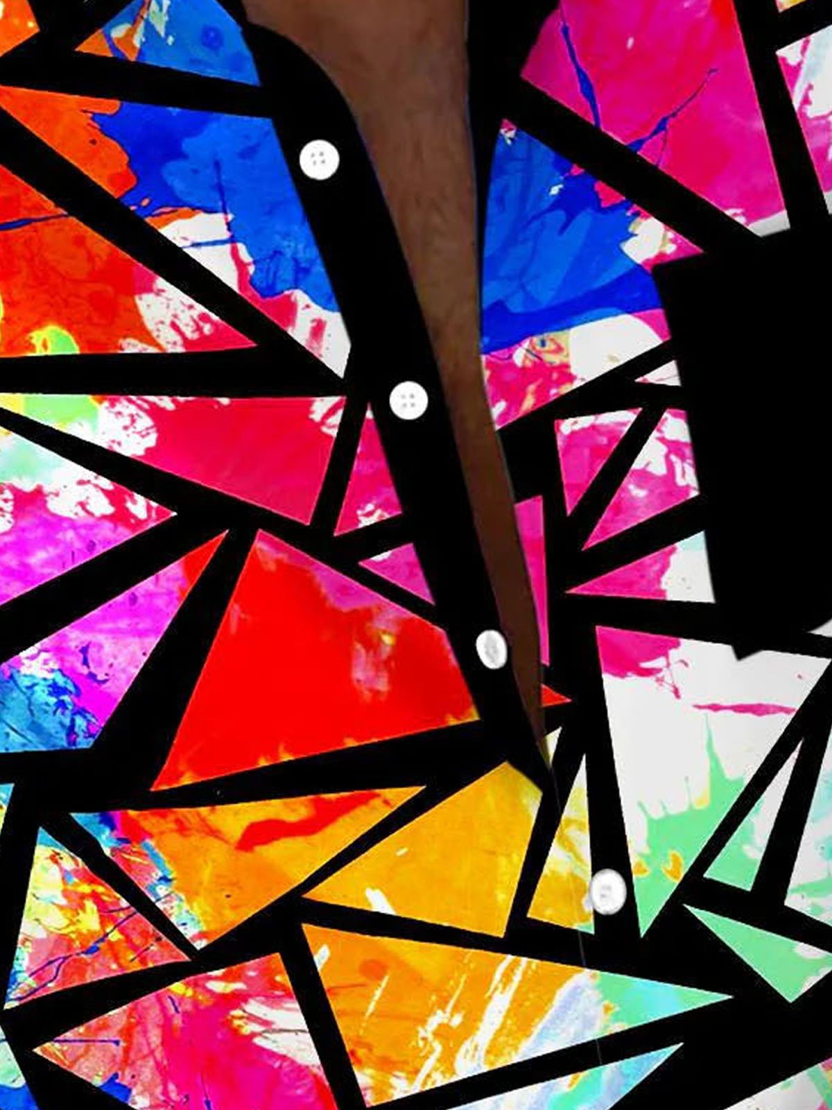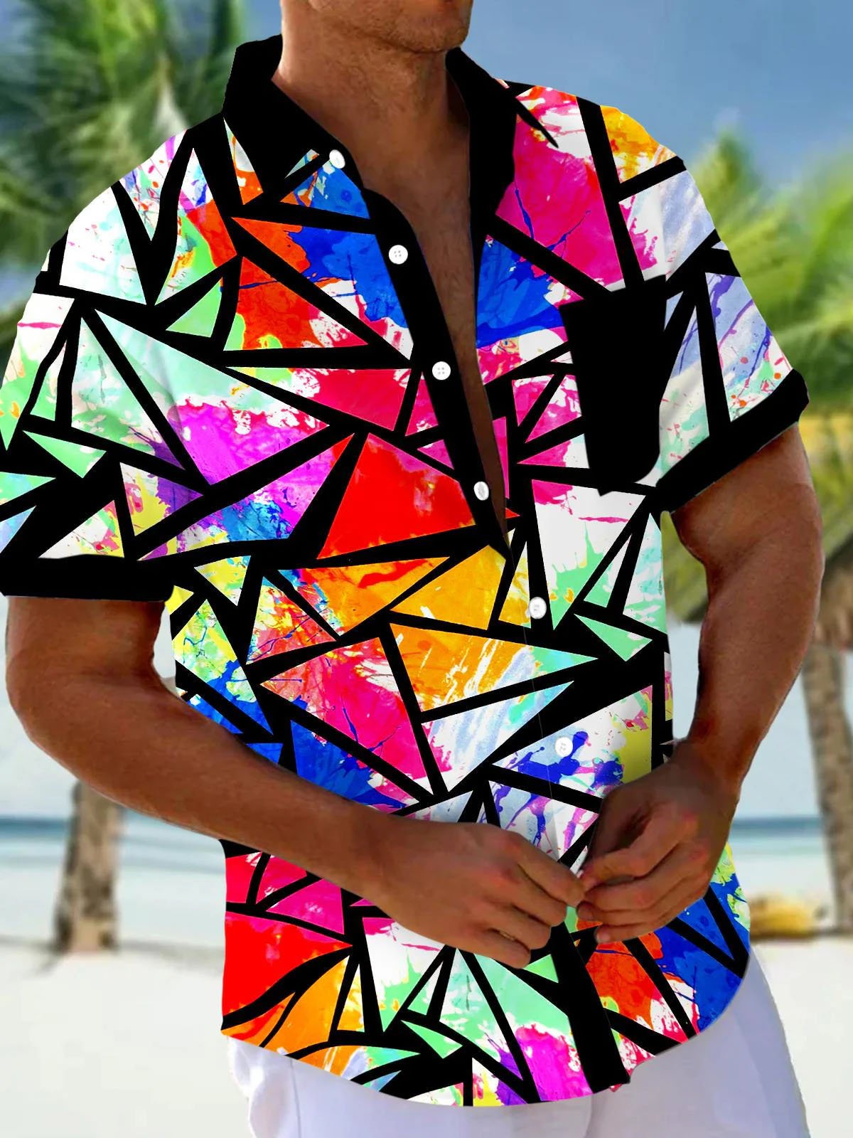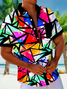 Alohadaddy Retro Geometric Color Block 3D Print Men's Button Pocket Short Sleeve Shirt
