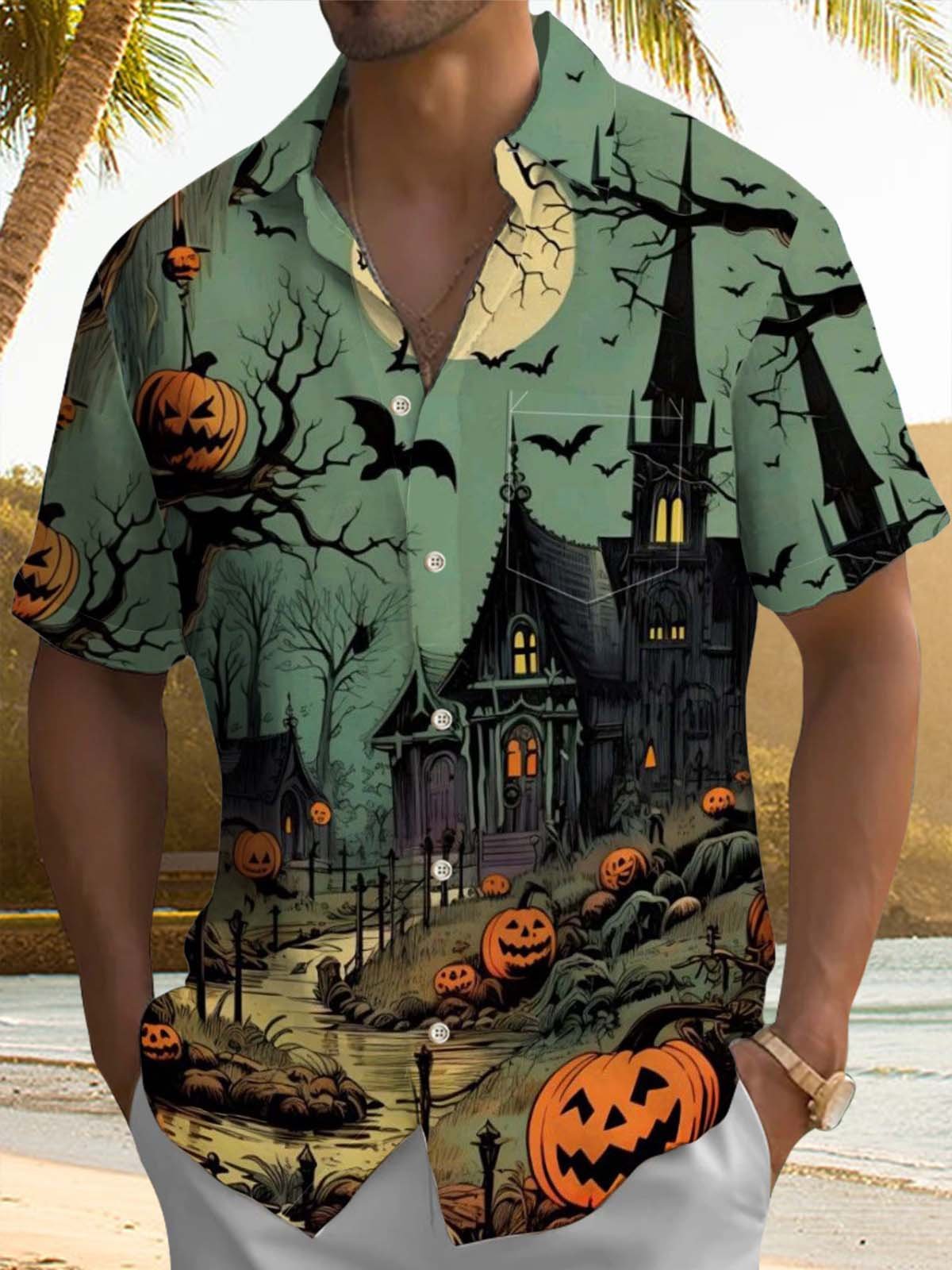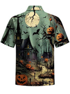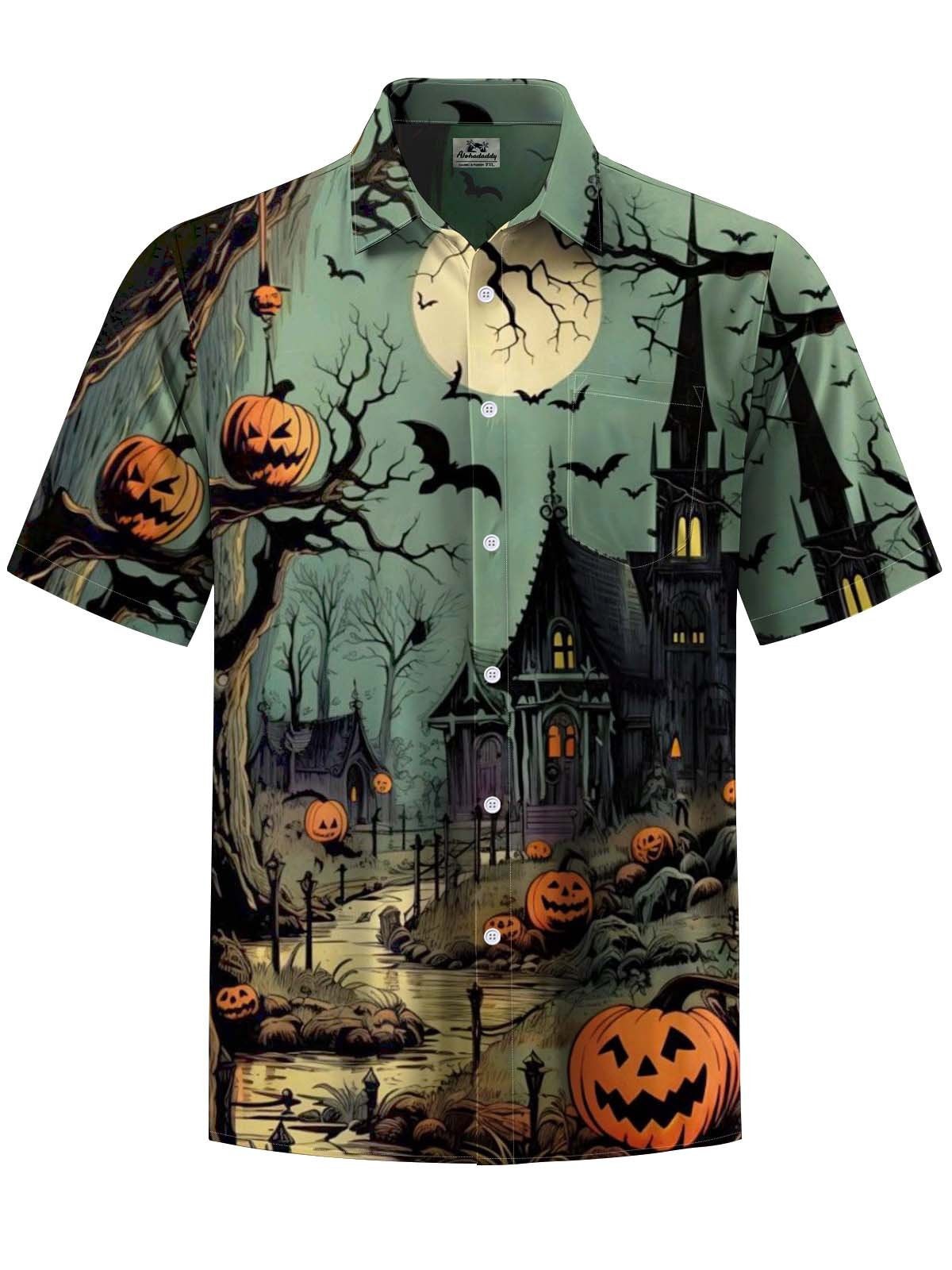Alohadaddy® Halloween Castle Print Art Pocket Elastic Men's Short Sleeve Shirt Big & Tall