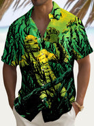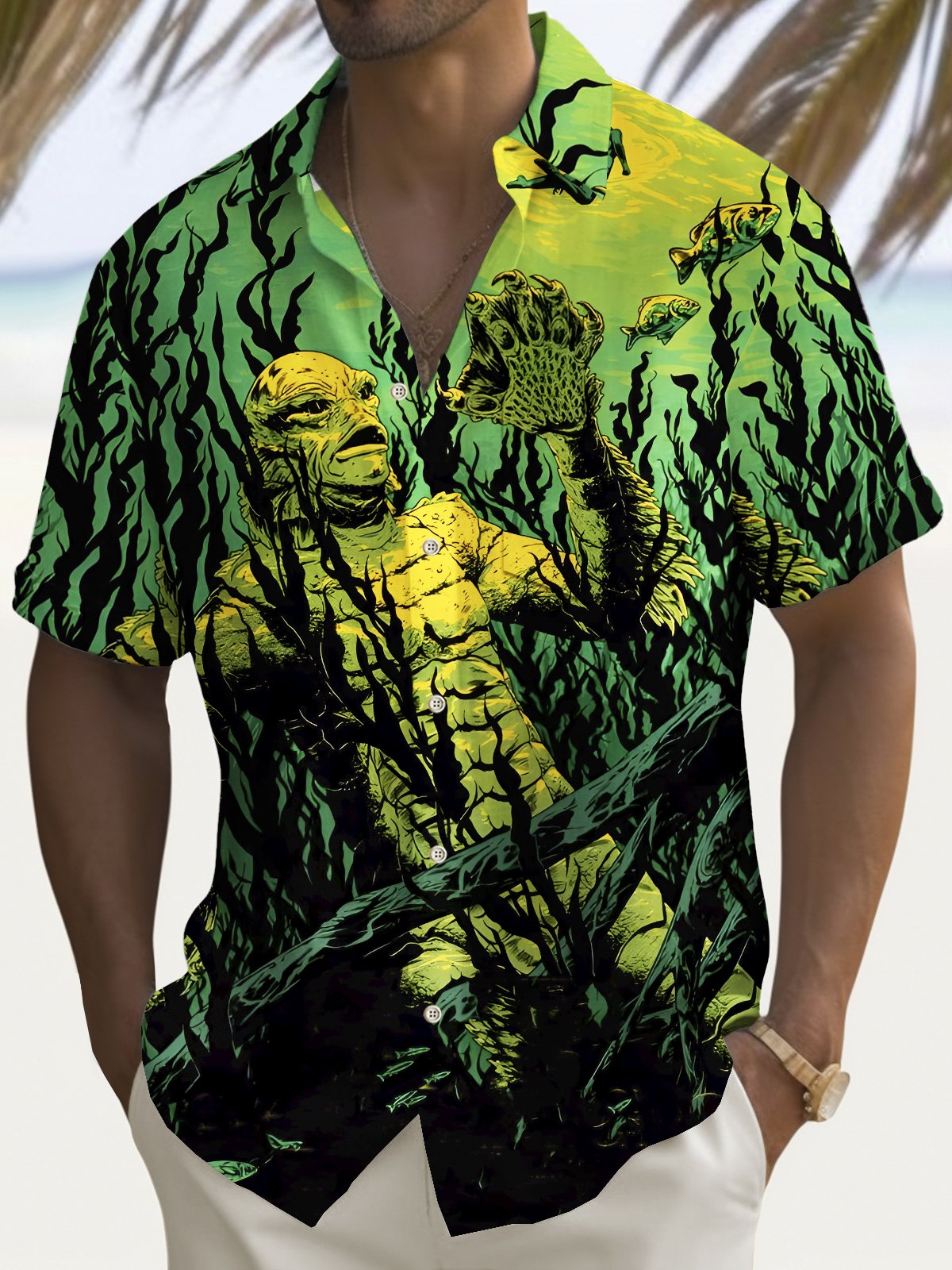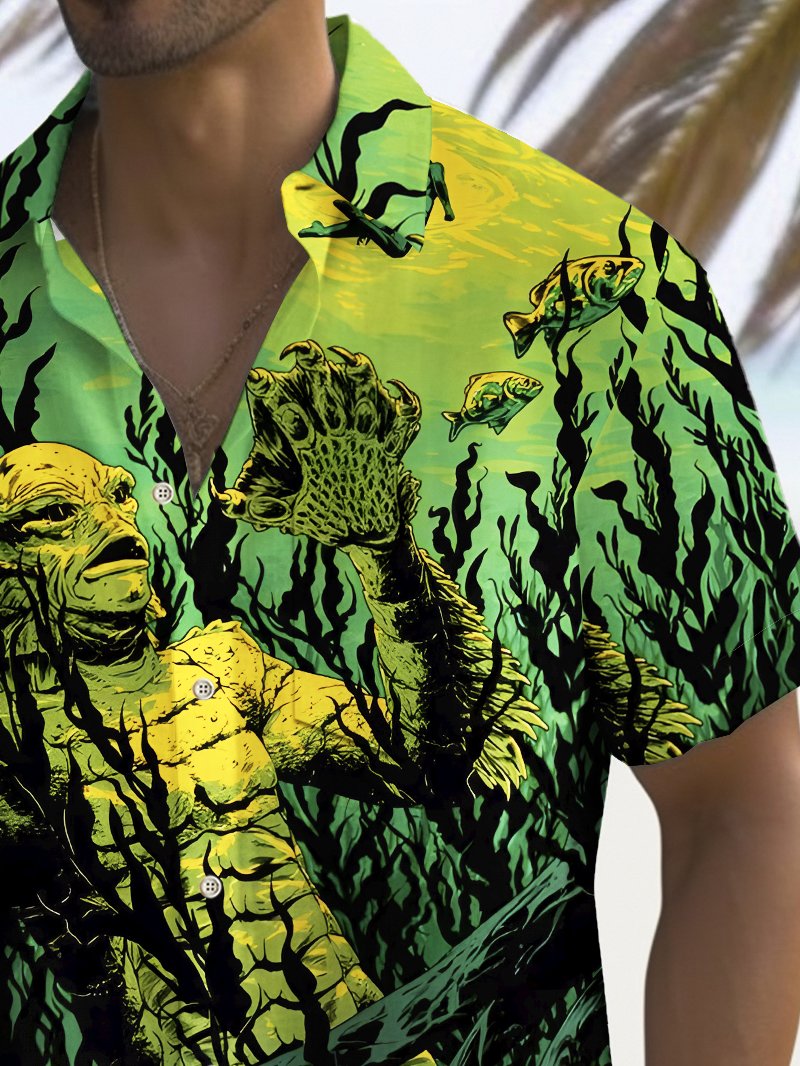 Alohadaddy Halloween Monster Print Men's Chest Pocket Stretch Shirt Big Tall