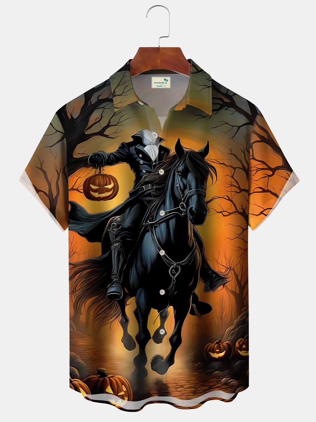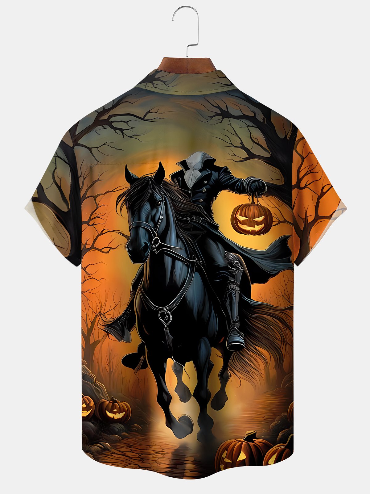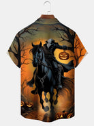 Alohadaddy Halloween Pumpkin Ghost Rider 3D Digital Print Men's Button Pocket Short Sleeve Shirt