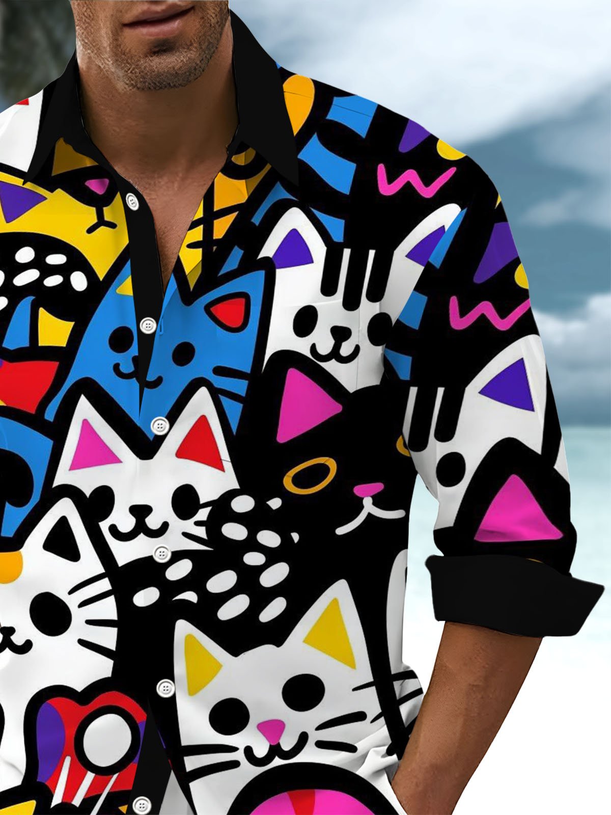 Alohadaddy® Vintage Graffiti Cat Cartoon Print Art Pocket Stretch Men's Long Sleeve Shirt Big & Tall