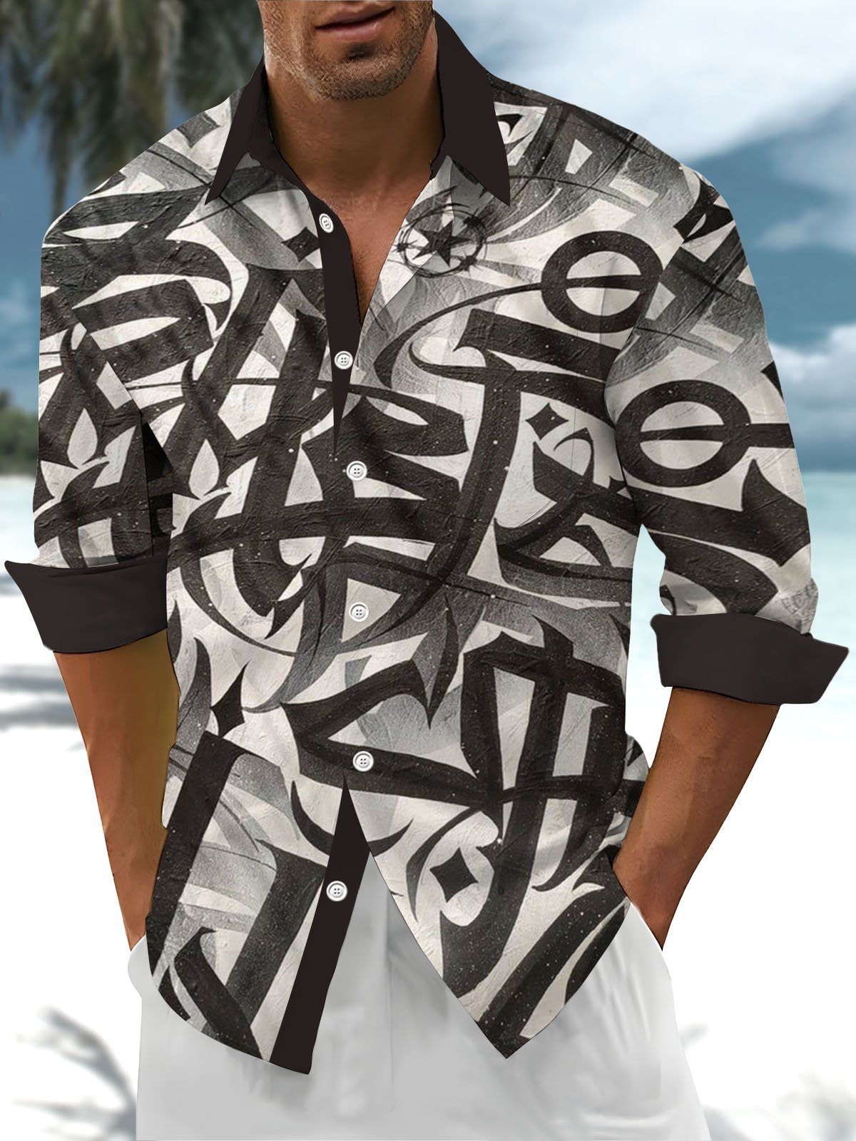 Alohadaddy® Vintage Graffiti Print Art Pocket Stretch Men's Long Sleeve Shirt Big & Tall