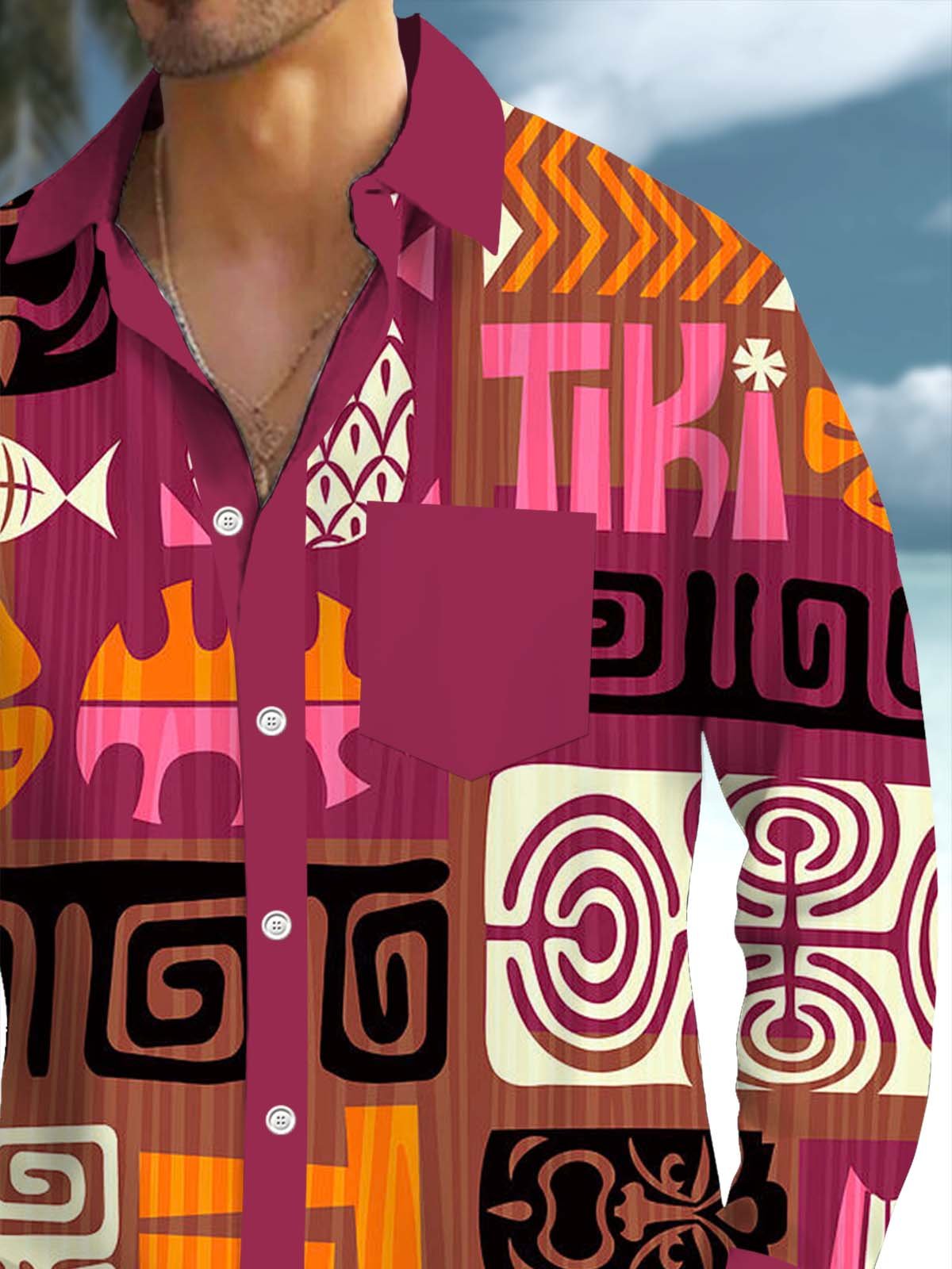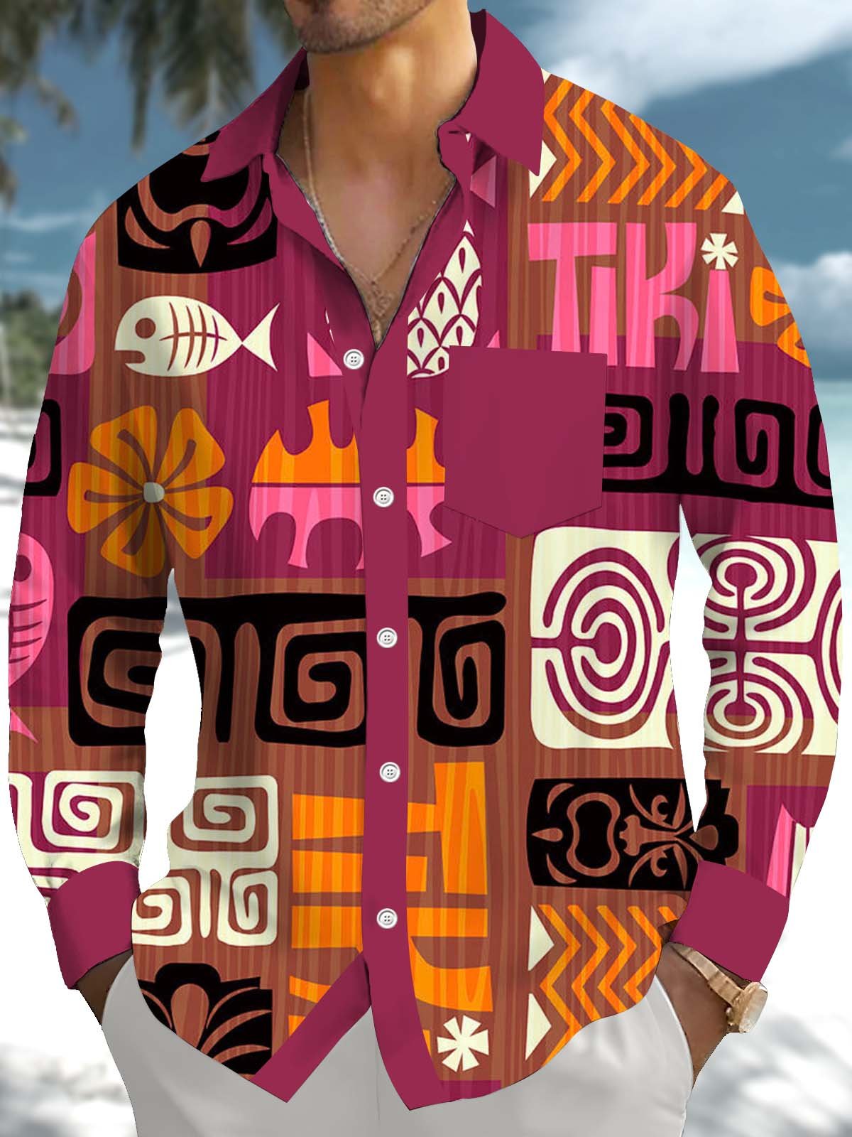 Alohadaddy® Vintage Tiki Print Art Pocket Stretch Men's Long Sleeve Shirt Big & Tall