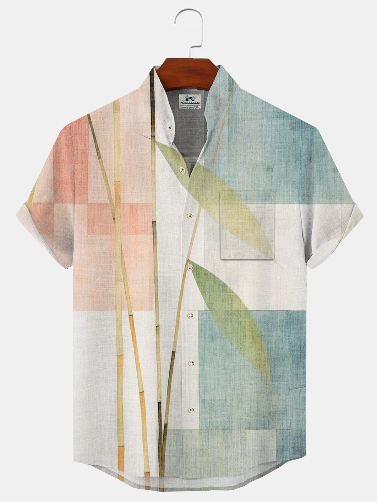 Alohadaddy Geometric Colorblock Plant Button Pocket Casual Short Sleeve Stand Collar Shirt