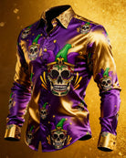 Alohadaddy® Retro Holiday Carnival Skull Print Button-Down Long-Sleeve Vacation Shirt