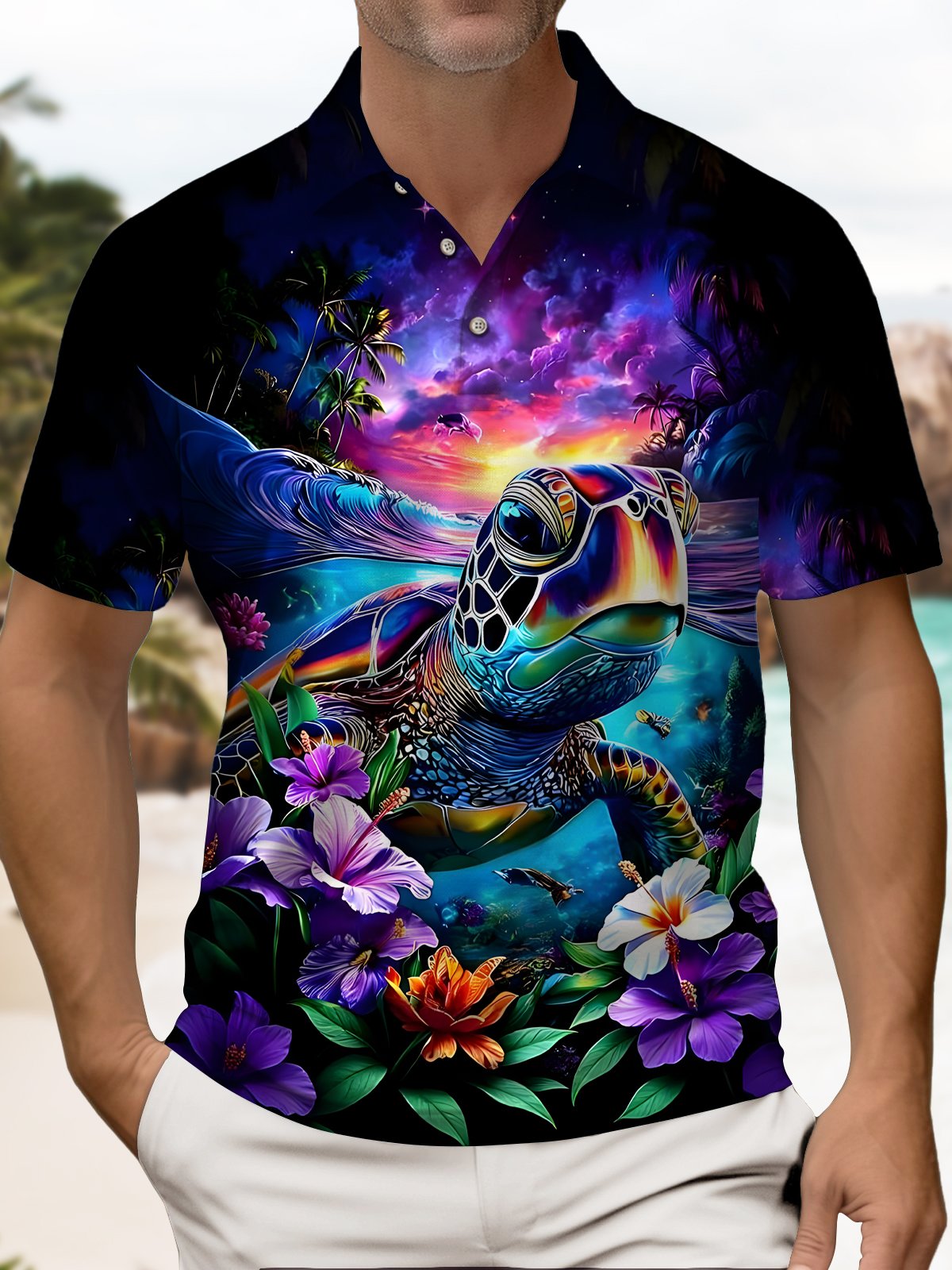 Alohadaddy® Hawaiian Abstract Turtle and Floral Short-Sleeved Polo Shirt