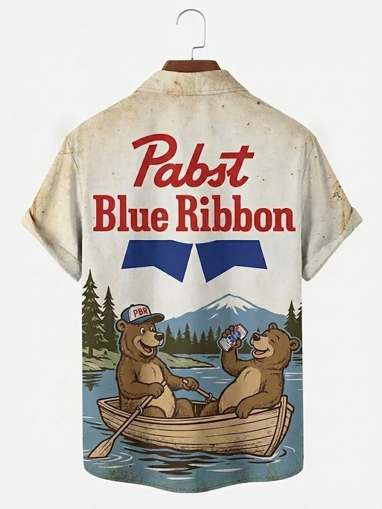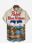 Alohadaddy® Retro Fun Cartoon Bear Beer Print Men's Button-Down Short-Sleeve Shirt Big & Tall