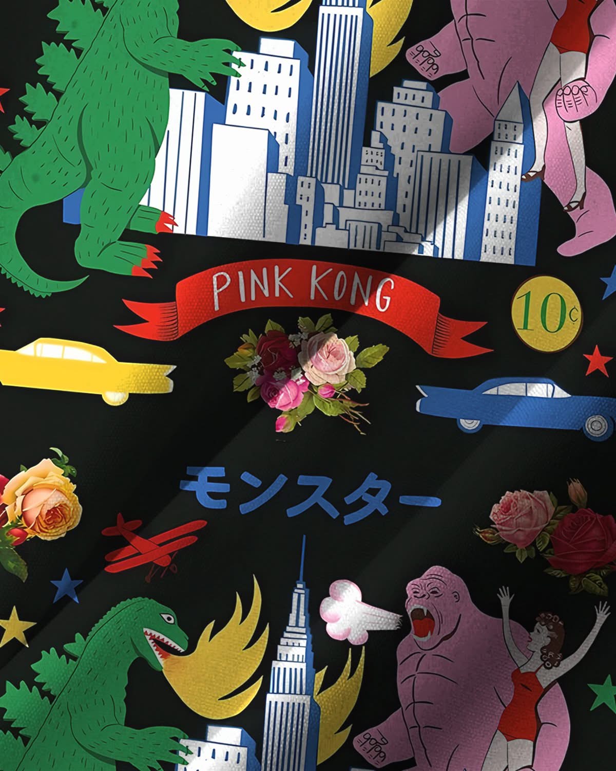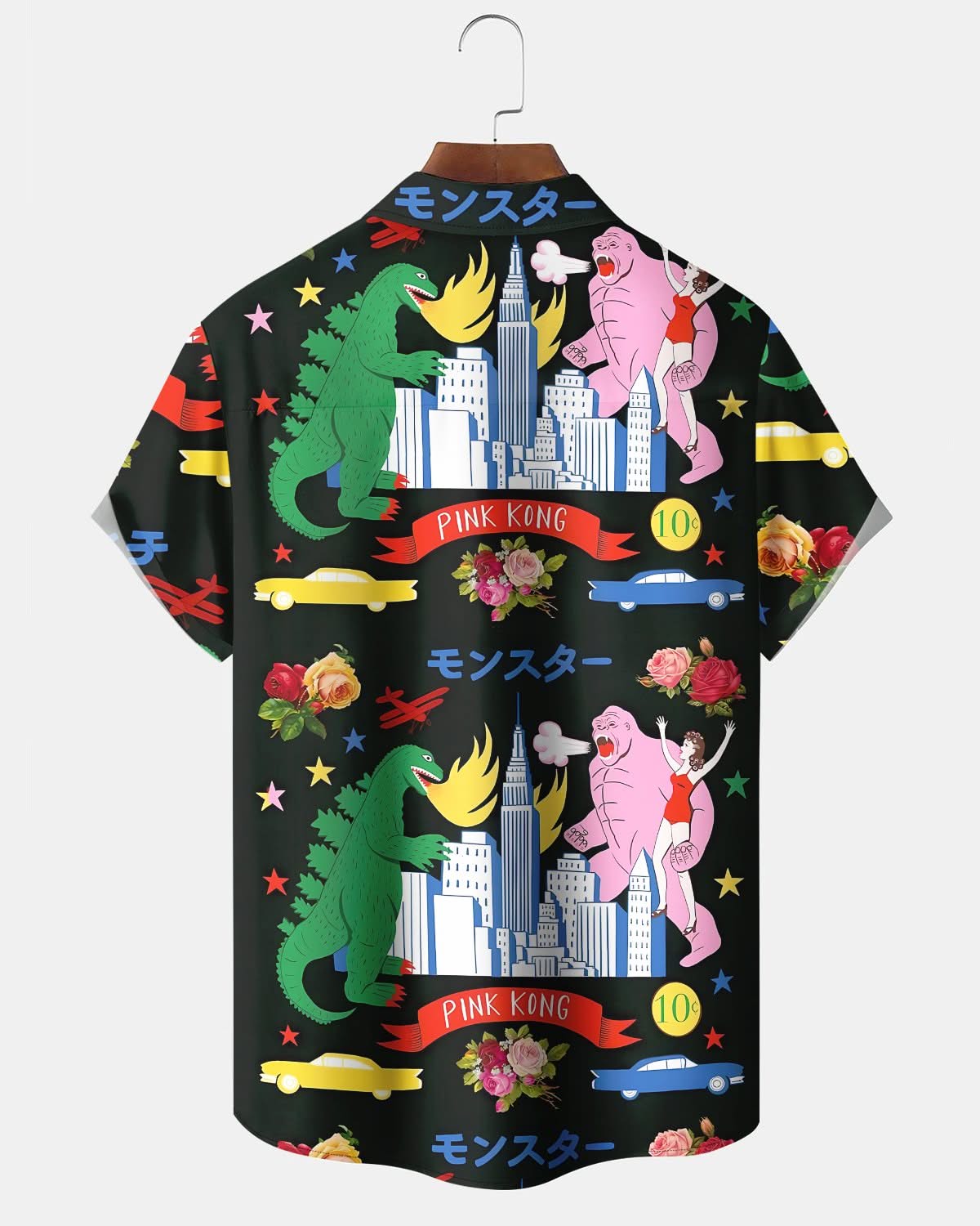 Alohadaddy® Retro Godzilla Geometric Cartoon Print Art Pocket Button Men's Short Sleeve Shirt Big & Tall