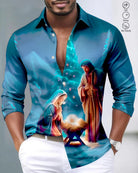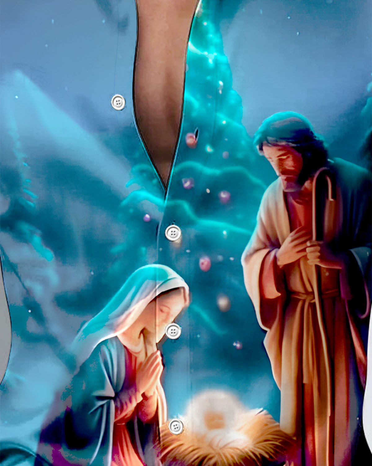 Alohadaddy® Satin Glossy Christmas Jesus and Leaf Print Button-Up Stretch Men's Long-Sleeve Shirt Big & Tall