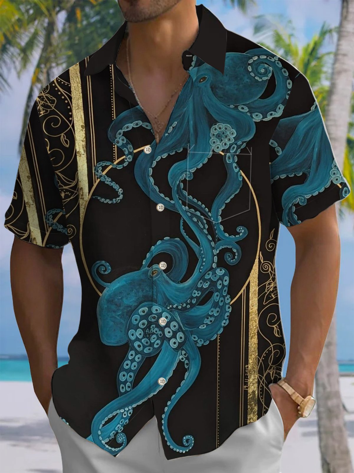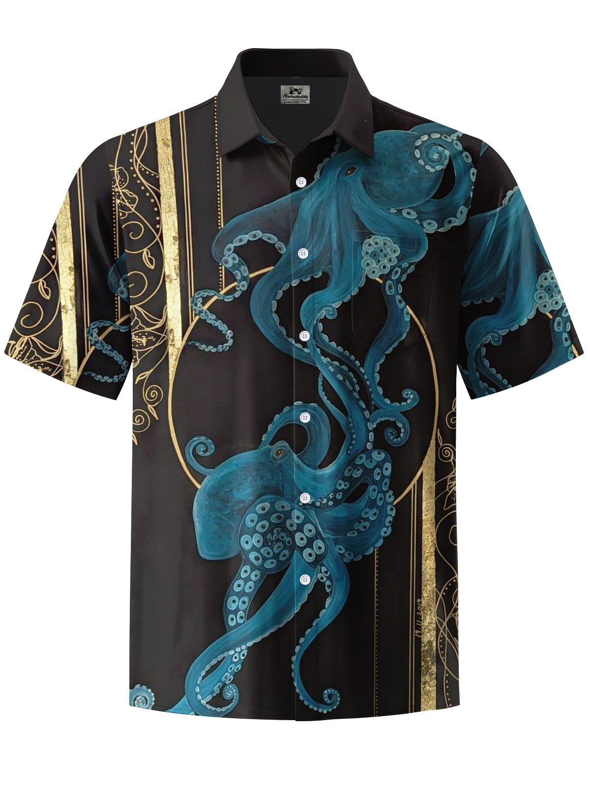 Alohadaddy® Casual Octopus Stripe Art Print Chest Pocket Mens Short Sleeve Shirt Big & Tall