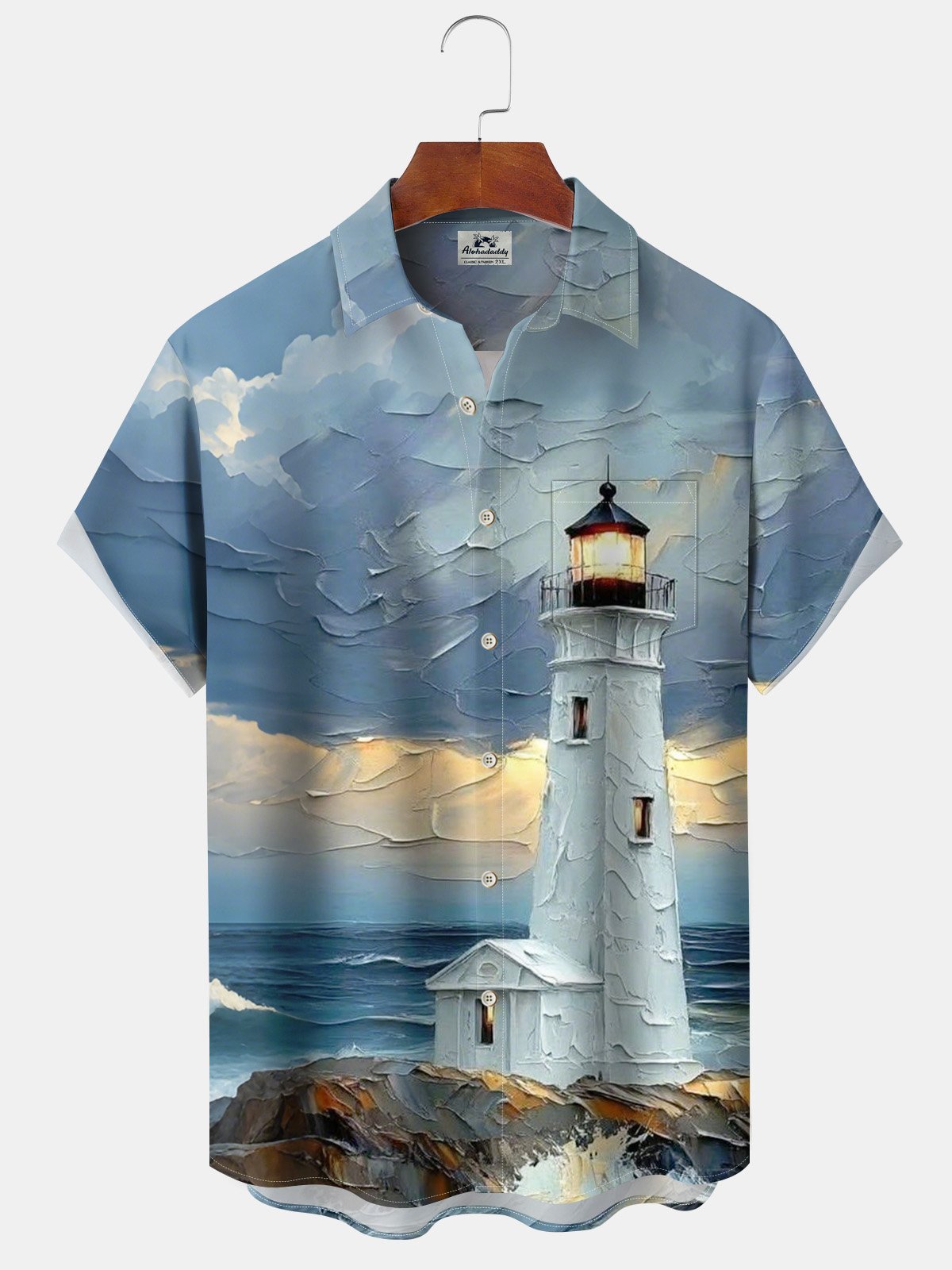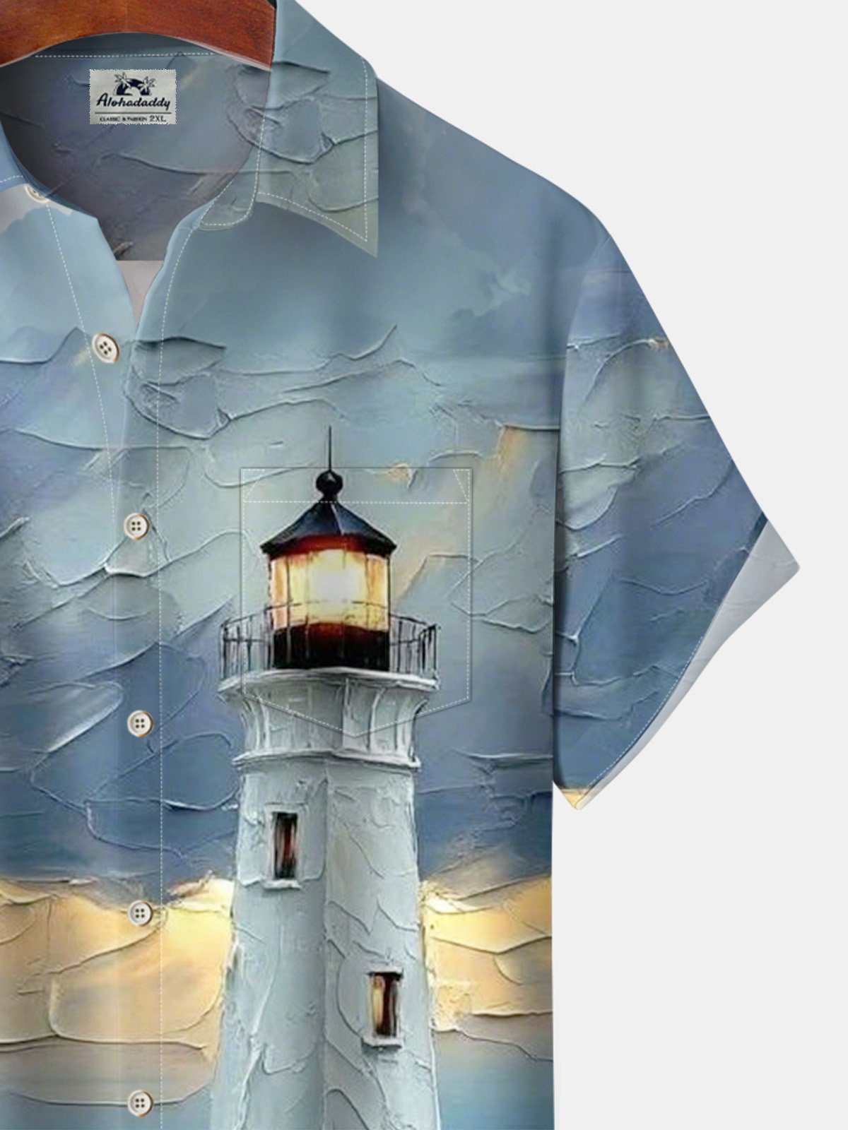Alohadaddy® Casual Seaside Lighthouse Print Art Pockets Moisture Wicking Hawaiian Shirt Big & Tall