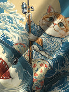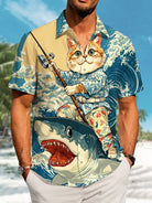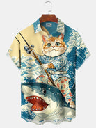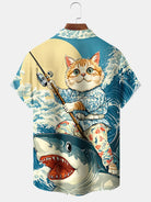 Alohadaddy Casual Ukiyo-e Cat Shark Print Art Pocket Button Elastic Oversized Shirt